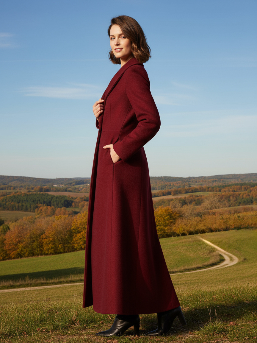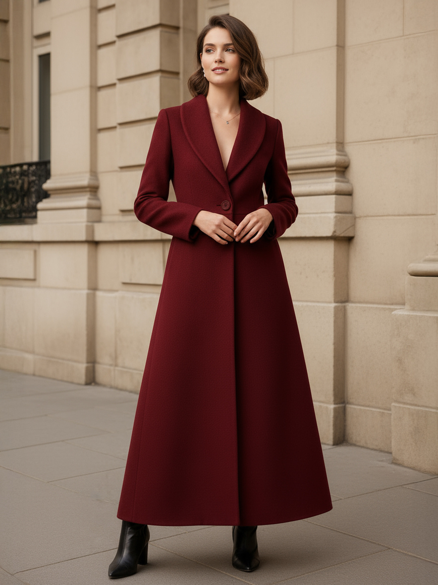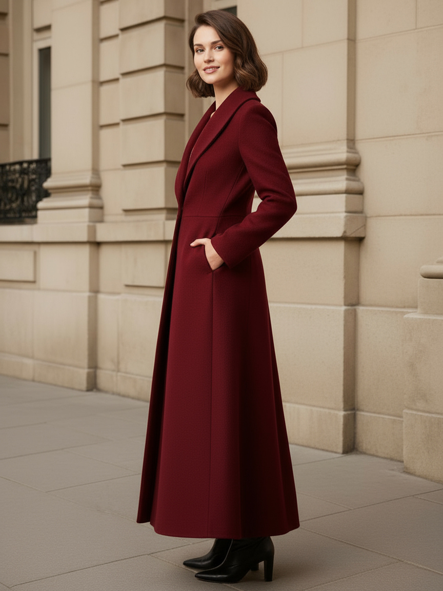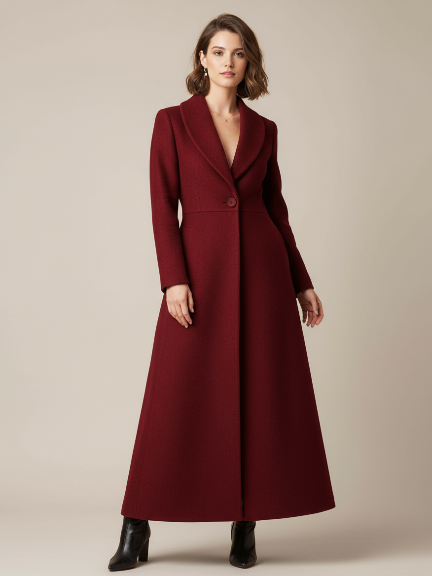 ショールカラーのフルレングスウールコート(Aライン、Vネック、レディース)2025
