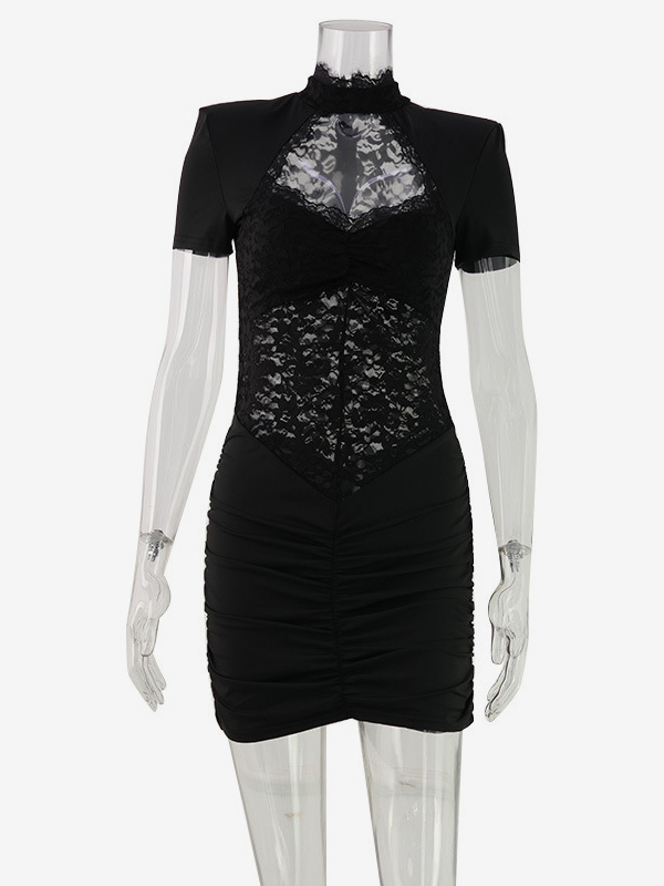 シースルーレースカットアウトボディコンドレス(女性用) - ブラックゴシックシックギャザーミニシースドレス - 夏の夜のパーティーに最適 2026