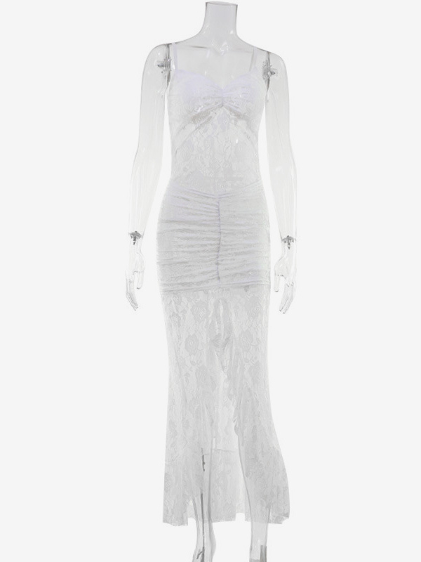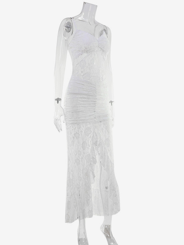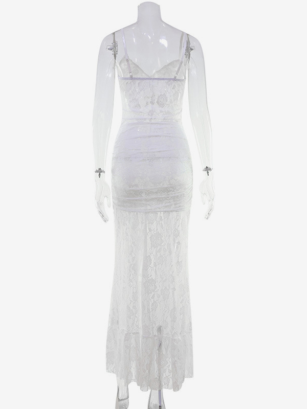 シースルーレースフリルマキシスリップドレス(レディース) - ホワイト セクシー ハイローヘム スパゲッティストラップ ボディコンガウン - サマーガラパーティー 2026