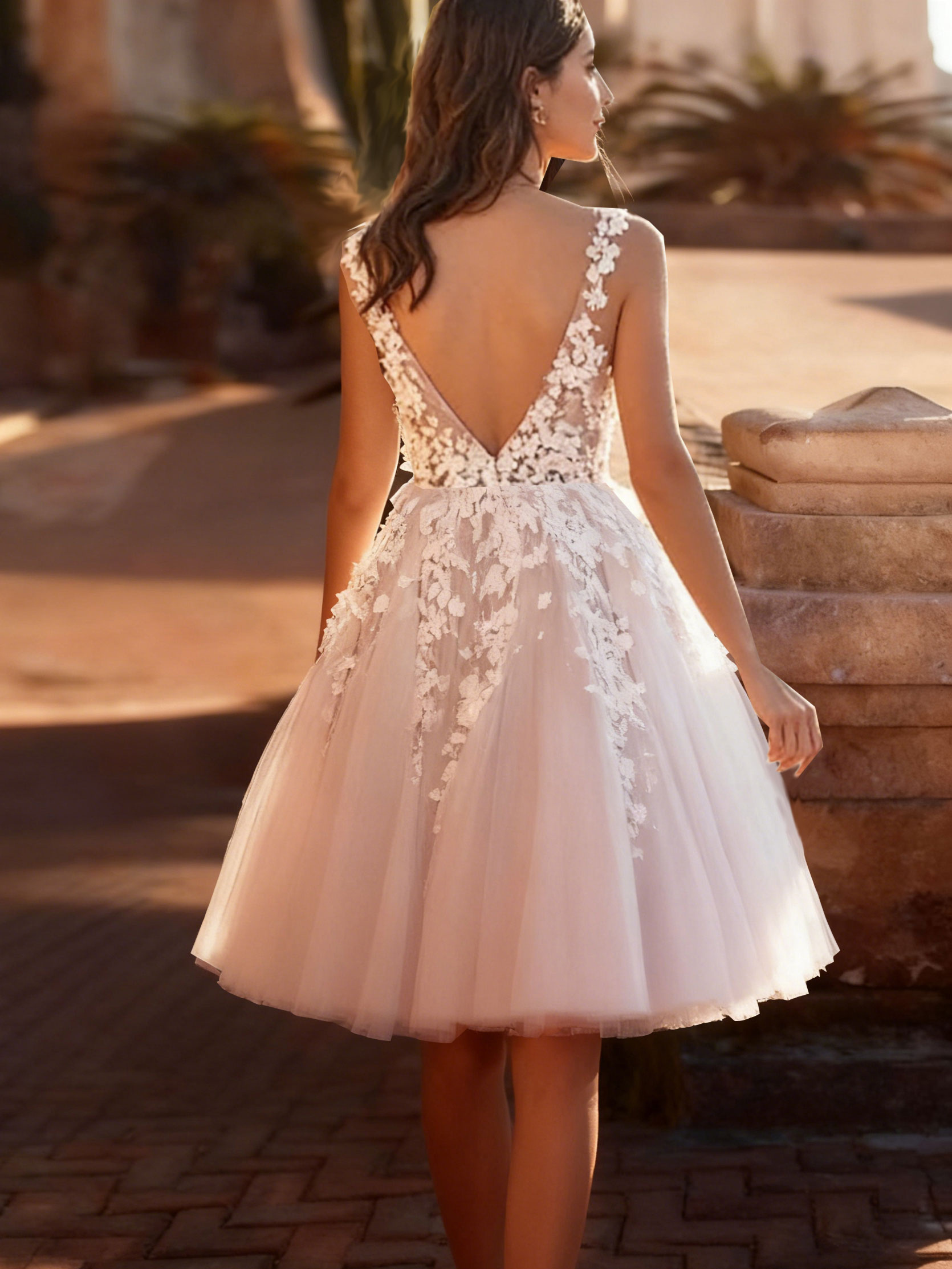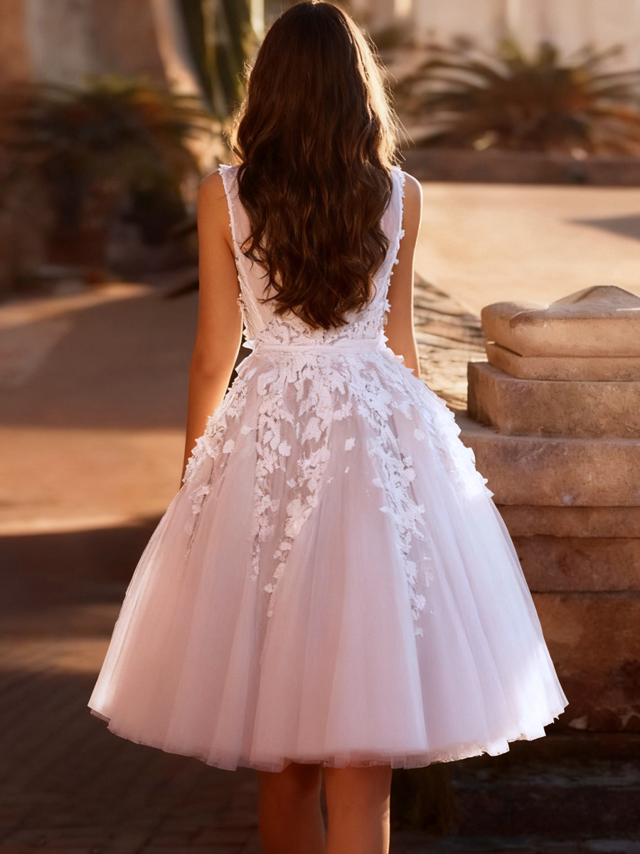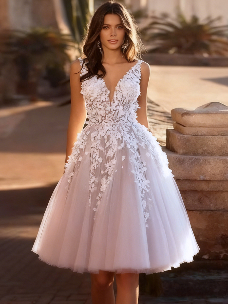 ショート丈ウェディングドレス 膝丈 Vネック ノースリーブ Aライン ナチュラルウエスト チュール ブライダルドレス