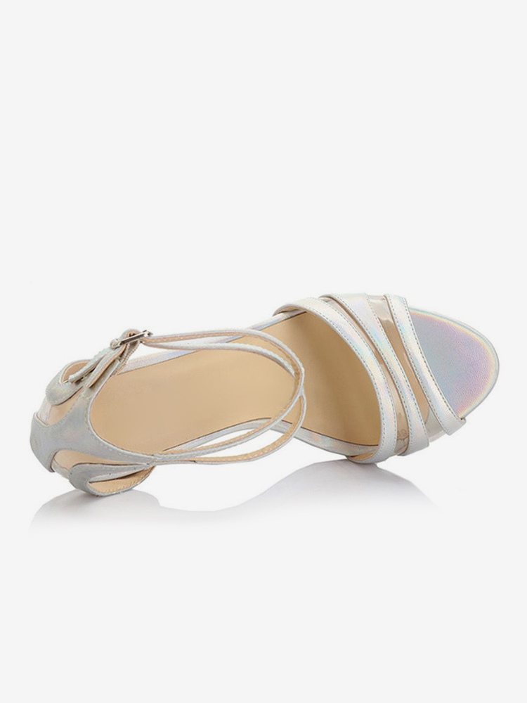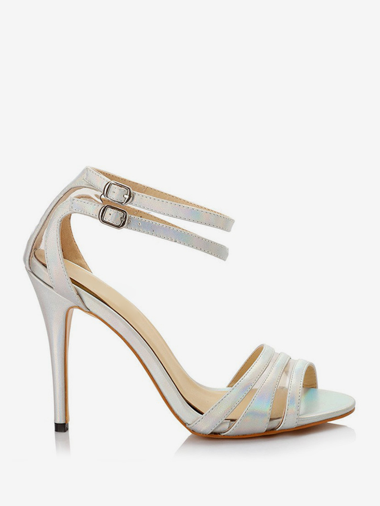 シルバーハイヒールサンダル レディース オープントゥ アンクルストラップ ブライダルシューズ