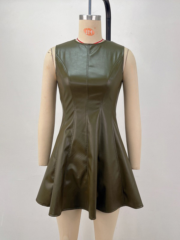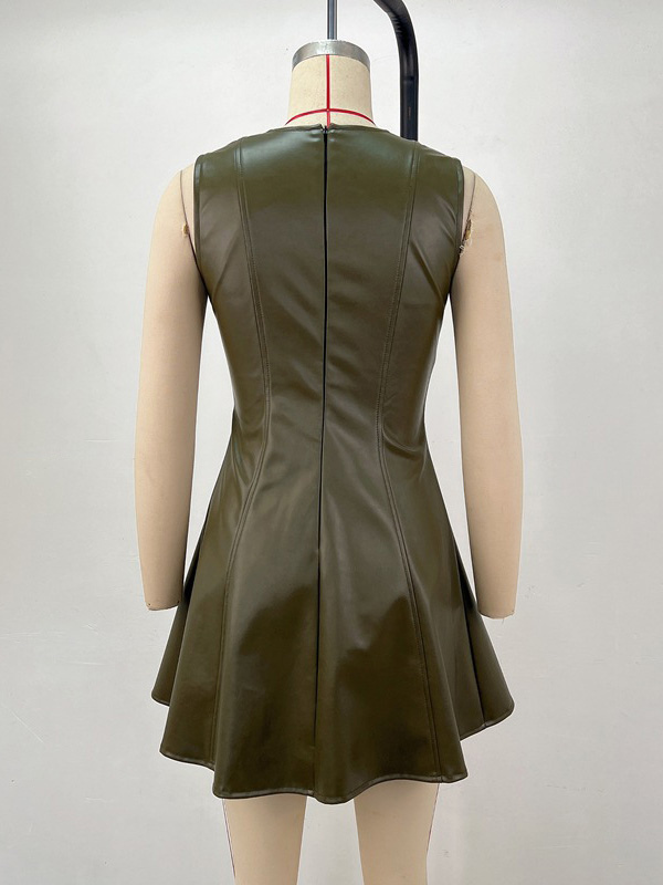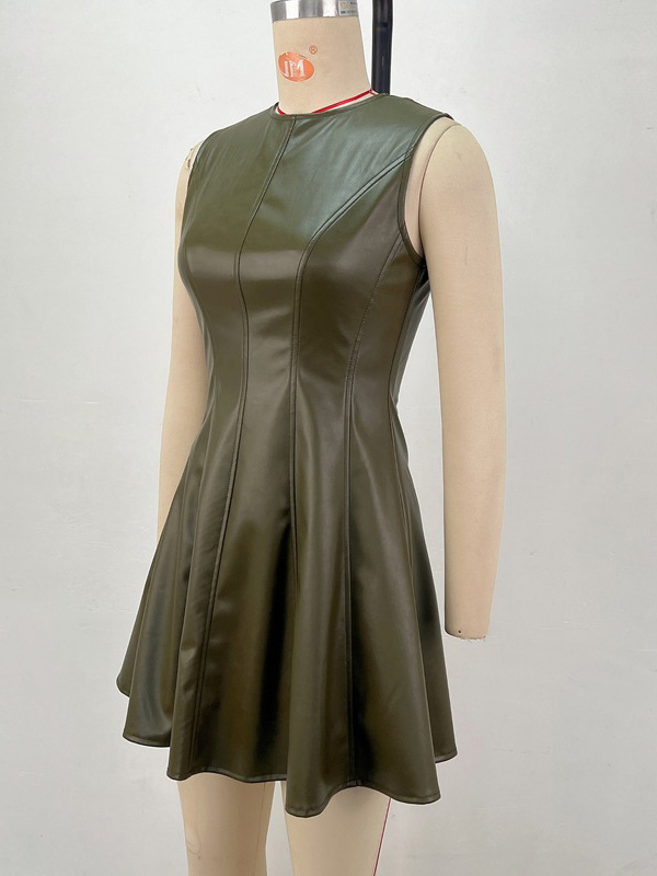 ノースリーブ オリーブ フェイクレザー パネル プリーツ フィット&フレア ミニドレス レディース 2026