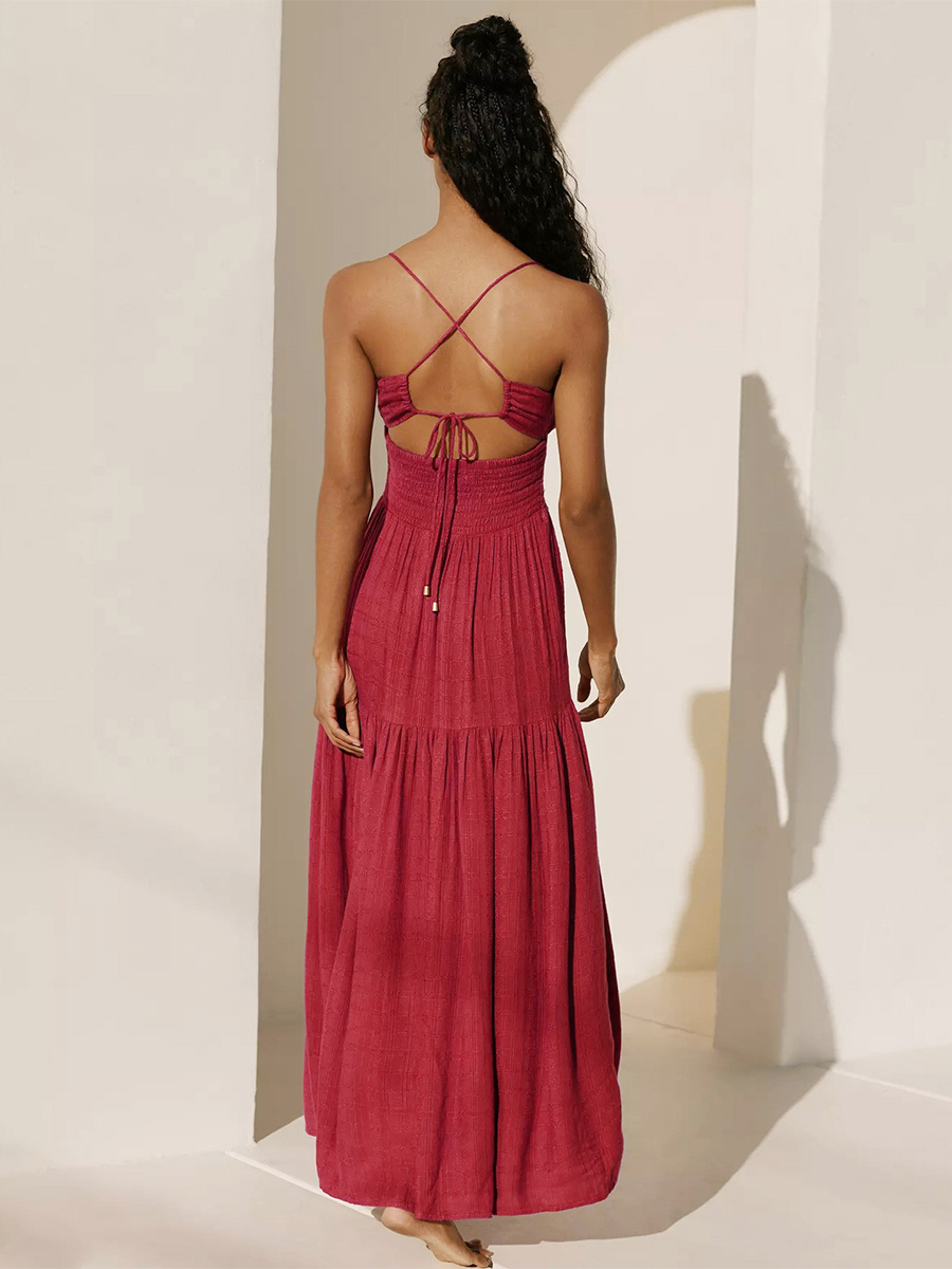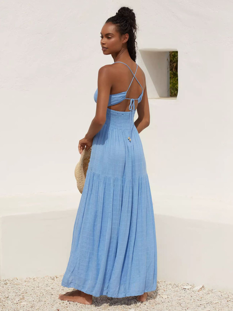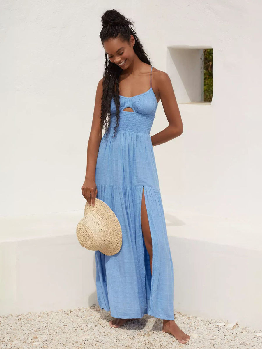 スモックバックレスマキシスリップドレス(女性用) - ボヘミアンカットアウトフロントハイスリットサマードレス - 2026年夏のビーチバケーション