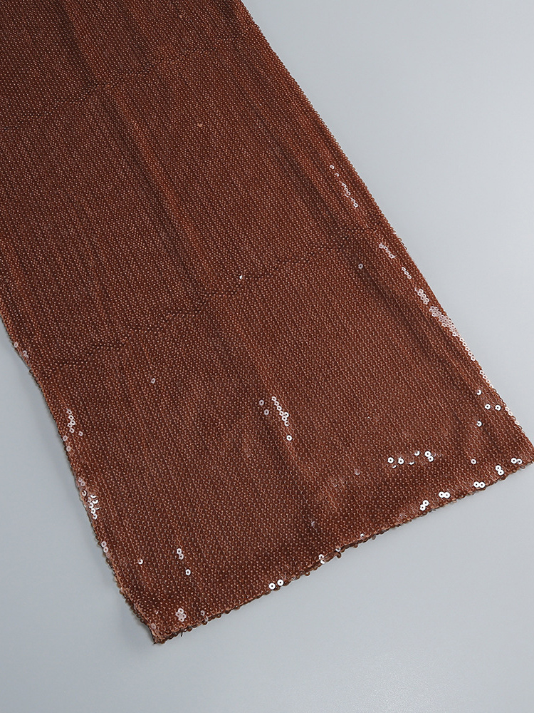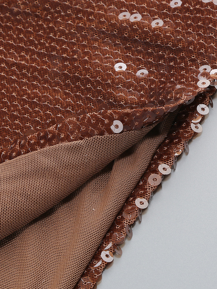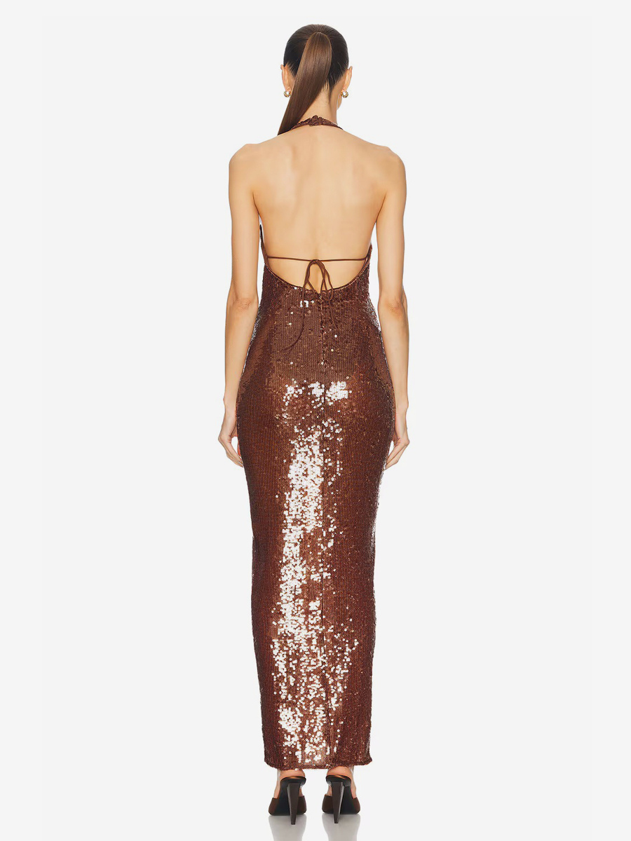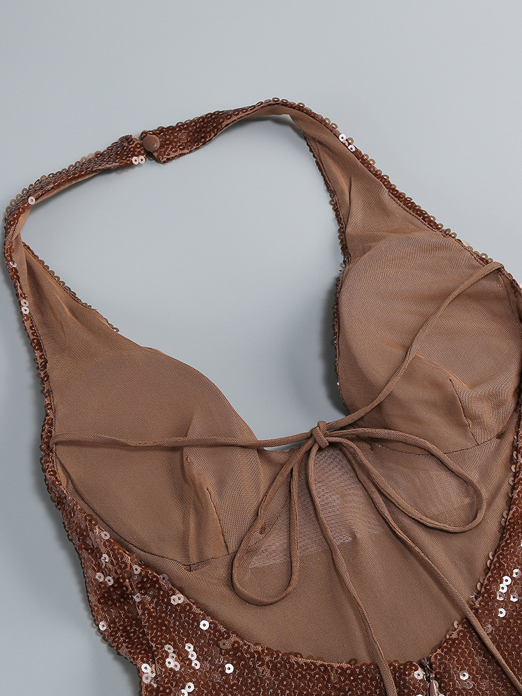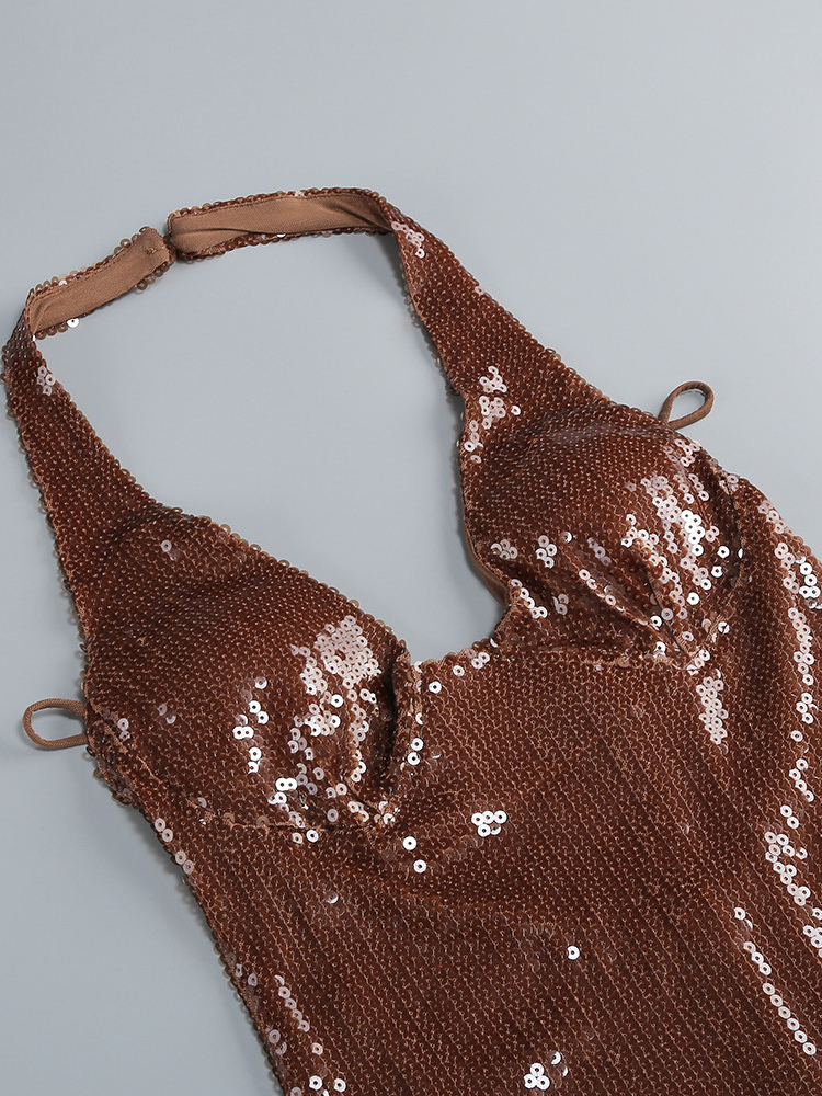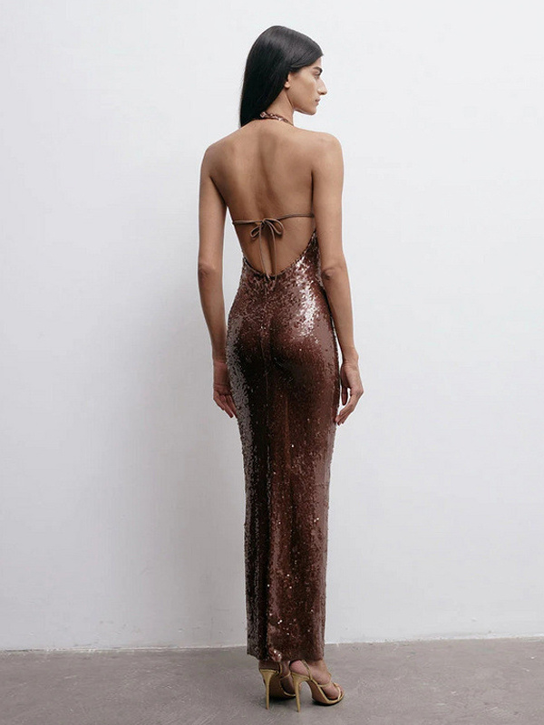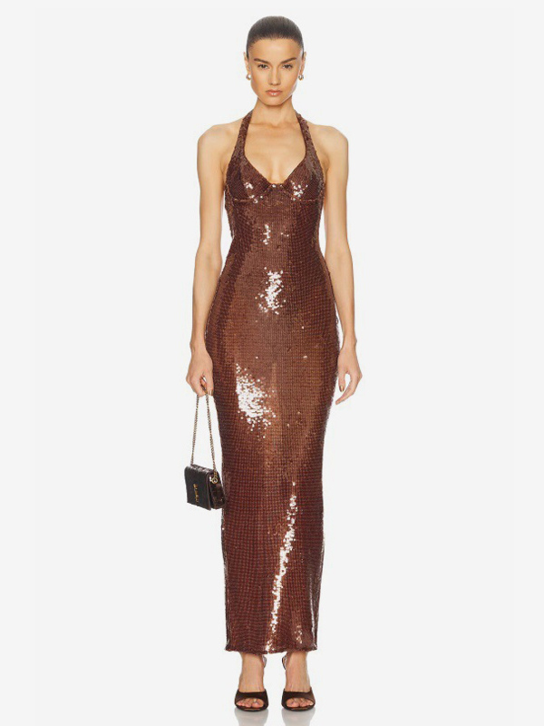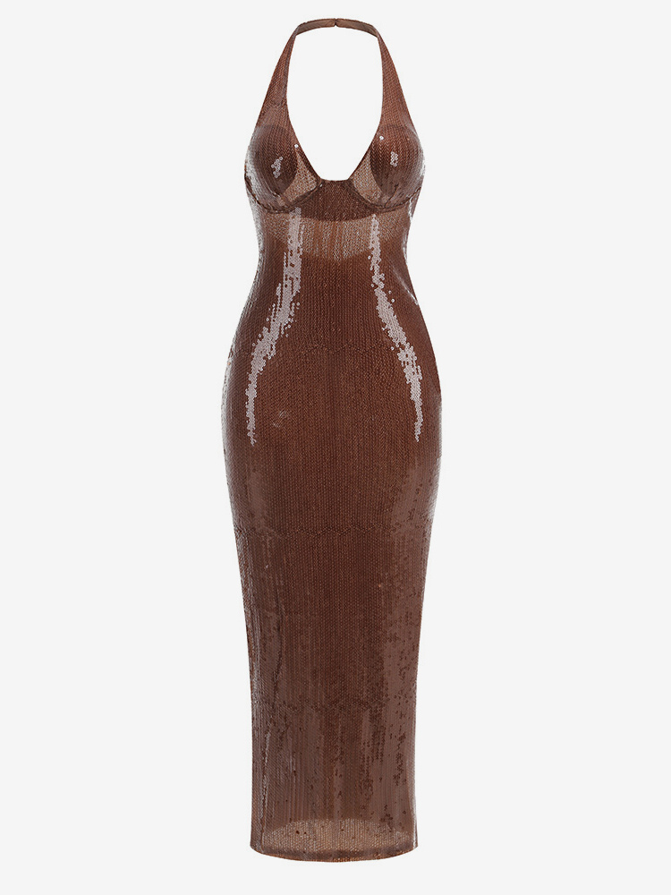 キラキラ輝くスパンコールのマキシ丈フォーマルドレス(女性用) - ブラウンのホルターネック、背中開き、ボディコン、スリムなロングガウン - 2026年夏のガラナイトアウトパーティー