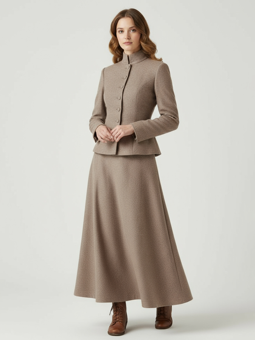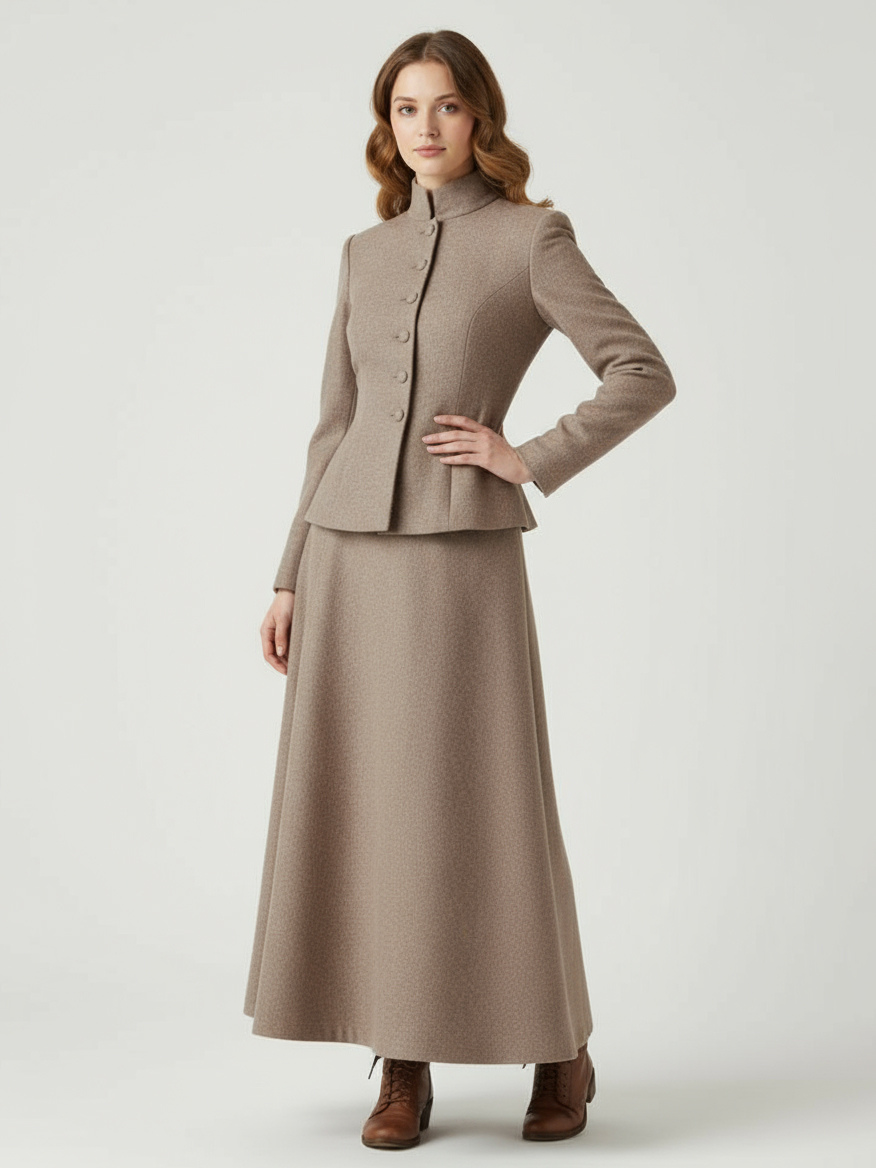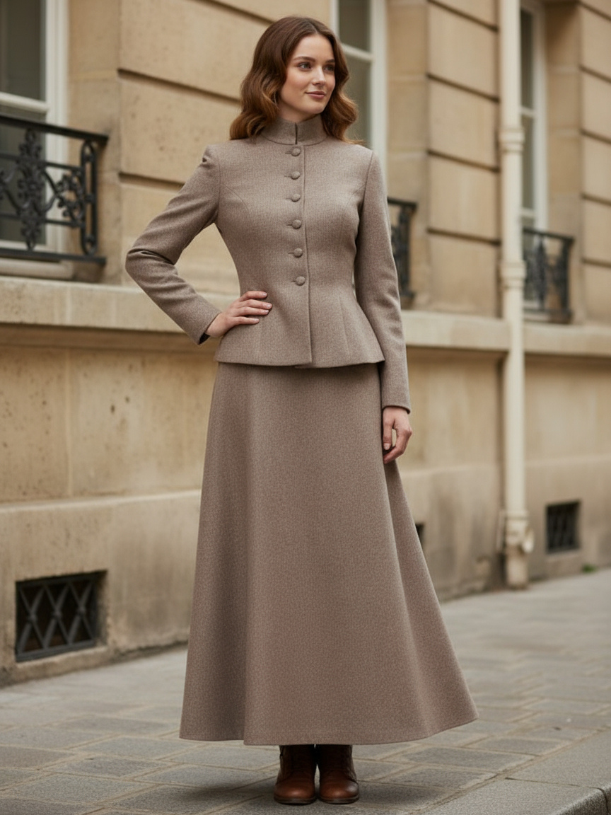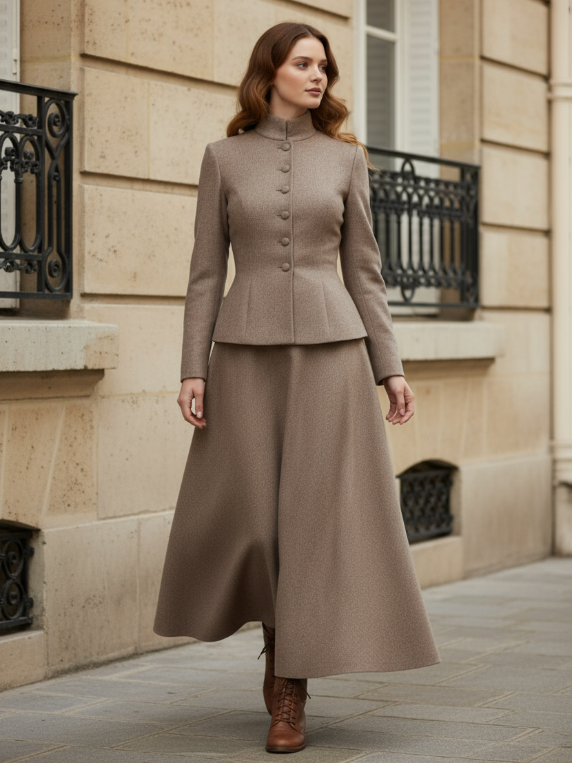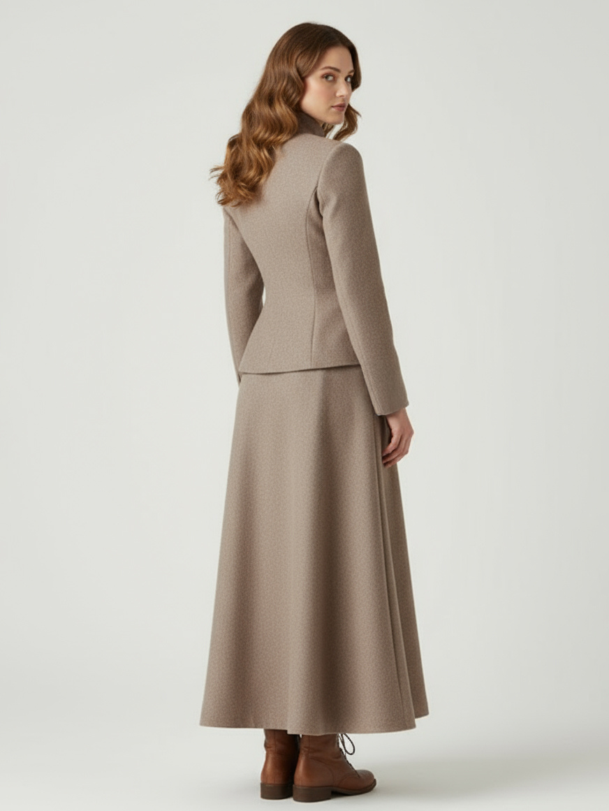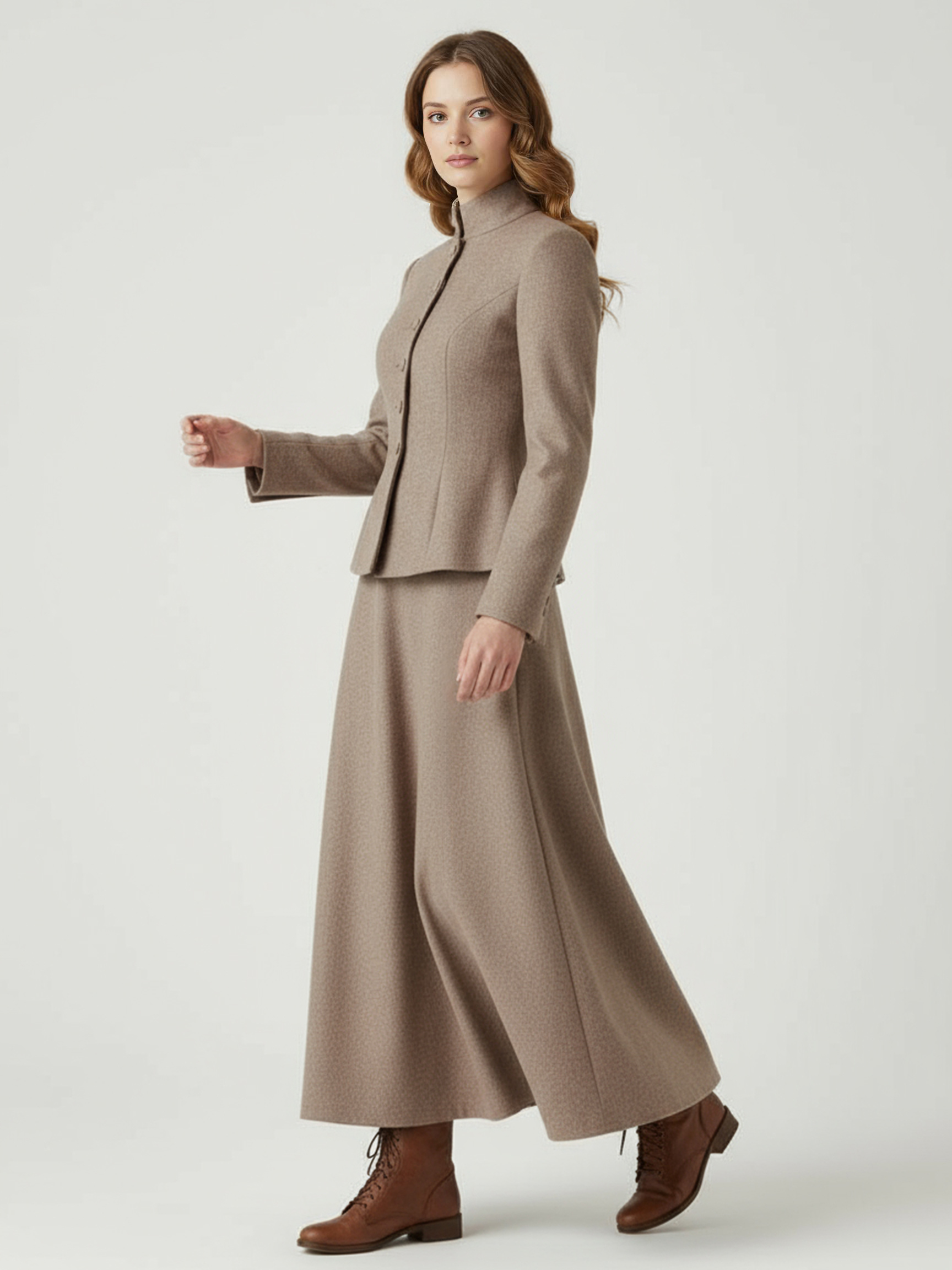 スタンドカラーペプラムジャケットとマキシスカートのウールブレンドツーピースコーデセット(レディース2025年)