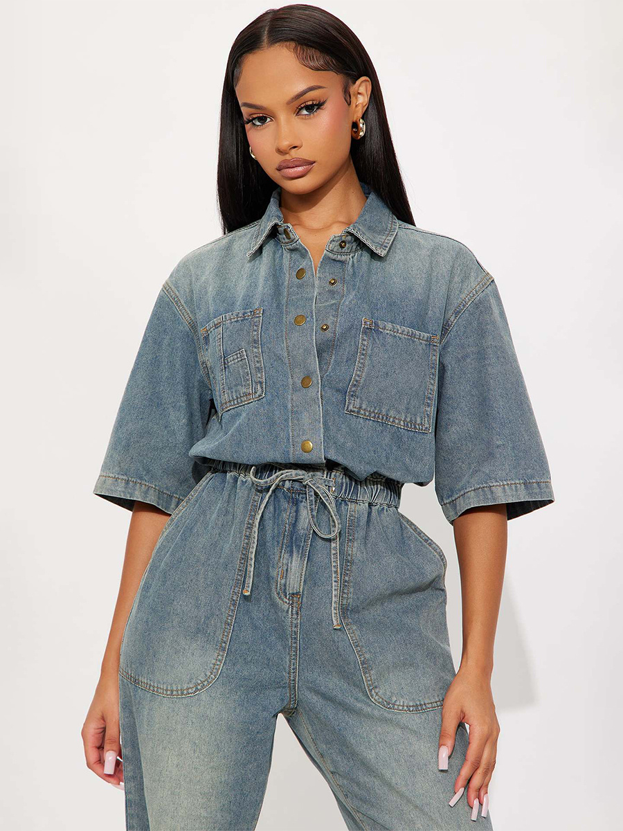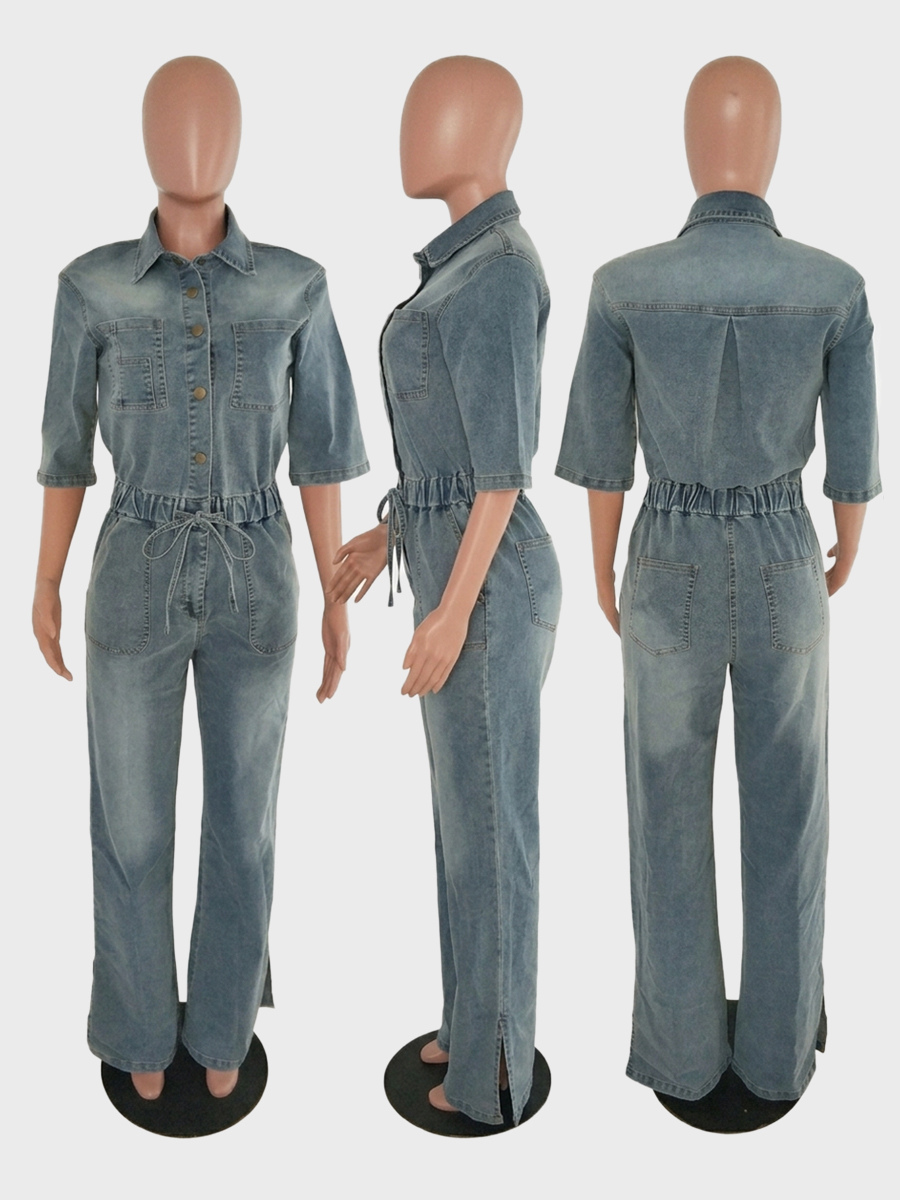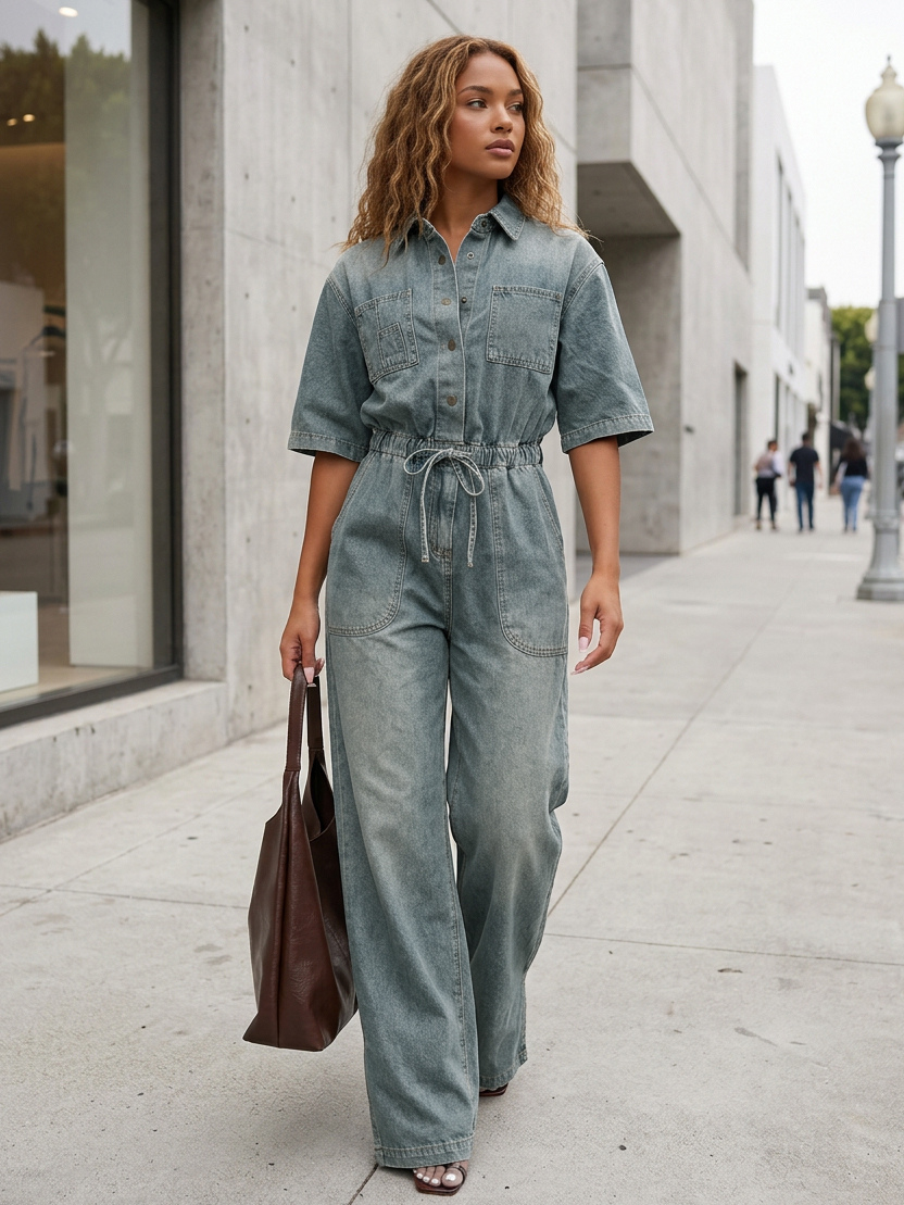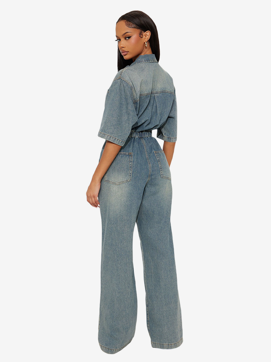 ストレッチウォッシュドデニムジャンプスーツ(レディース) - ライトブルー、ドローストリングウエスト、サイドスリット、ワイドレッグ、カーゴロンパース - サマーストリートウェア2026