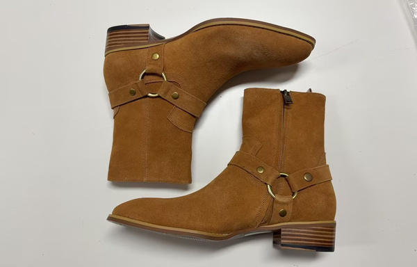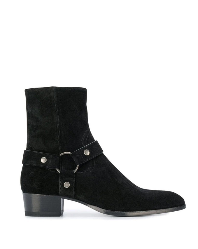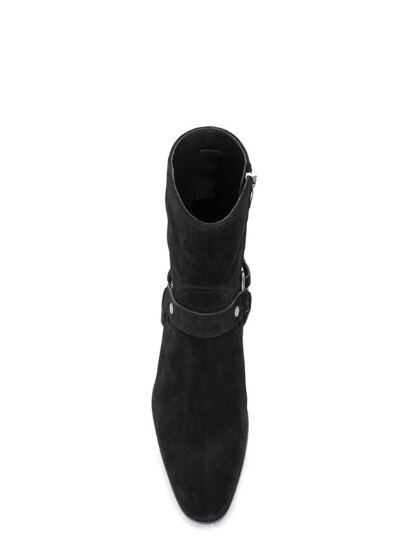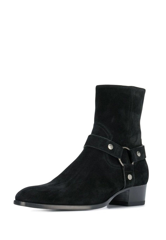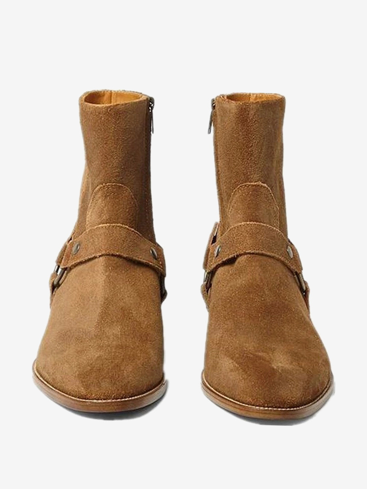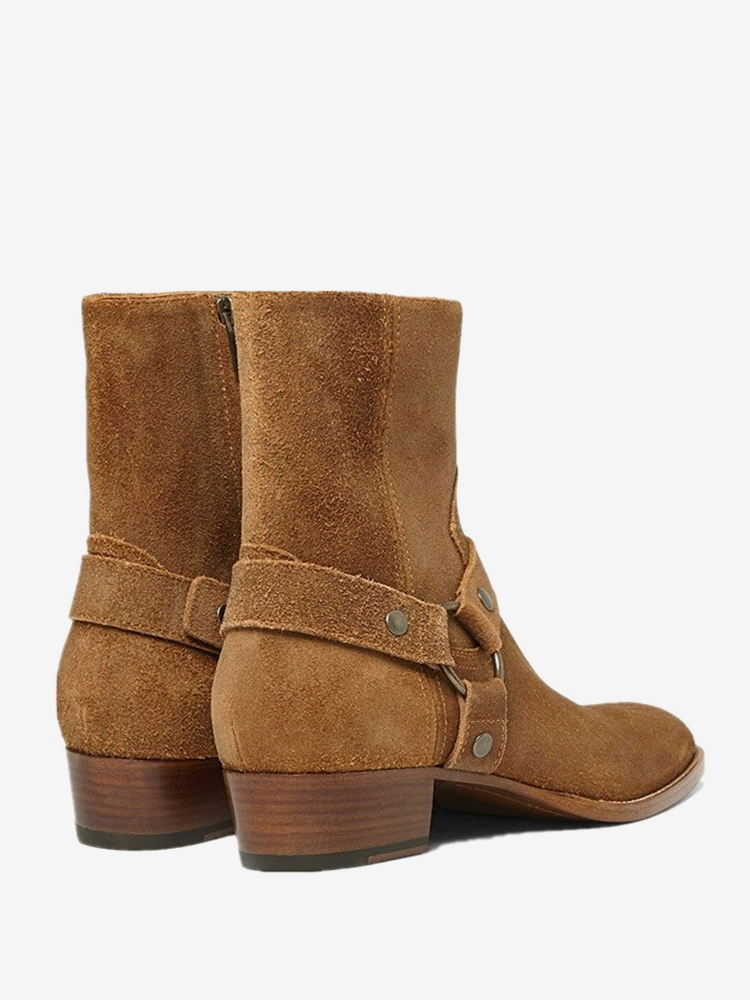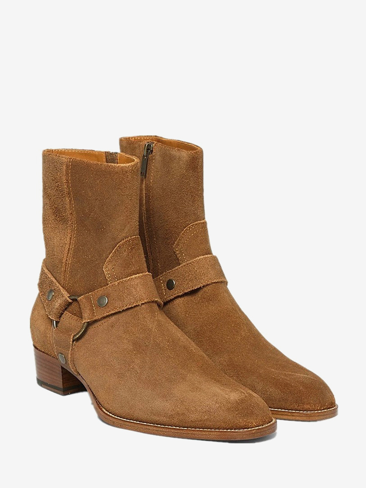 メンズ スエード アンクルブーツ ラウンドトゥ バックルディテール チャンキーヒール カジュアルブーツ