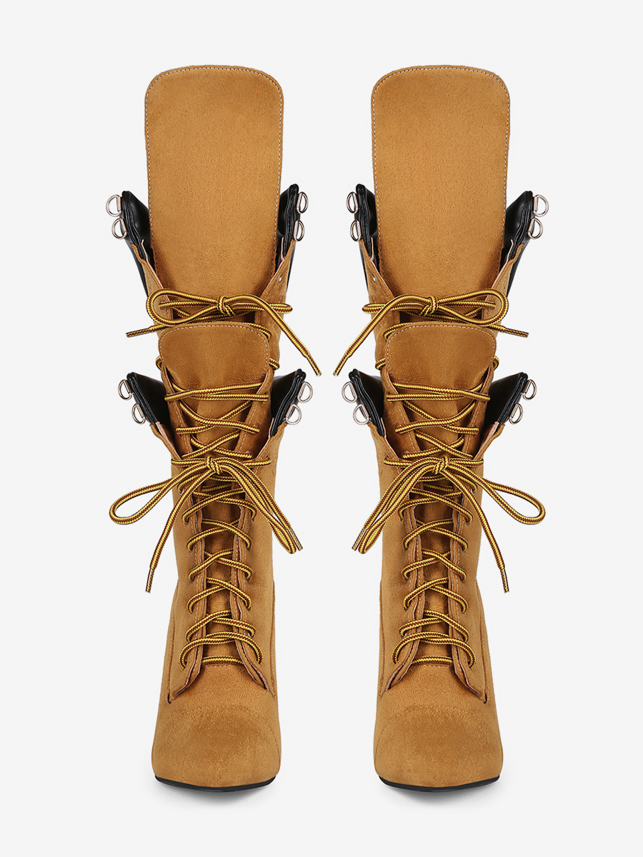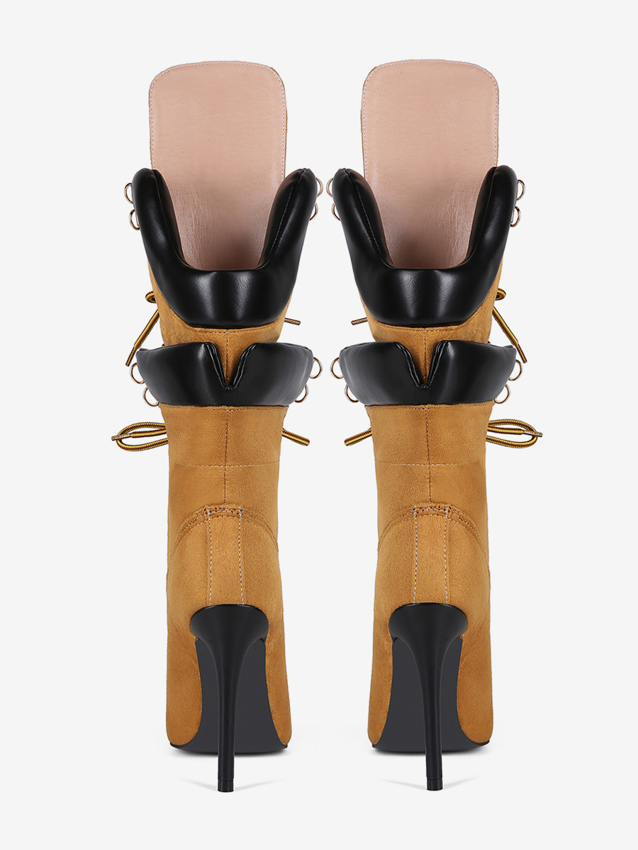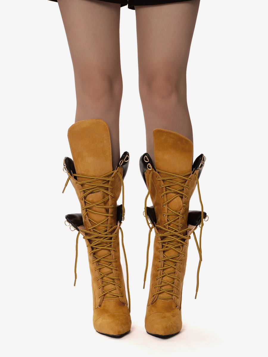 スエードミッドカーフブーツ レディース ポインテッドトゥ レースアップ ハイヒールブーツ