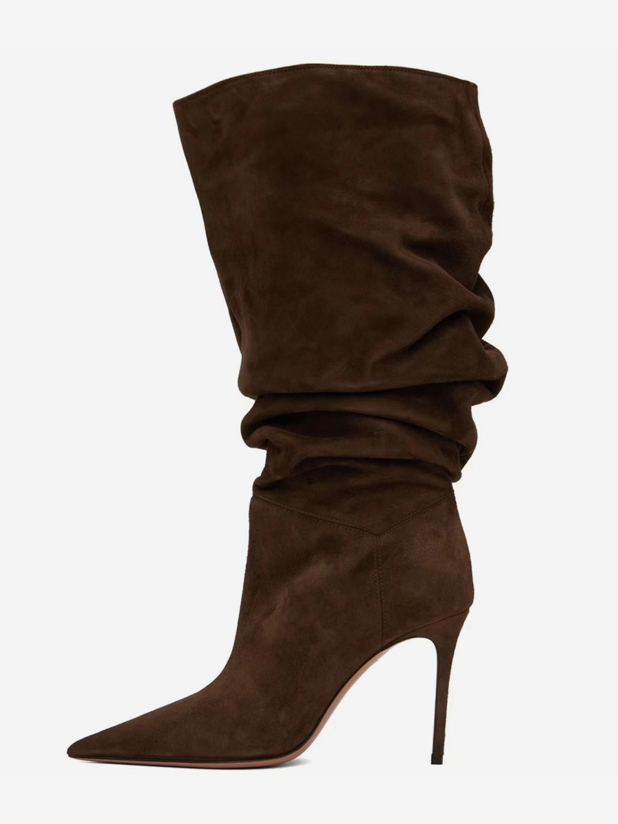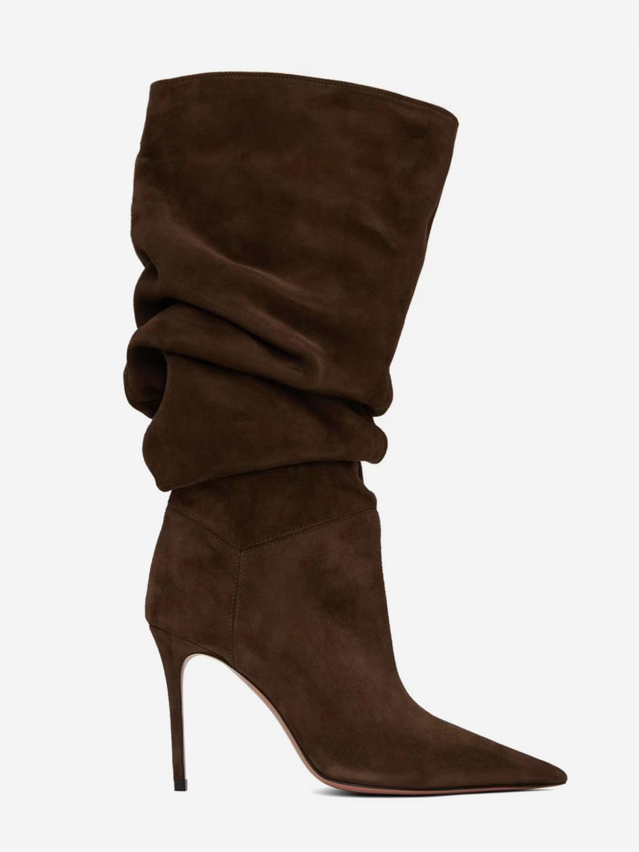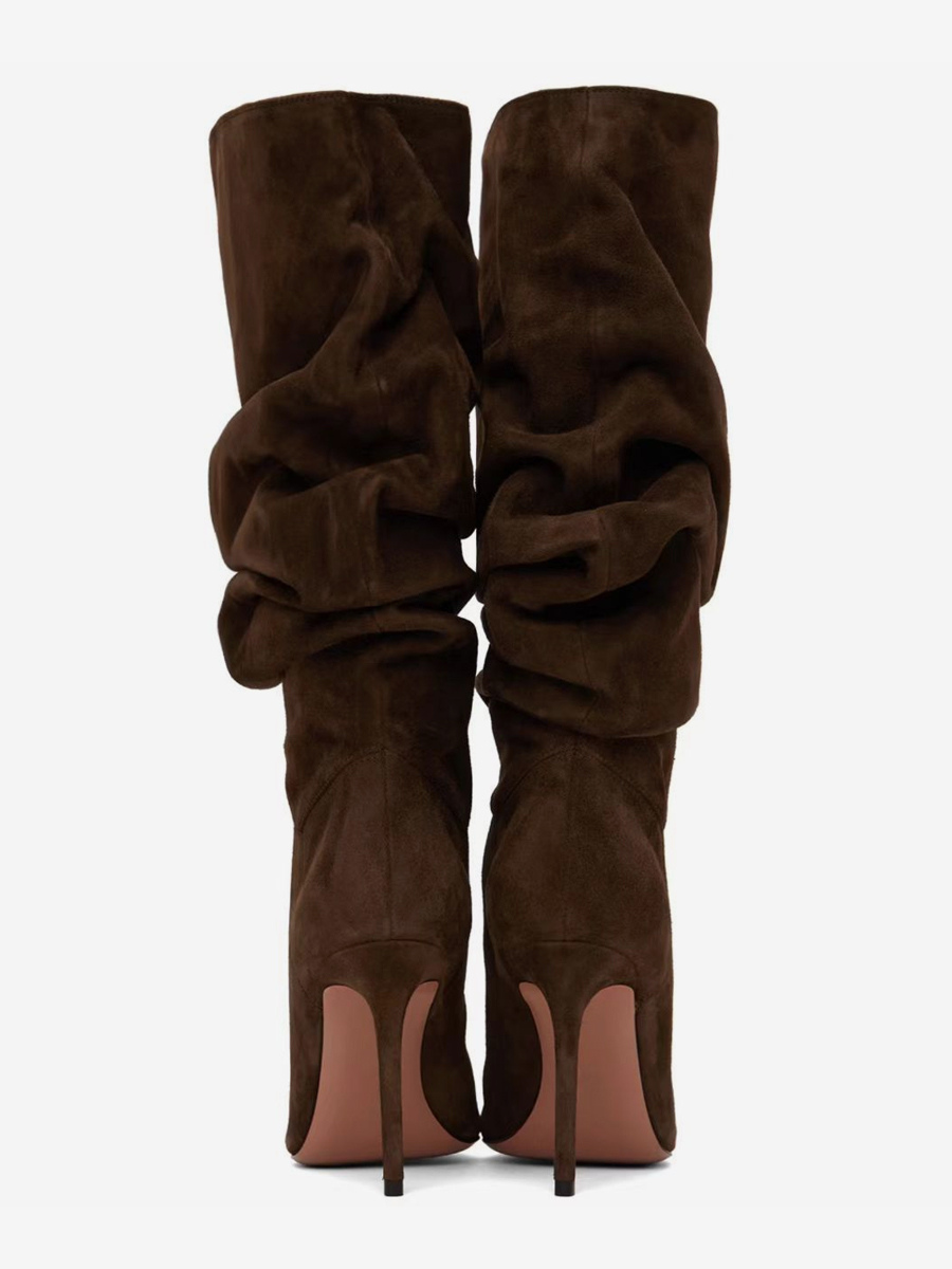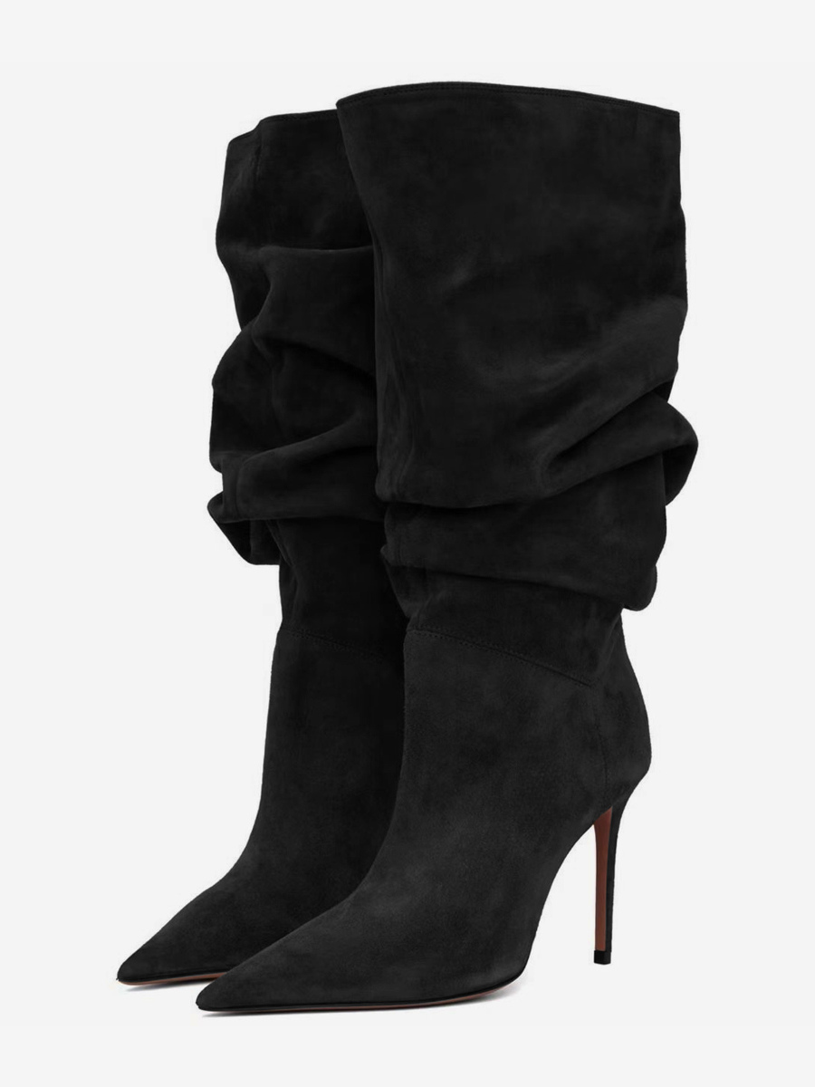 スエードミッドカーフブーツ レディース ポインテッドトゥ スラウチハイヒールブーツ