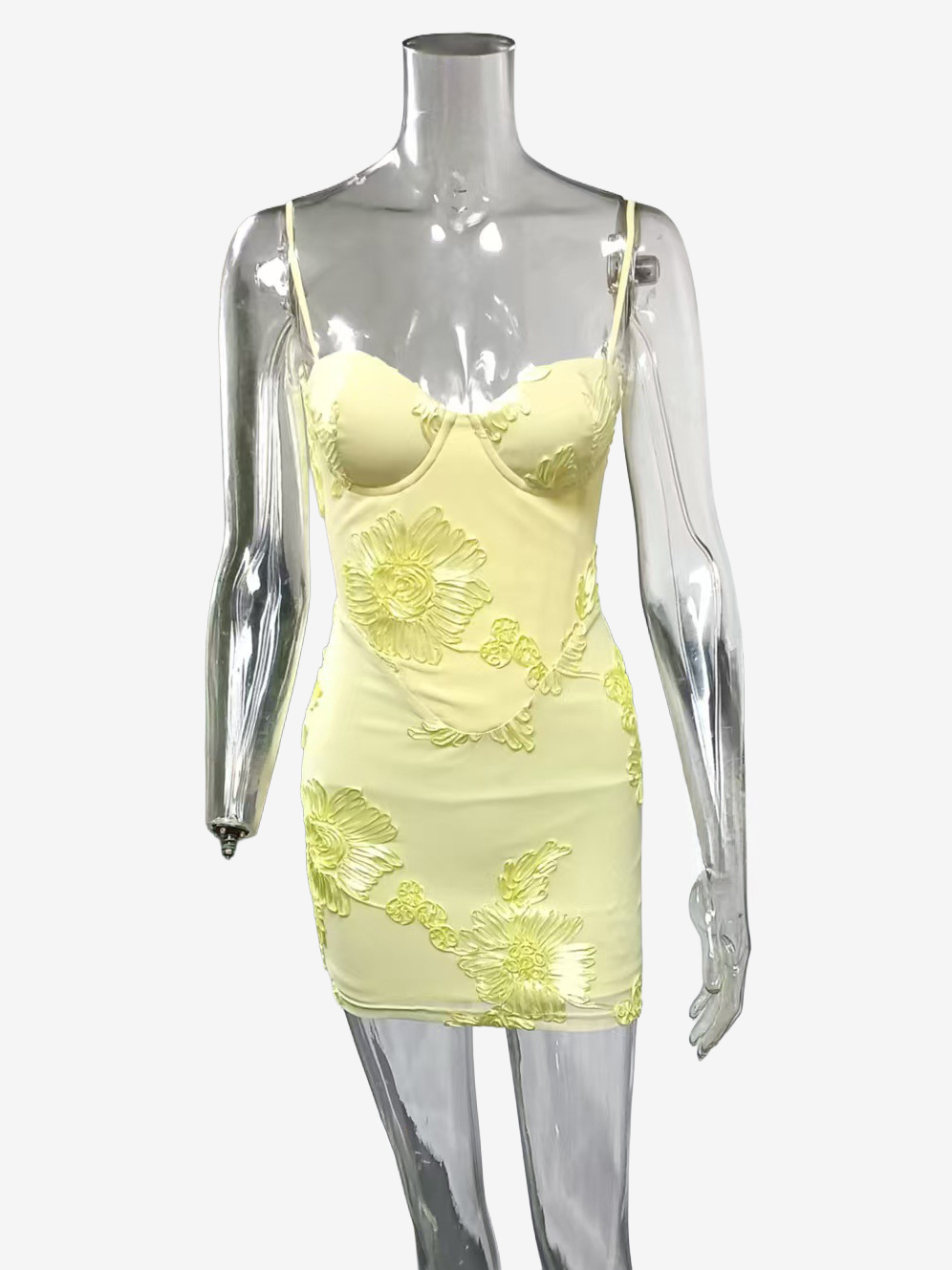 ひまわり刺繍コルセットボディコンミニドレス(バックストラップディテール付き、レディース)2026年モデル
