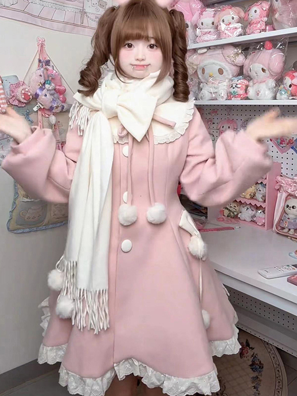 スイートロリータコート ピンクのポンポン付きオーバーコート 冬用ロリータコート(スカーフ付き)