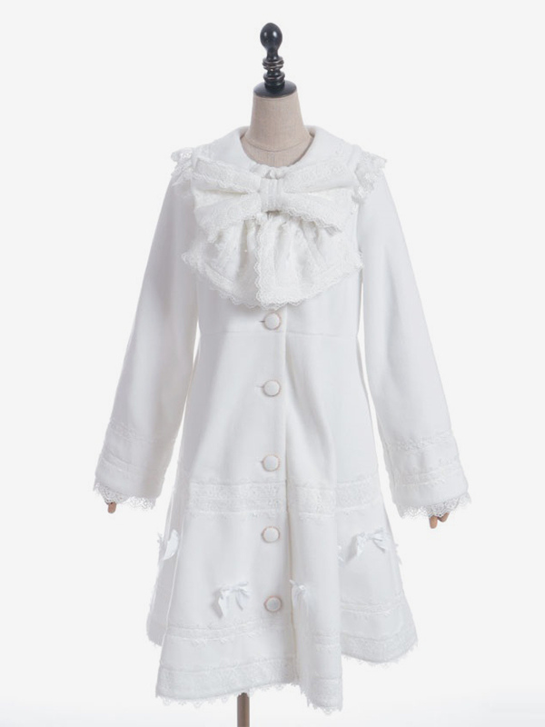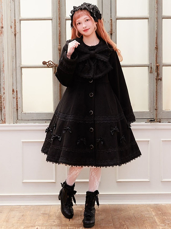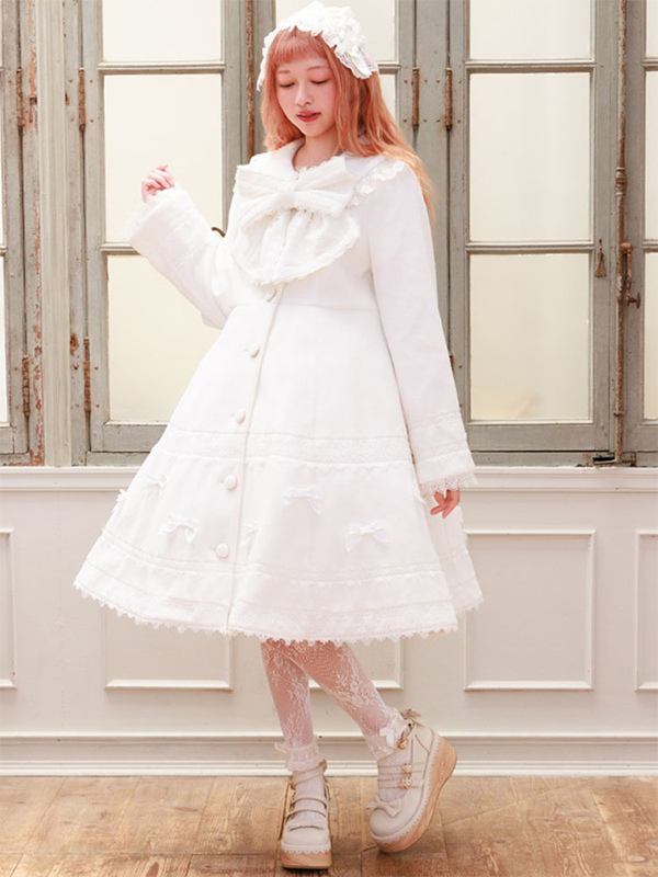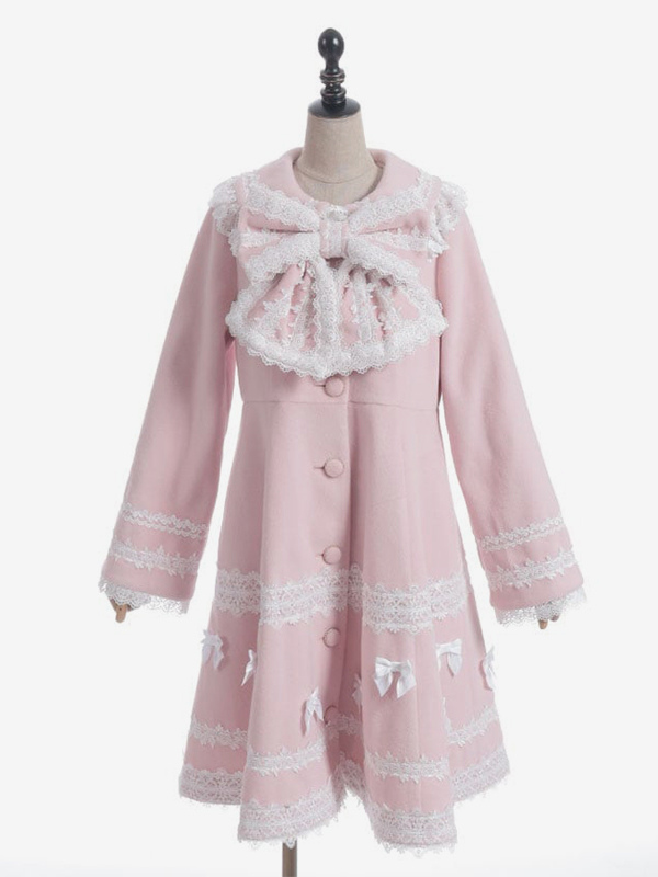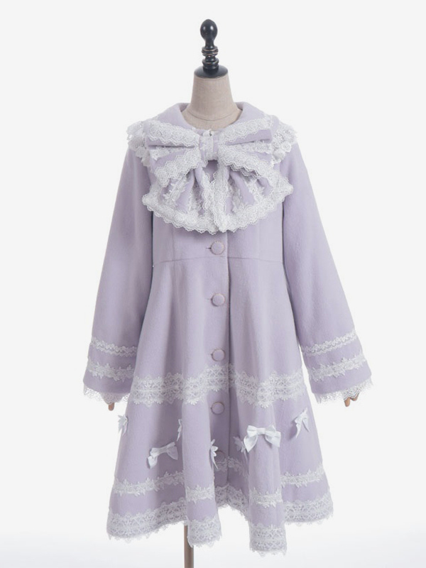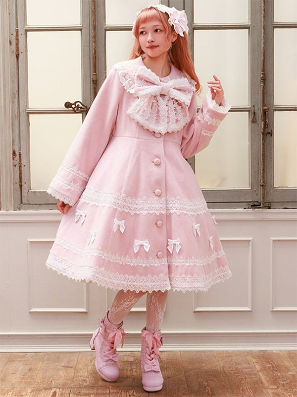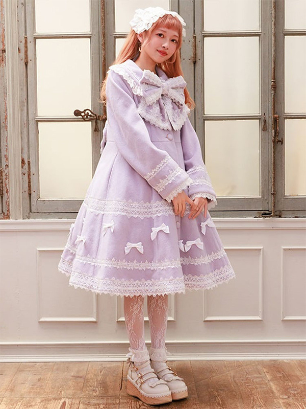 スイートロリータコート ソフトピンクパープルリボンレース長袖オーバーコート 冬用ロリータコート