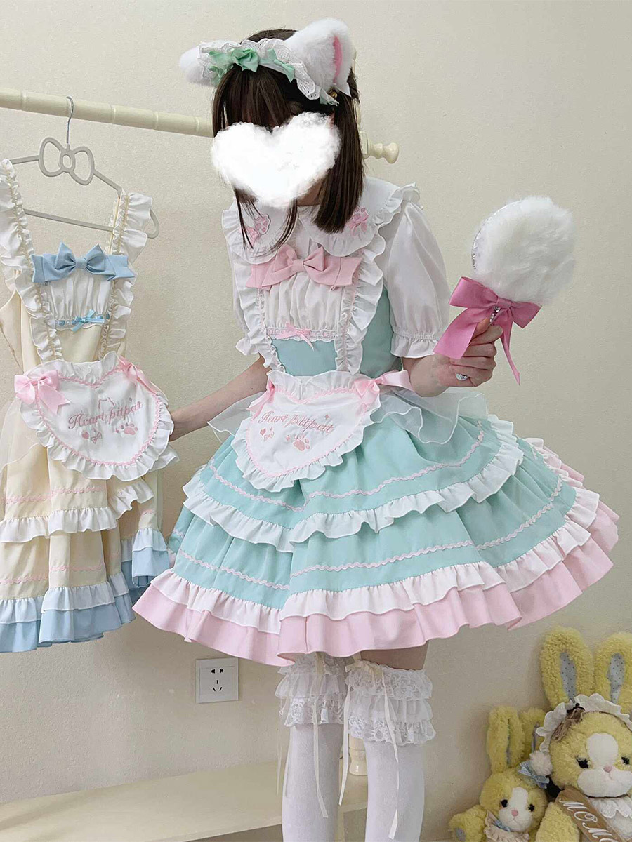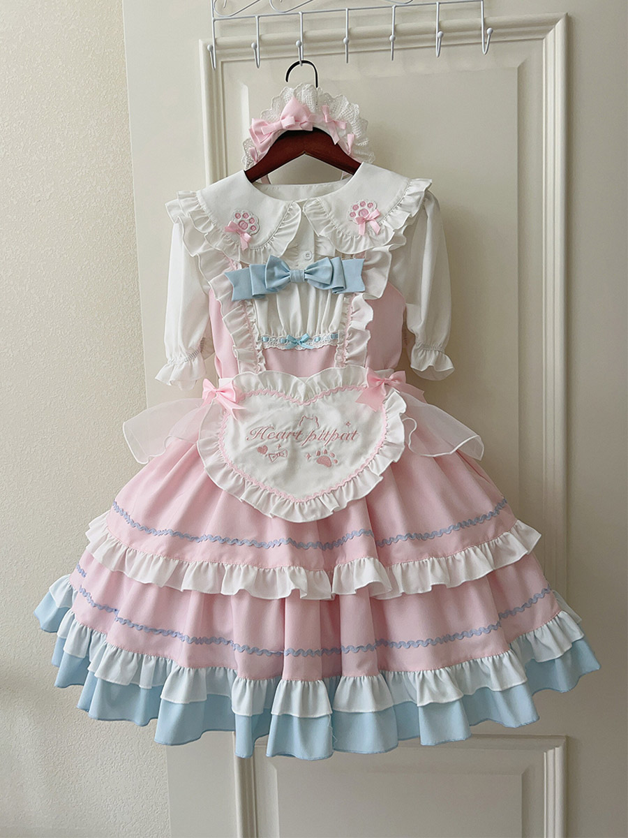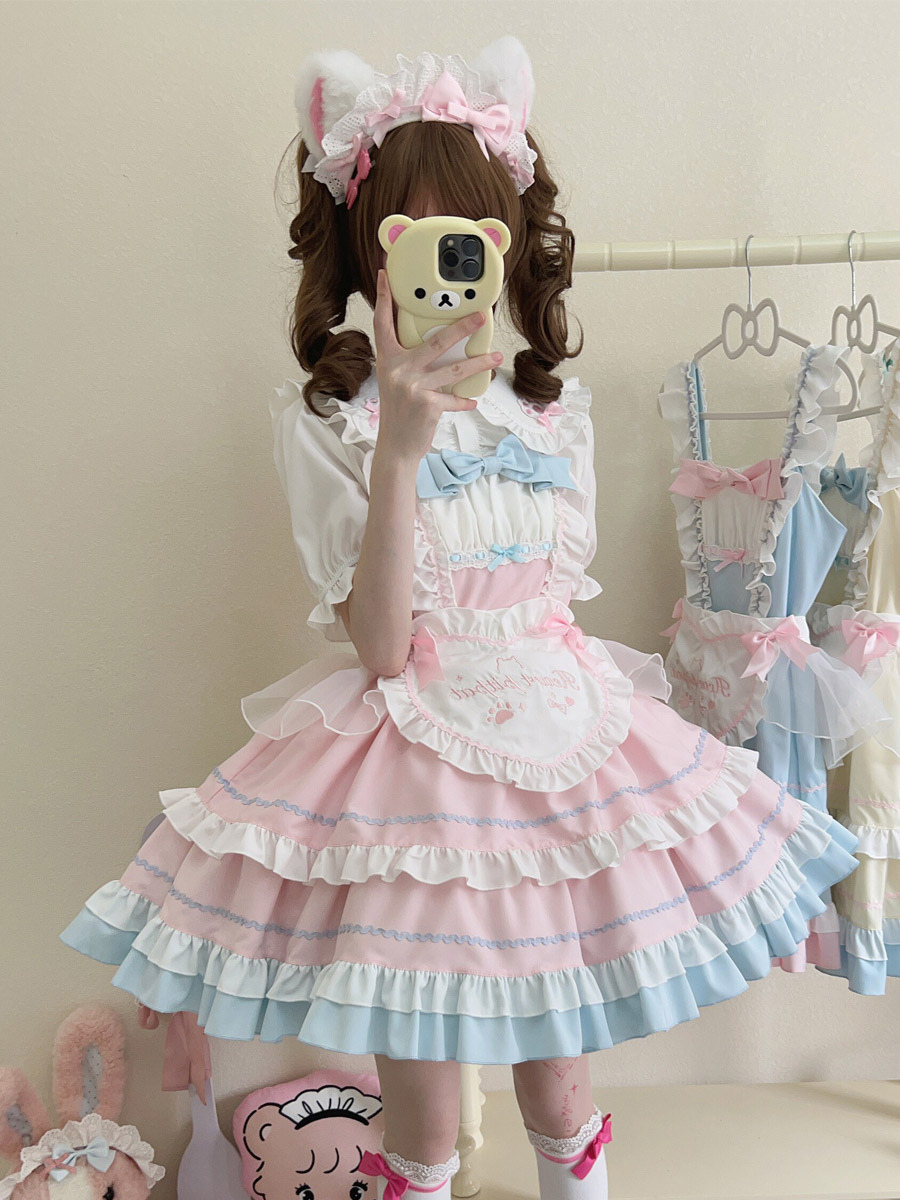 スウィートロリータドレス ノースリーブ フリル リボン クラシック ピンク ロリータドレス エプロン付き