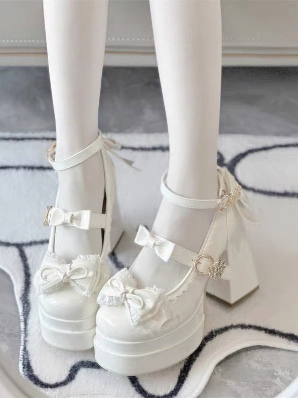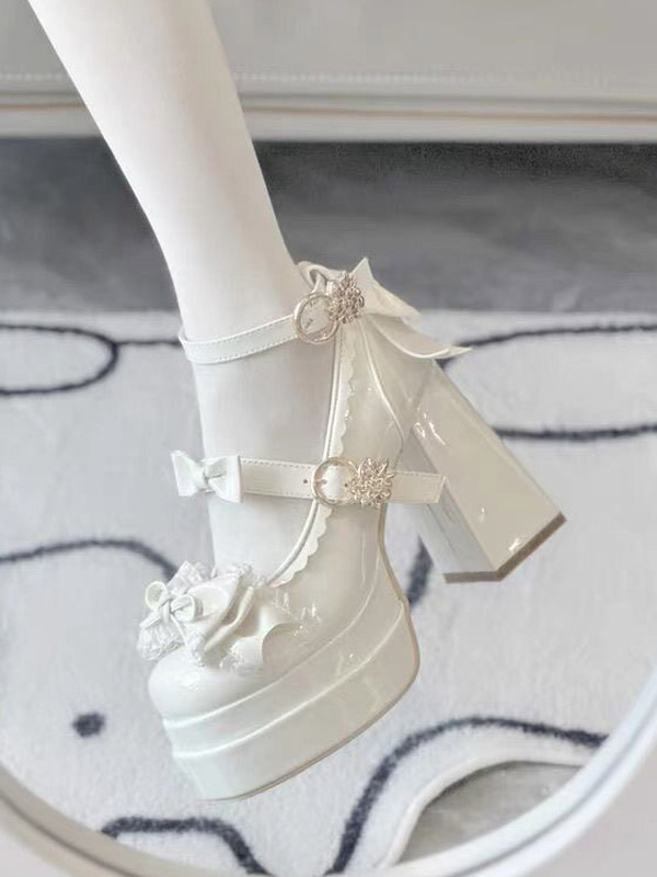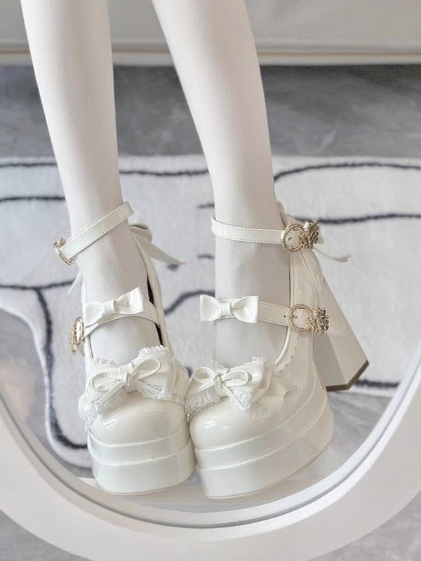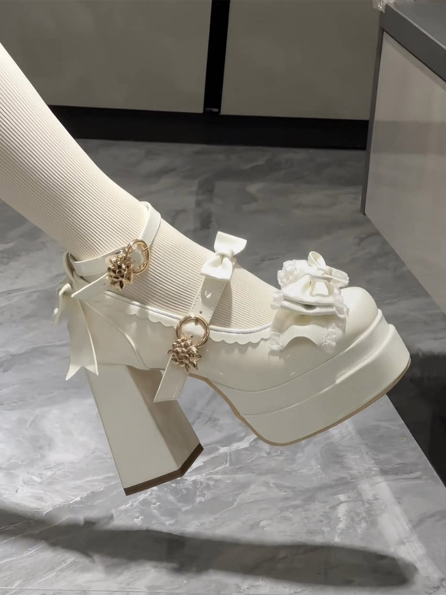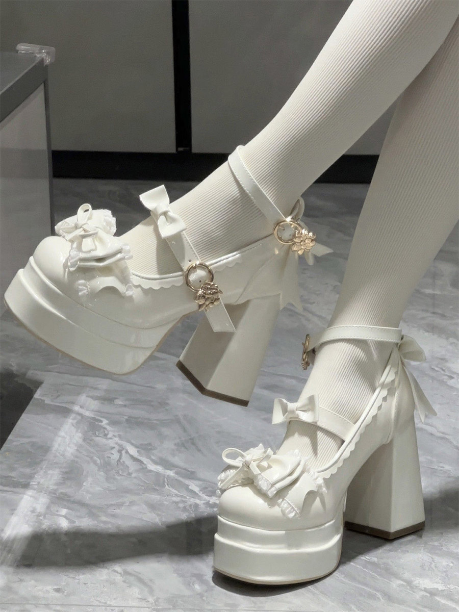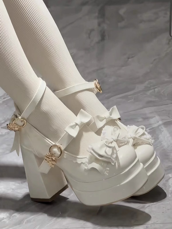 スウィートロリータシューズ エクリュ ホワイト リボン PUレザー チャンキーヒール ロリータパンプス