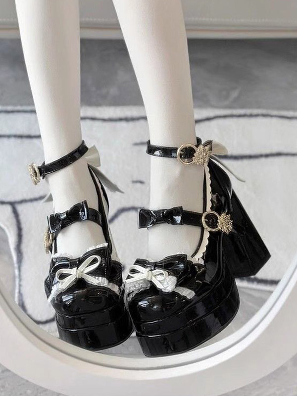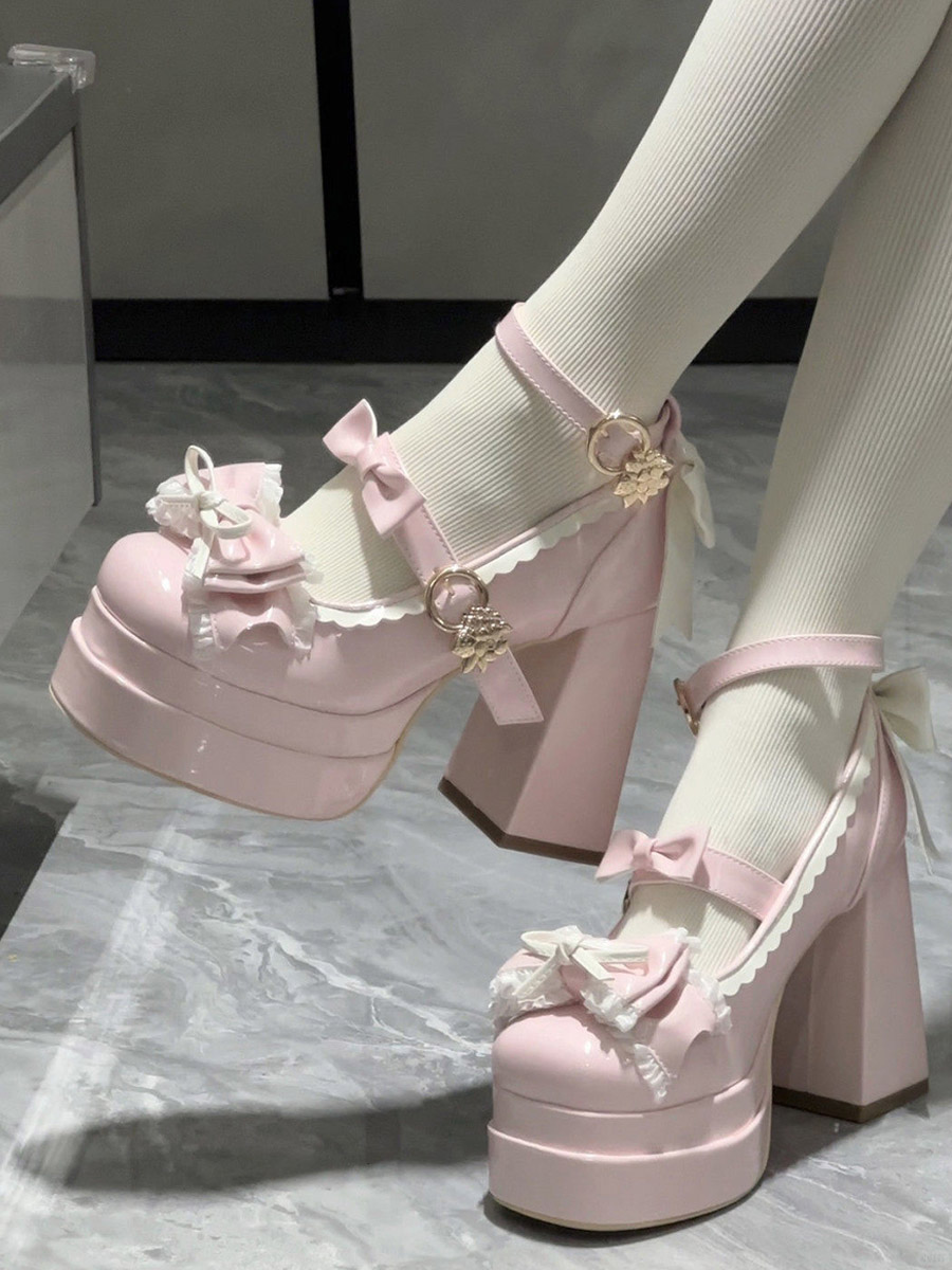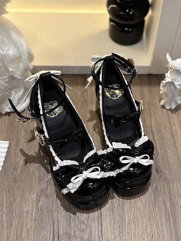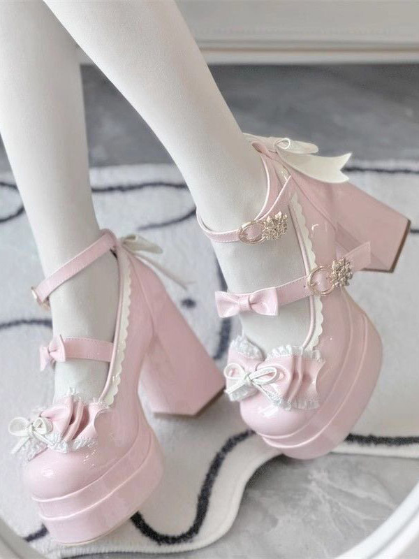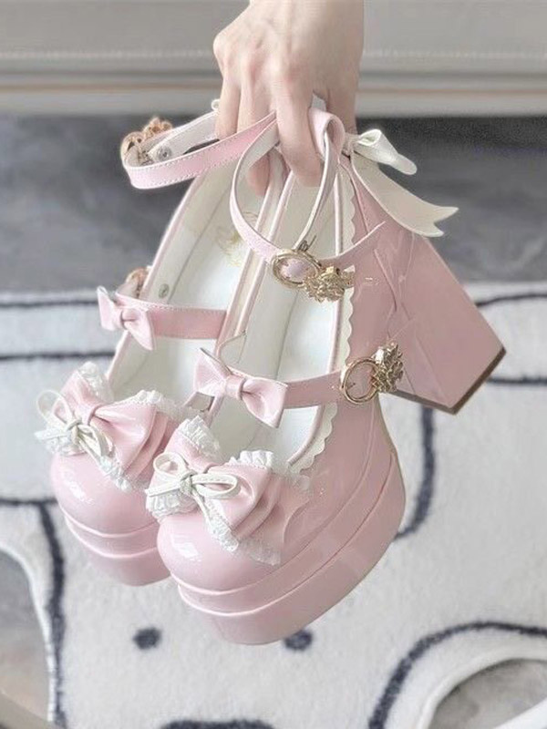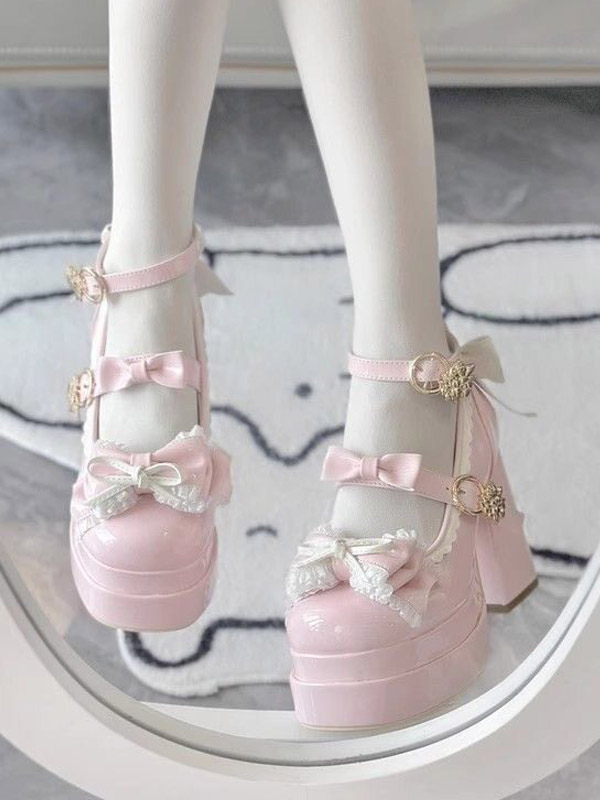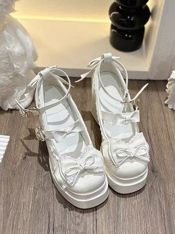 スウィートロリータシューズ エクリュ ホワイト リボン PUレザー チャンキーヒール ロリータパンプス