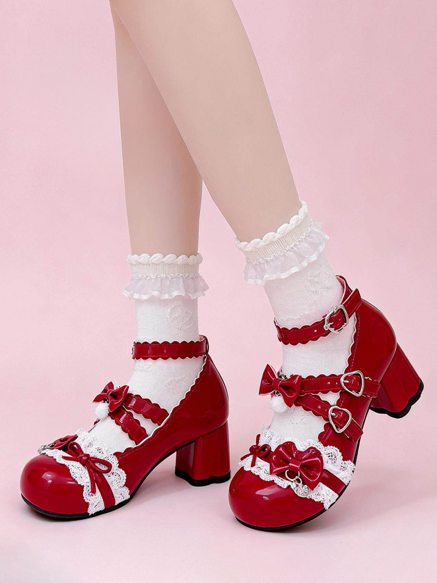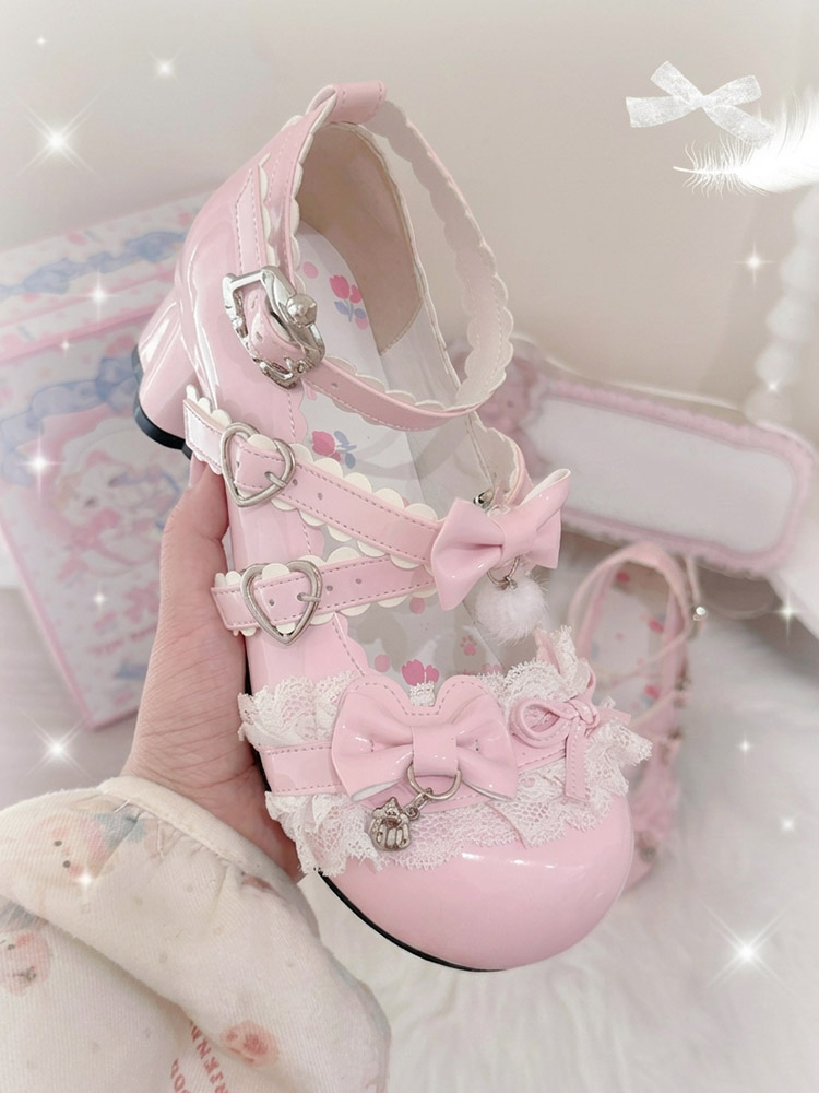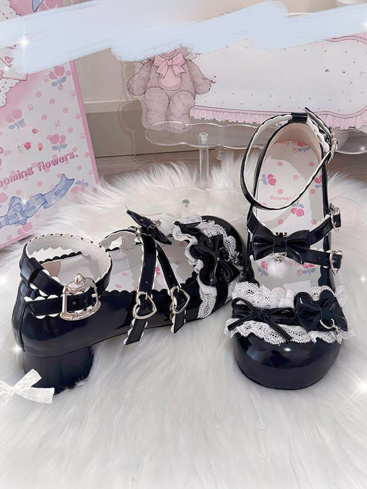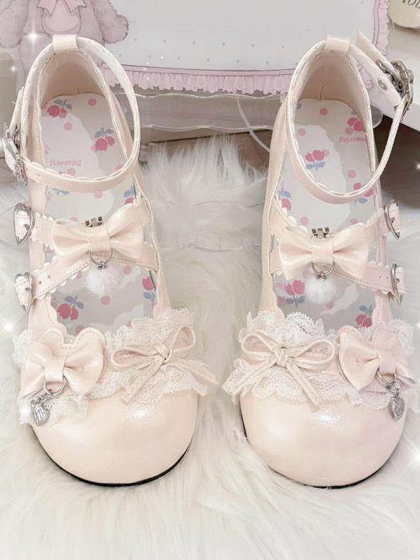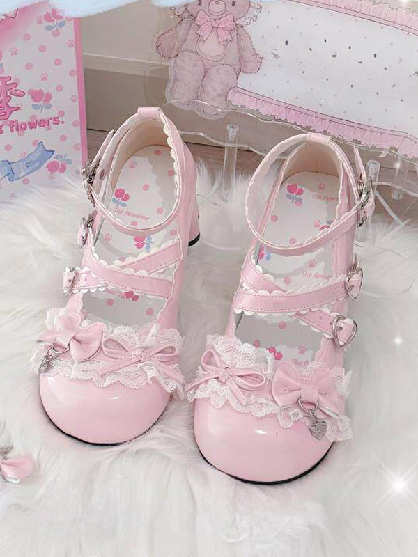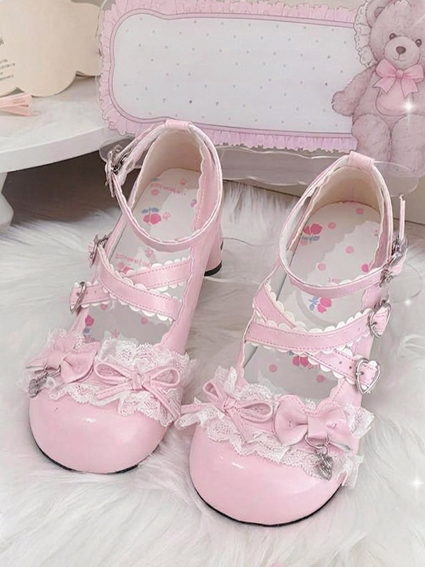 スウィートロリータシューズ レース ピンクリボン ラウンドトゥ PUレザー チャンキーヒール ロリータパンプス