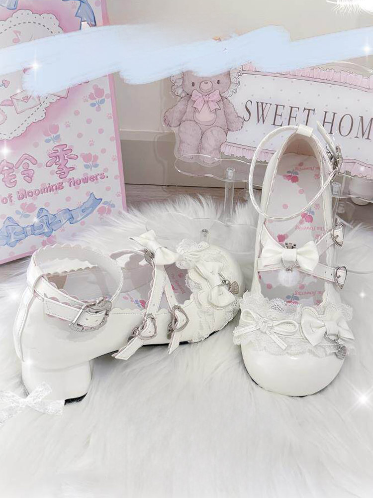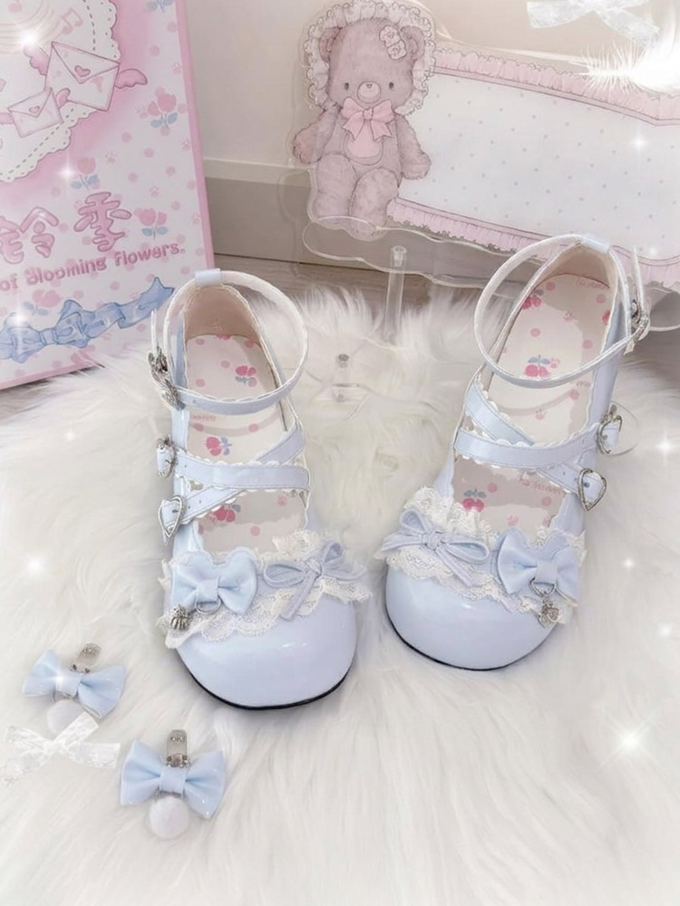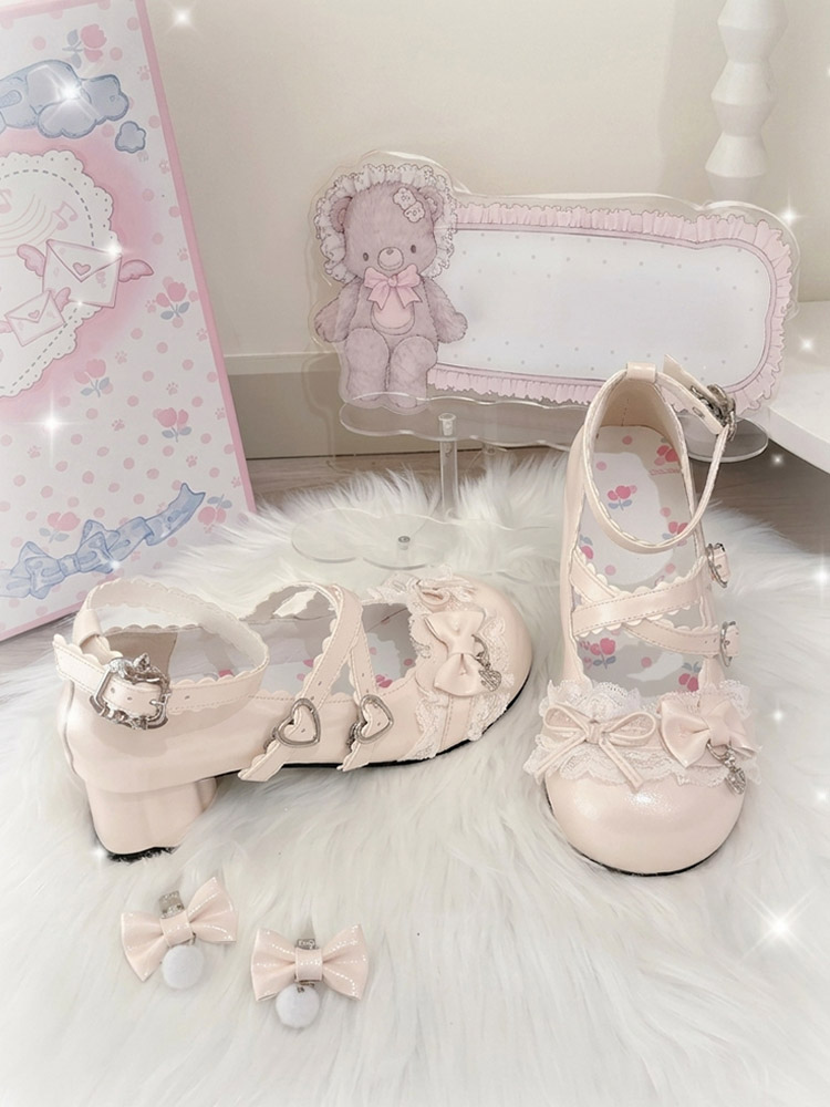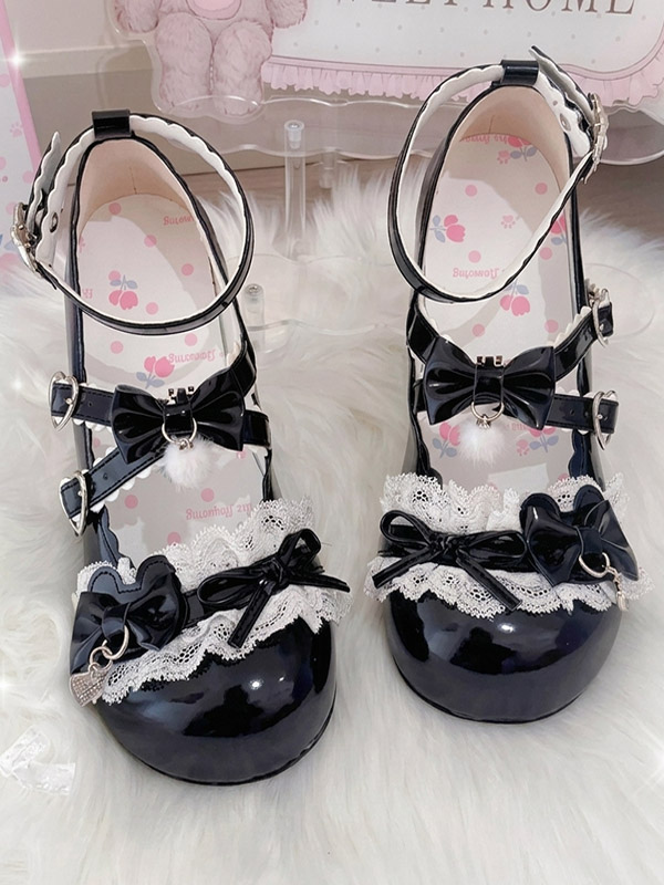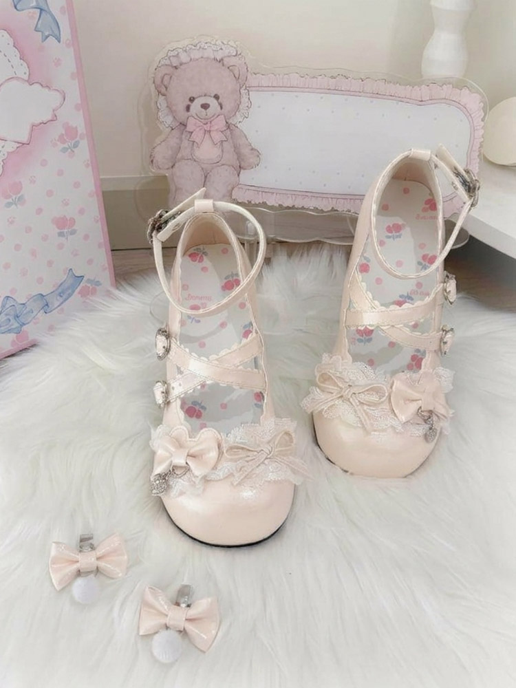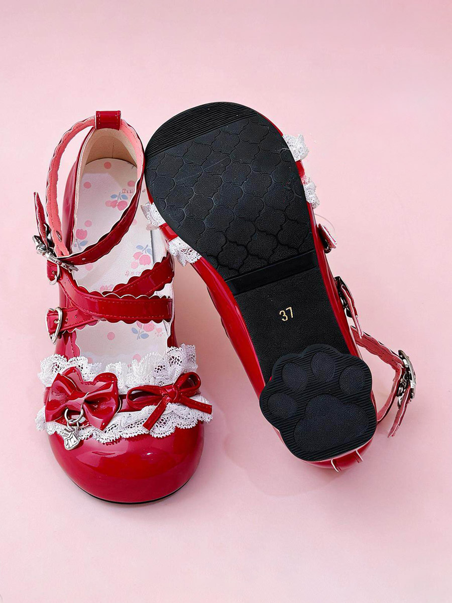 スウィートロリータシューズ レース ピンクリボン ラウンドトゥ PUレザー チャンキーヒール ロリータパンプス