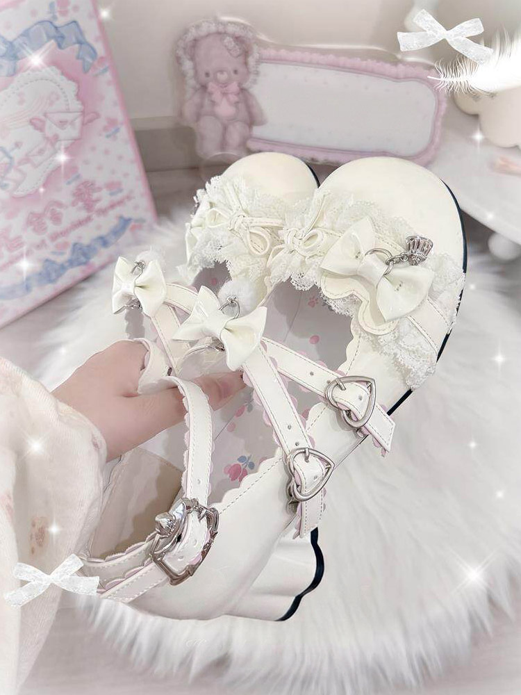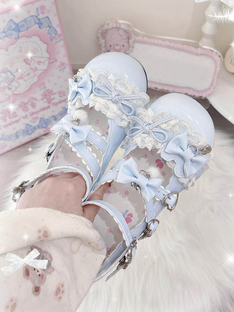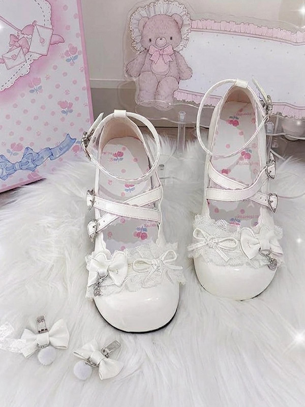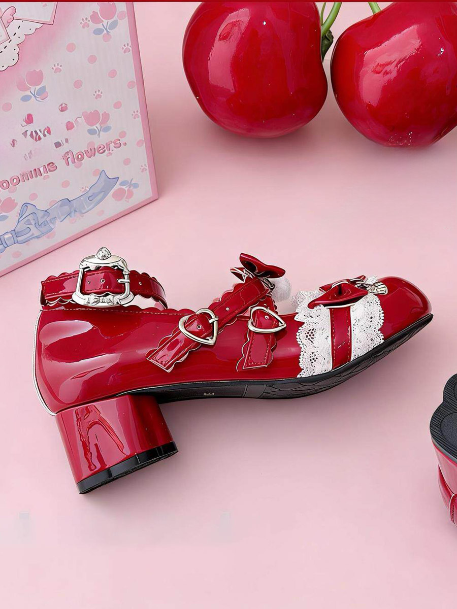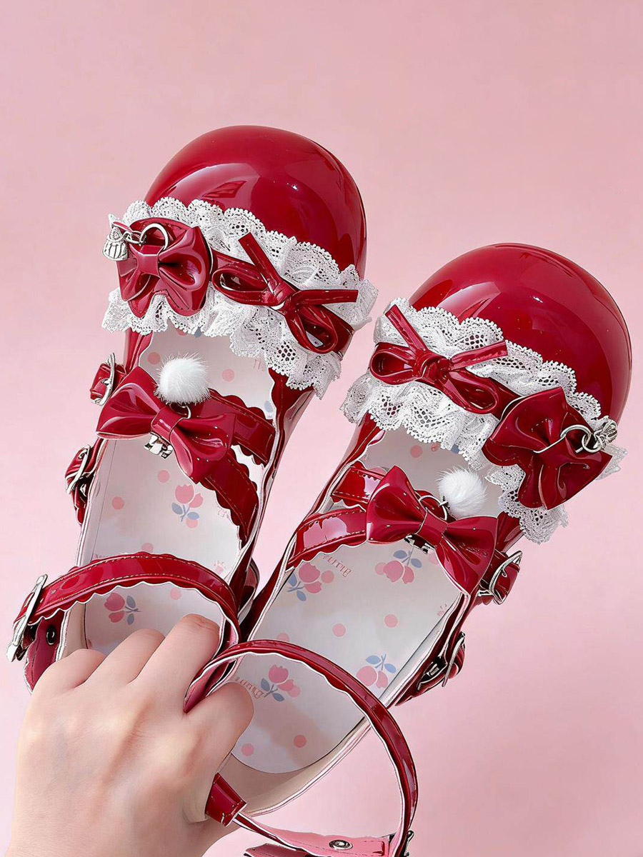 スウィートロリータシューズ レース ピンクリボン ラウンドトゥ PUレザー チャンキーヒール ロリータパンプス
