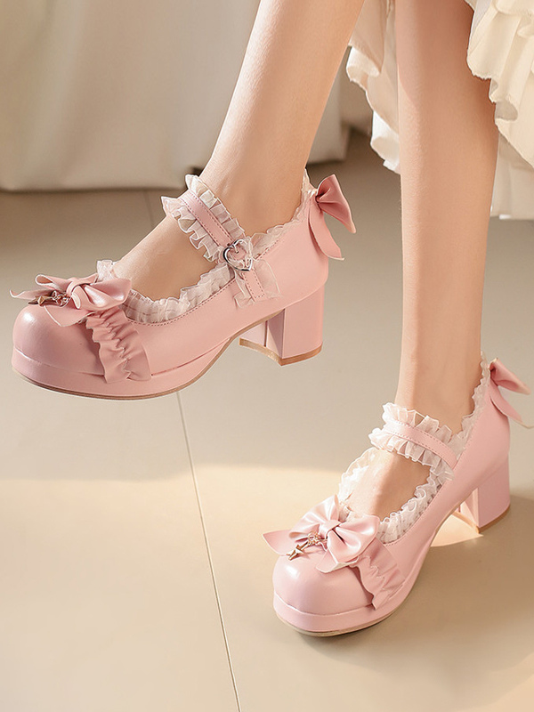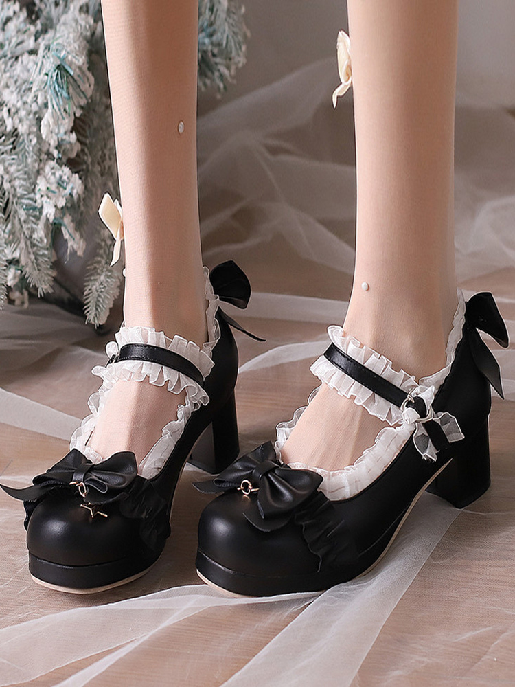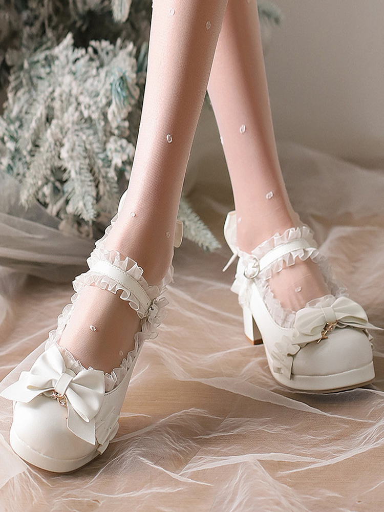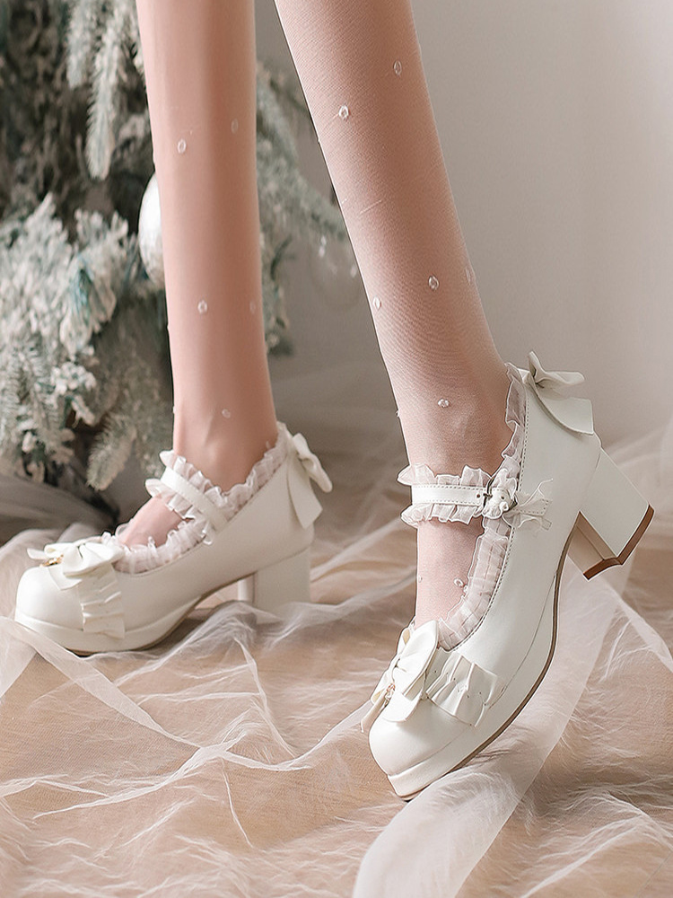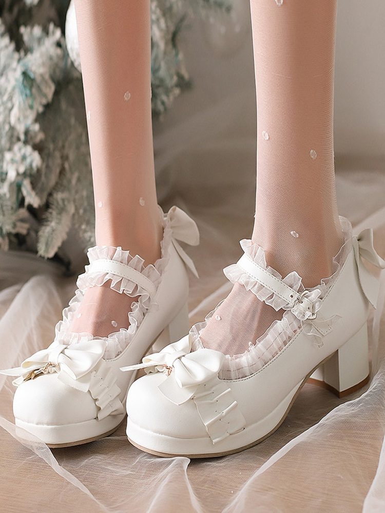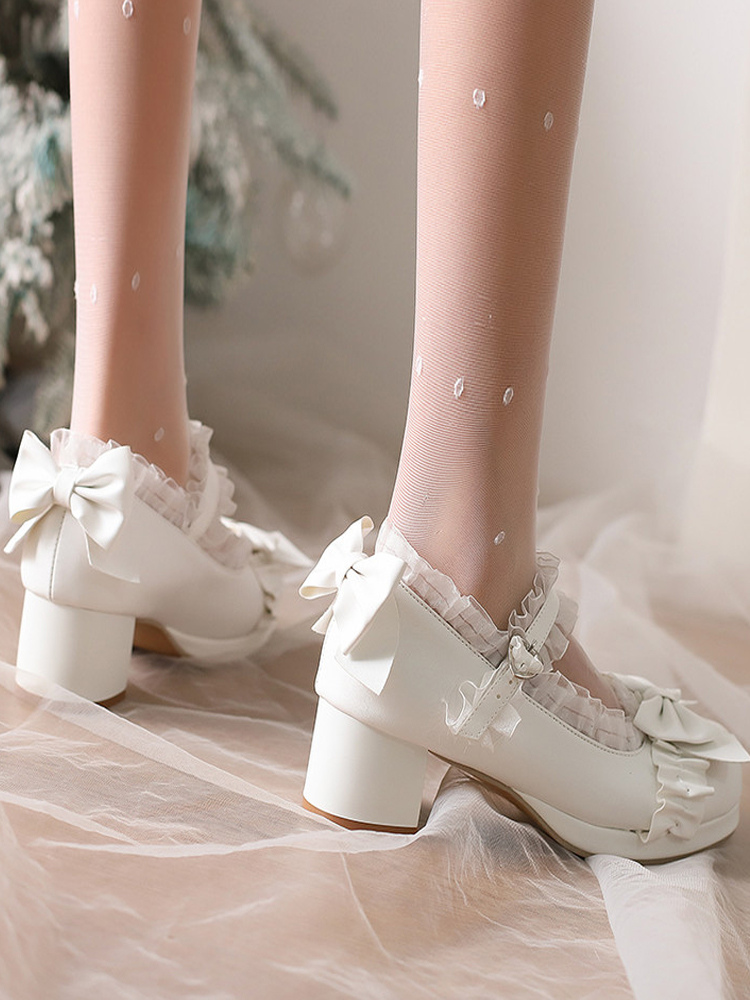スイートロリータシューズ ホワイトリボン ラウンドトゥ PUレザー ロリータパンプス