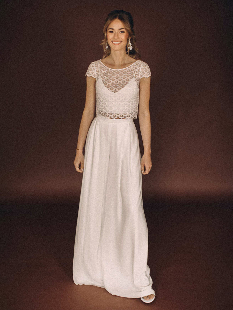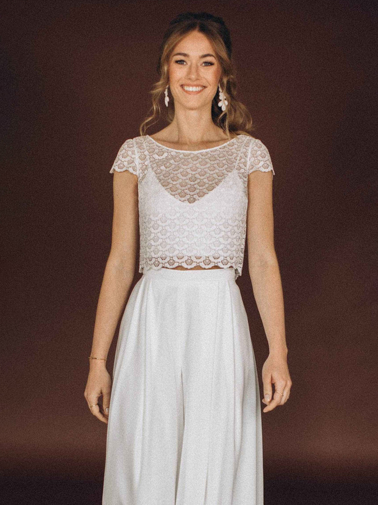 3ピースウェディングドレス シフォンレース イリュージョンネックライン ツーピース フロアレングス バックレス ショートスリーブ ロング ホワイト