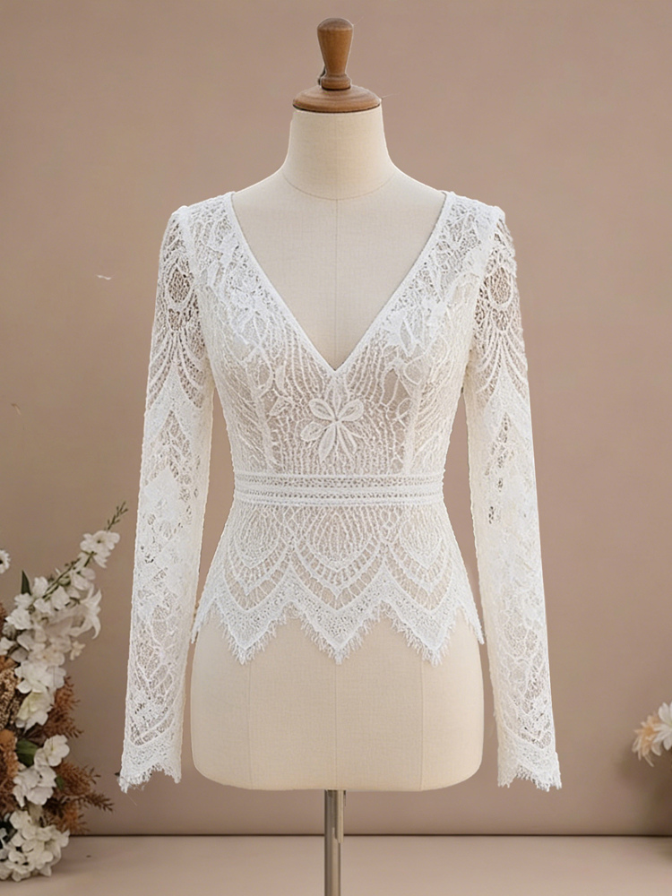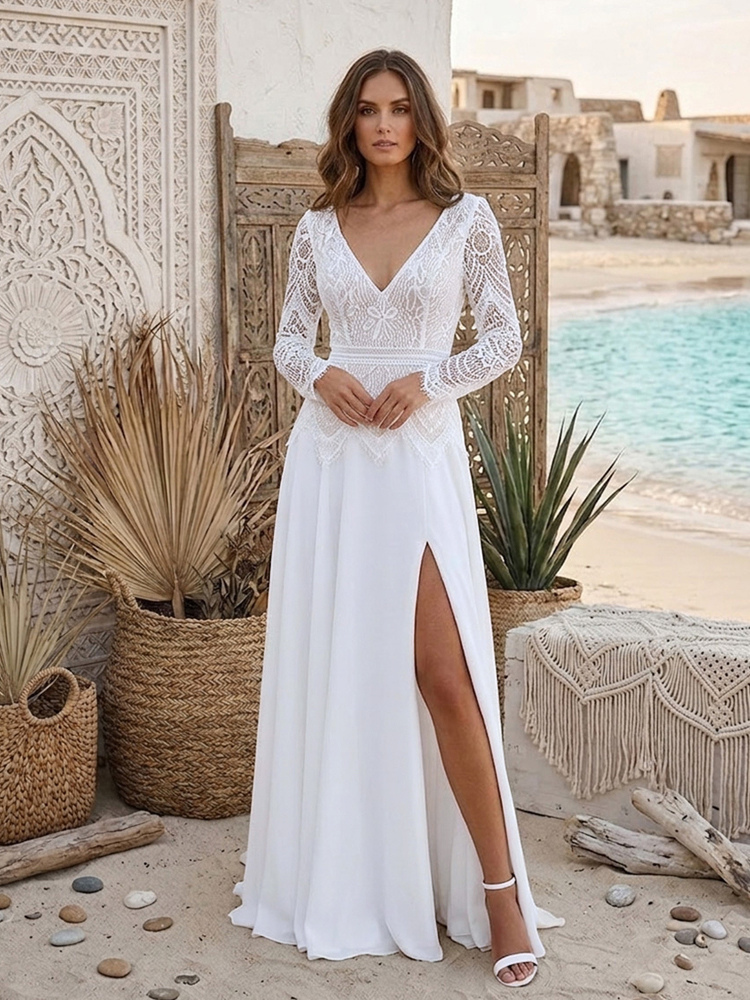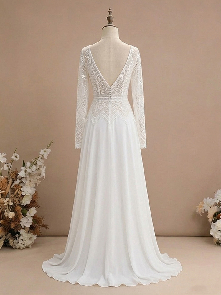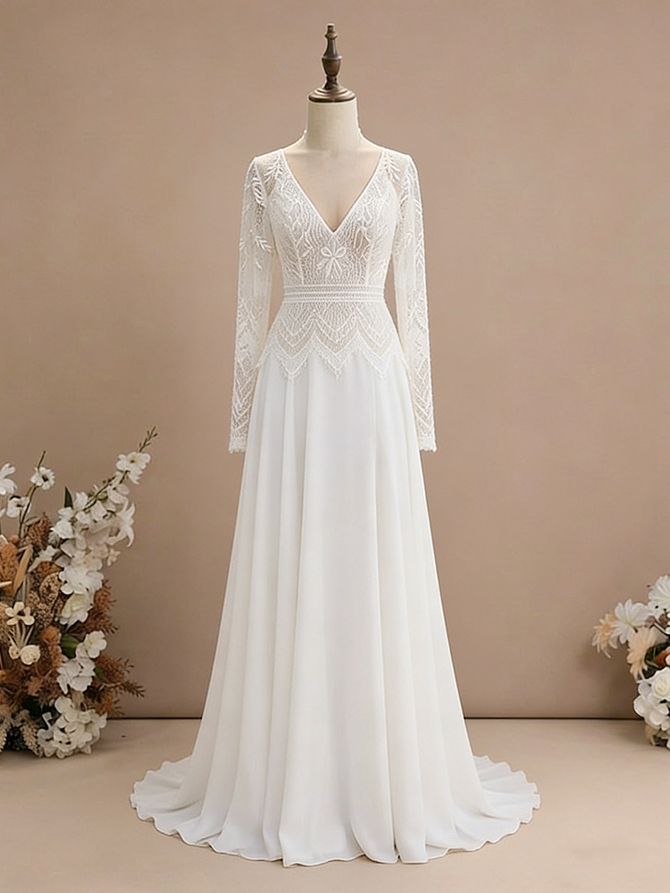 ツーピースの結婚式用ドレス、シフォン素材、Vネック、トレーン付き、ファスナー付き、長袖、ロング丈、ボヘミアン風ウェディングドレス