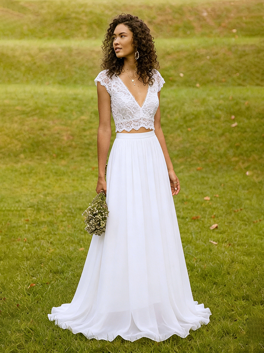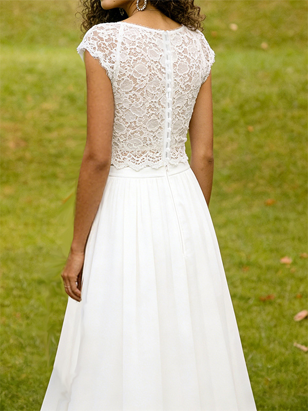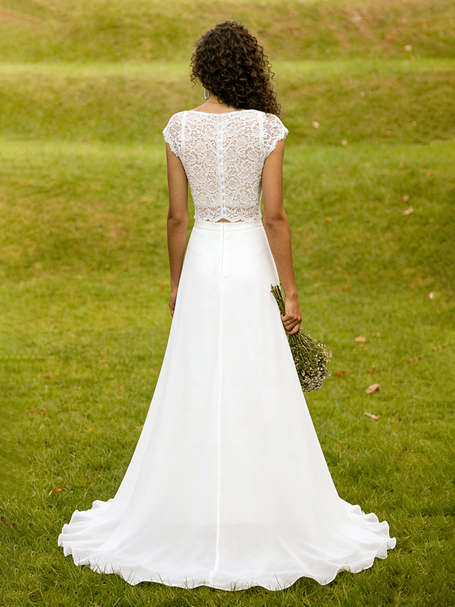 ツーピースウェディングドレス レース レース Vネック ツーピース トレーン付きウェディングドレス 機能的なボタン 半袖 ロング アイボリー