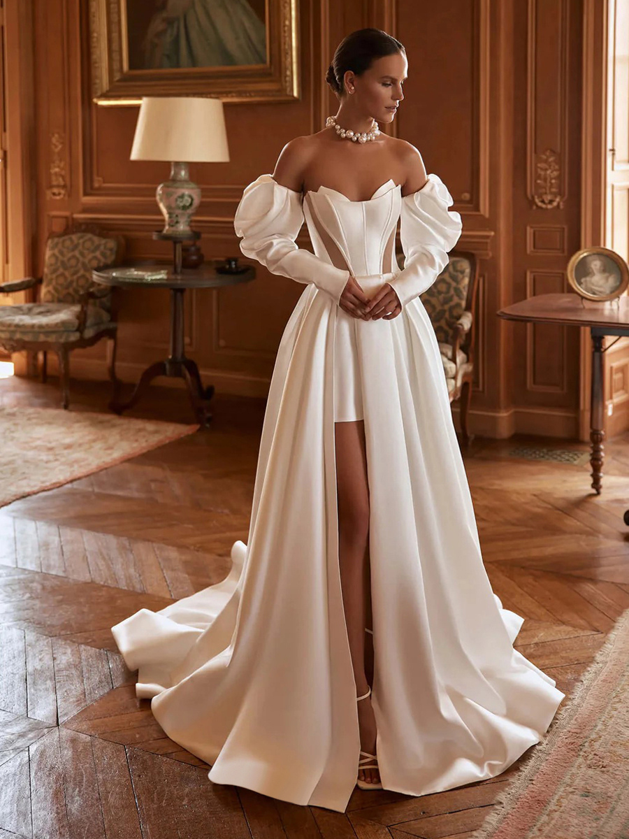 ツーピースウェディングドレス チュール カットアウトデザインネックライン ツーピース トレーン付き ジッパー 7分袖 ロング アイボリー