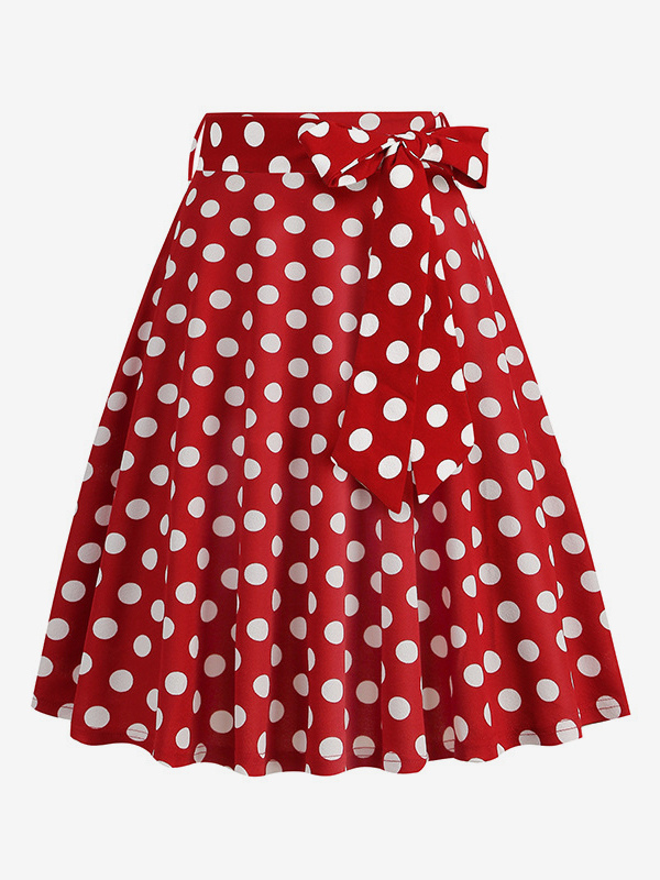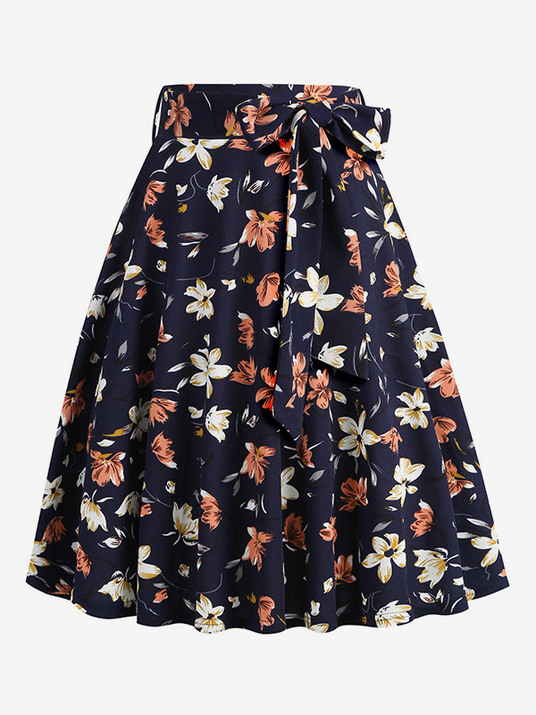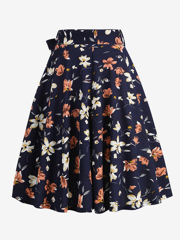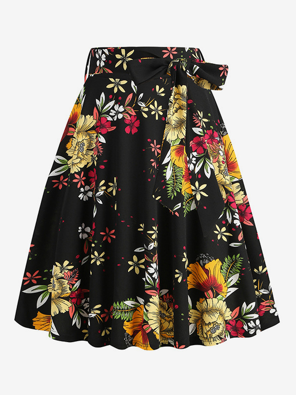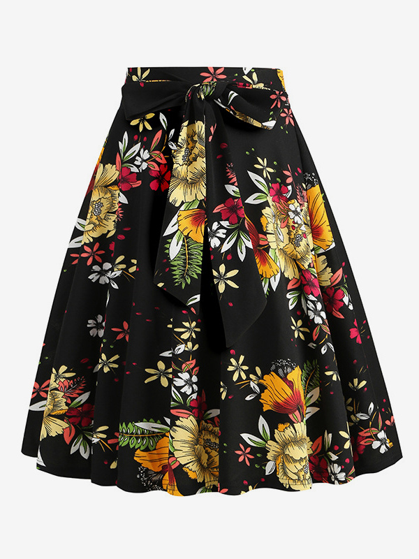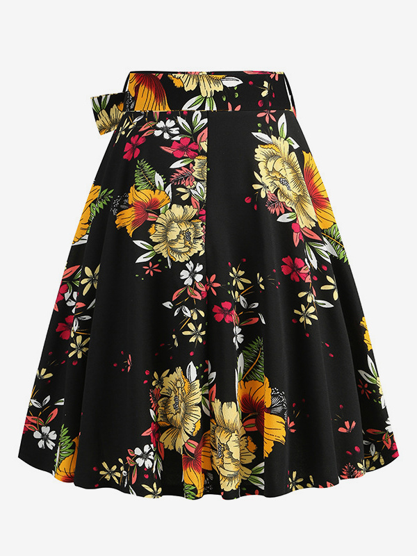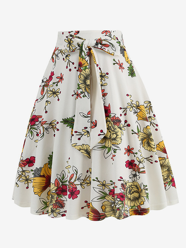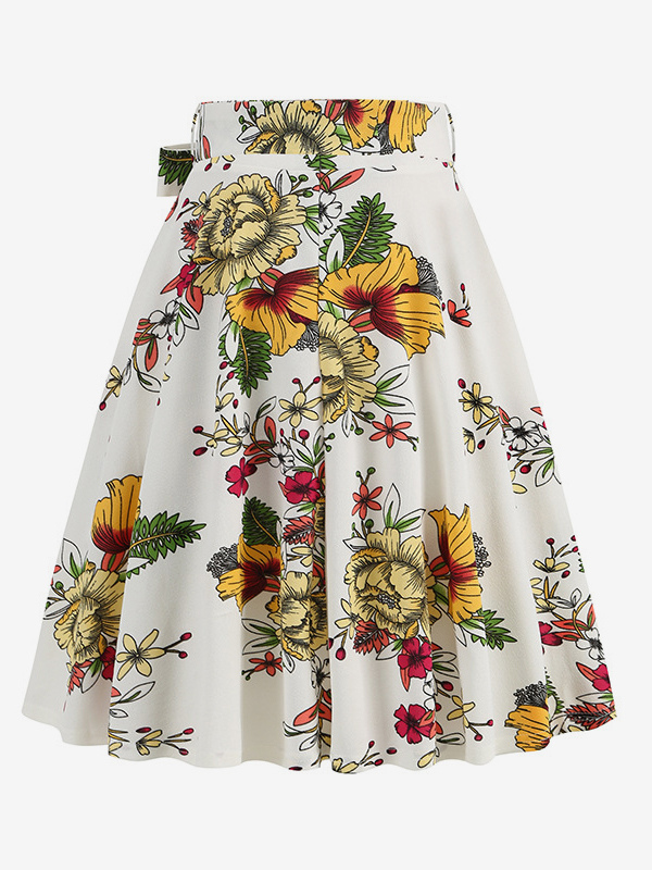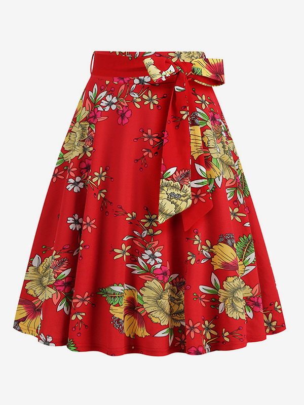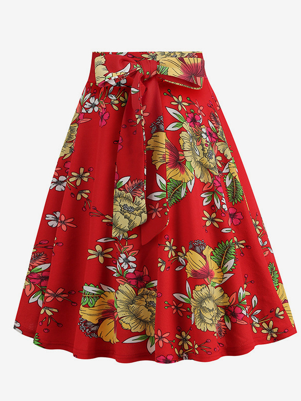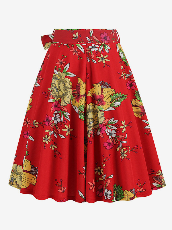 ヴィンテージ1950年代プリントスカート(レディース) - レトロなハイウエストAラインスイングミディスカート(ベルト付き) - 夏のトロピカルパーティー2026