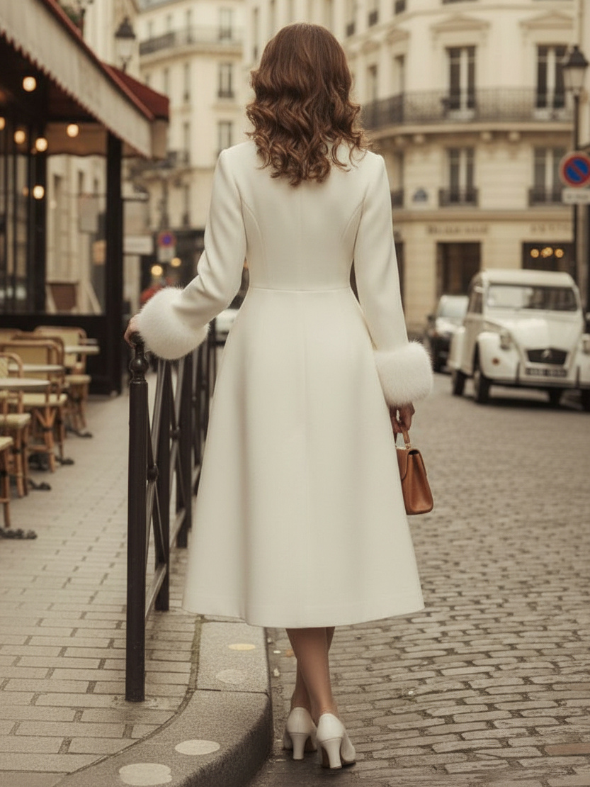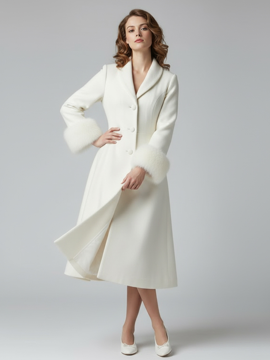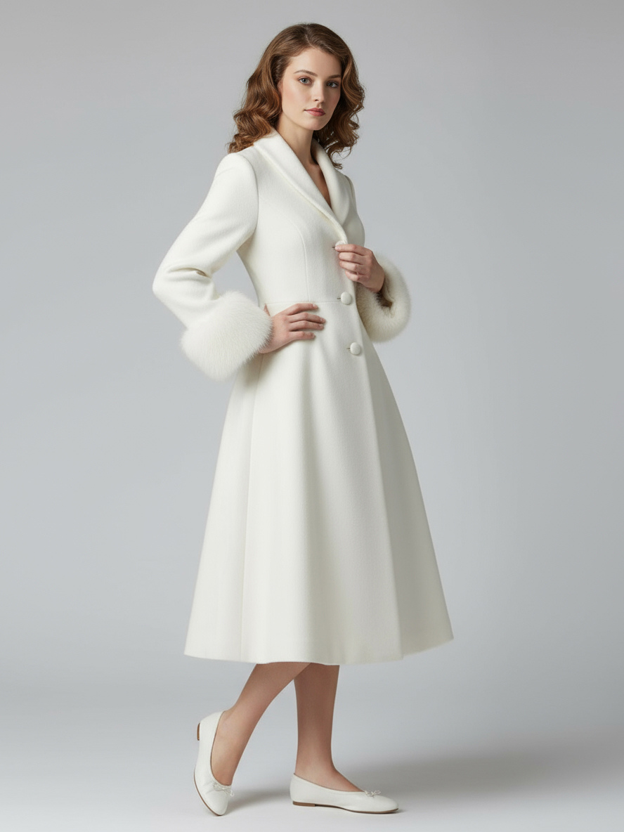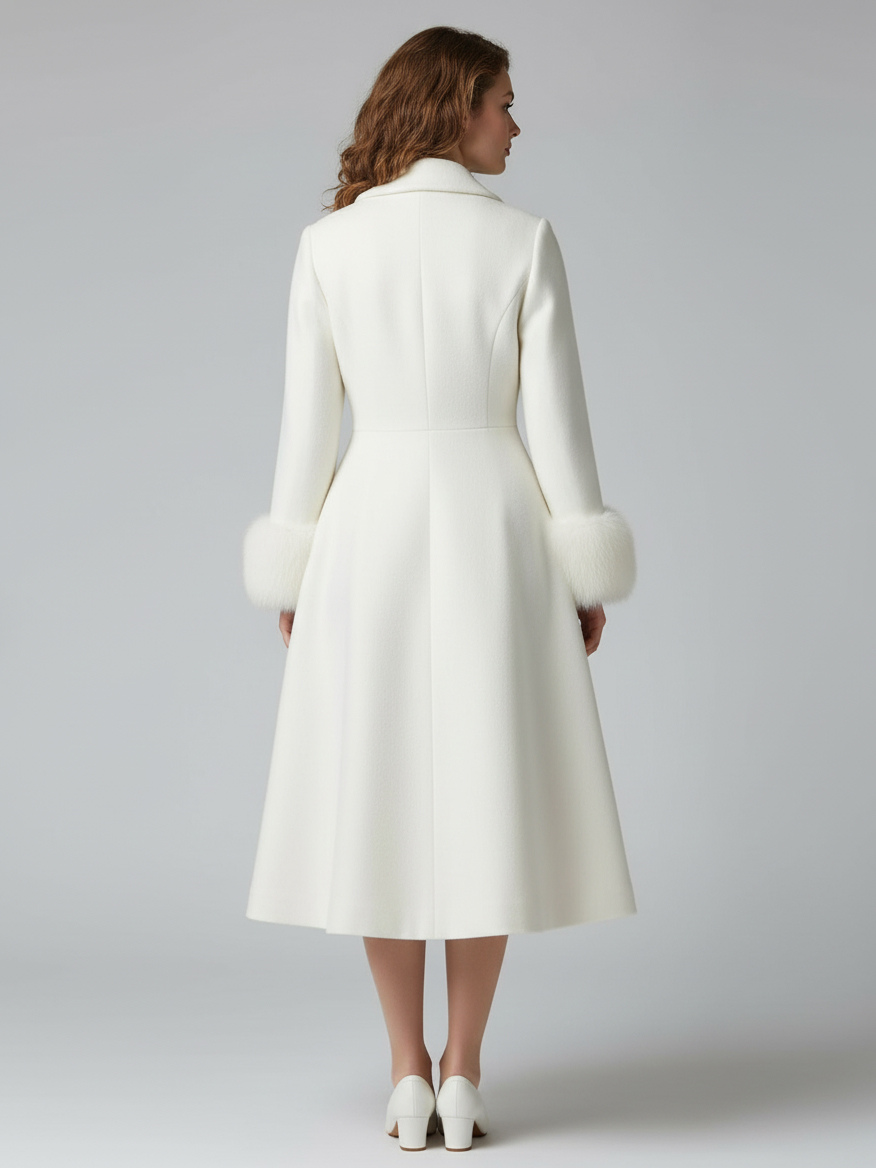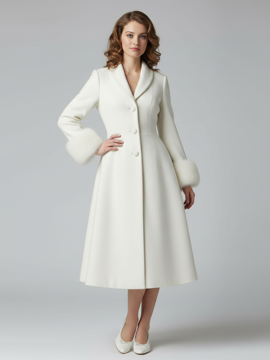 ヴィンテージAラインウールフレアミディコート(取り外し可能なフェイクファーカフス付き、ホワイト)2025年モデル