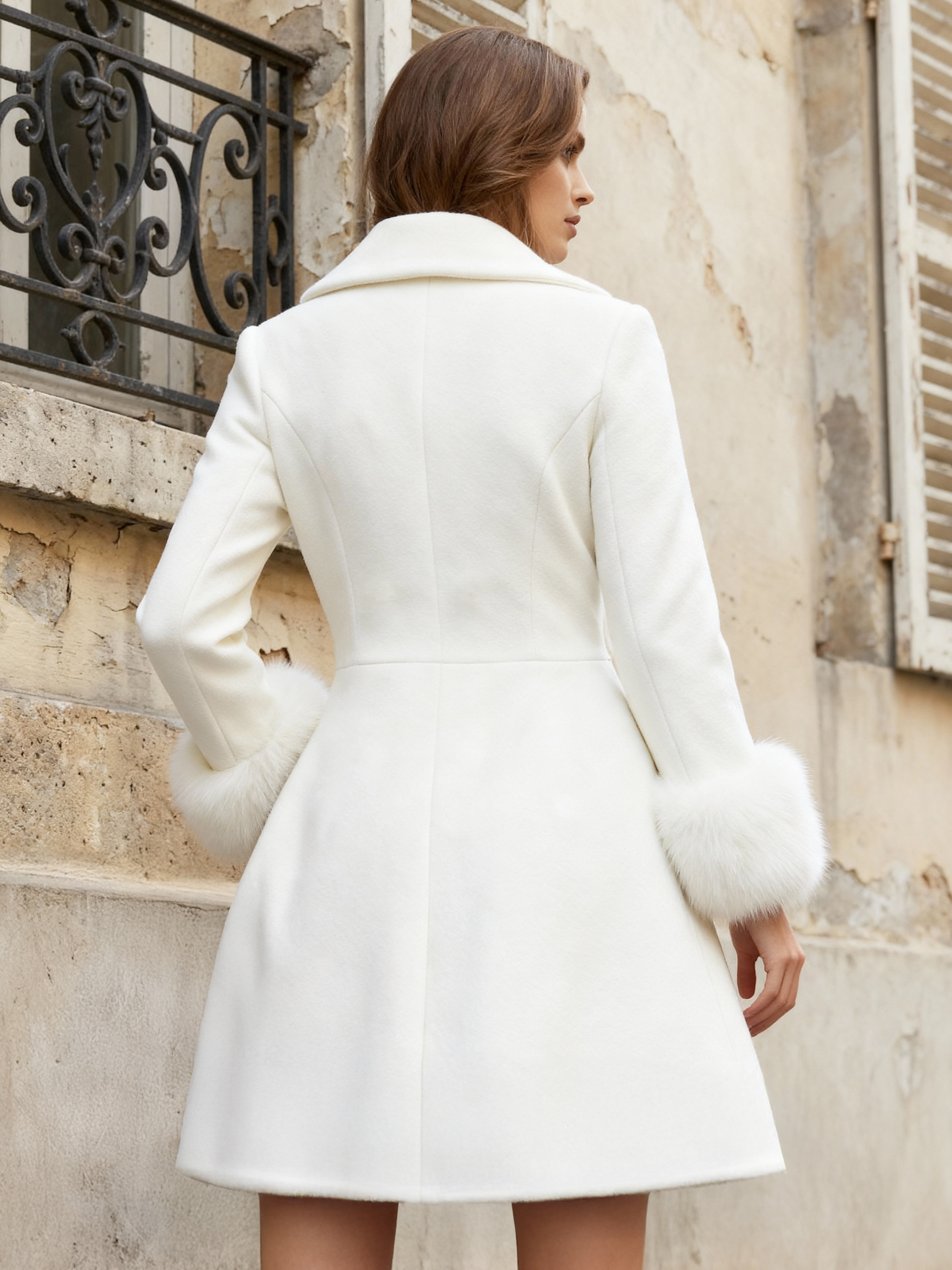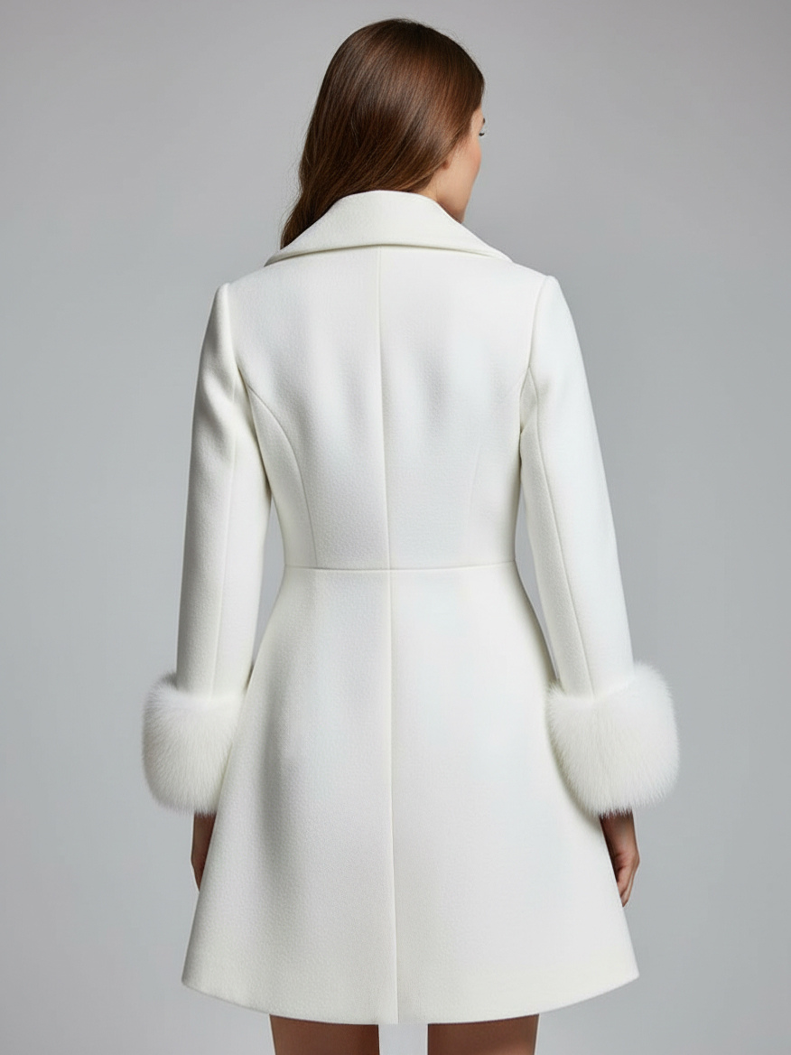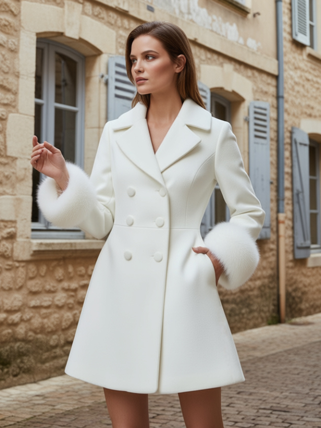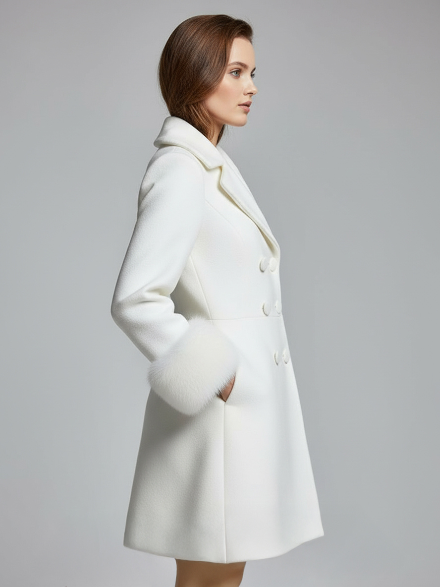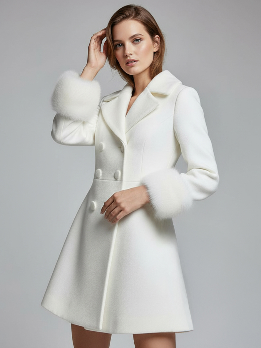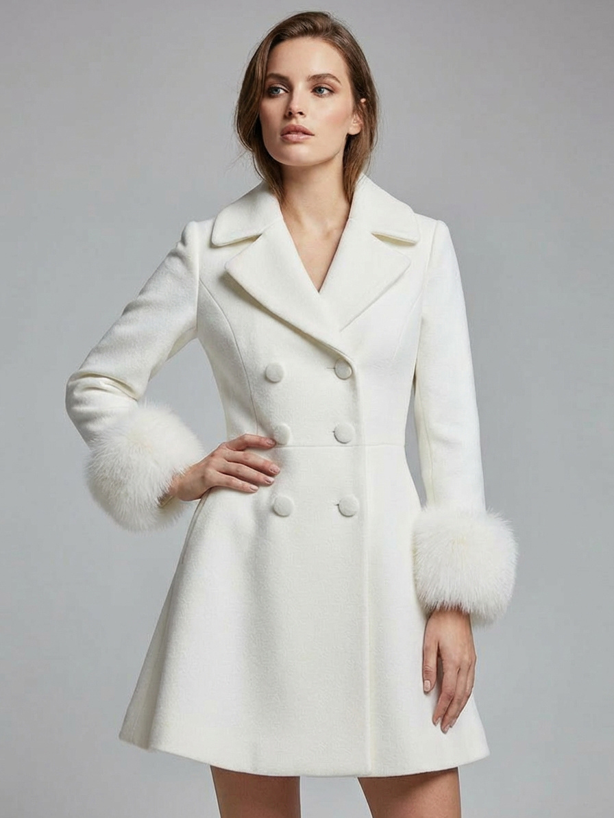 ワイドラペルとフェイクファーカフス付きホワイトダブルブレストウールブレンドコート(レディース2025年)