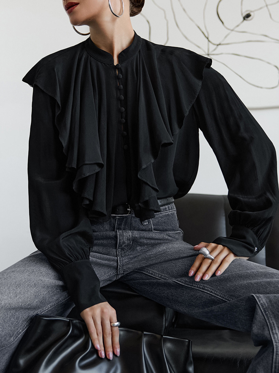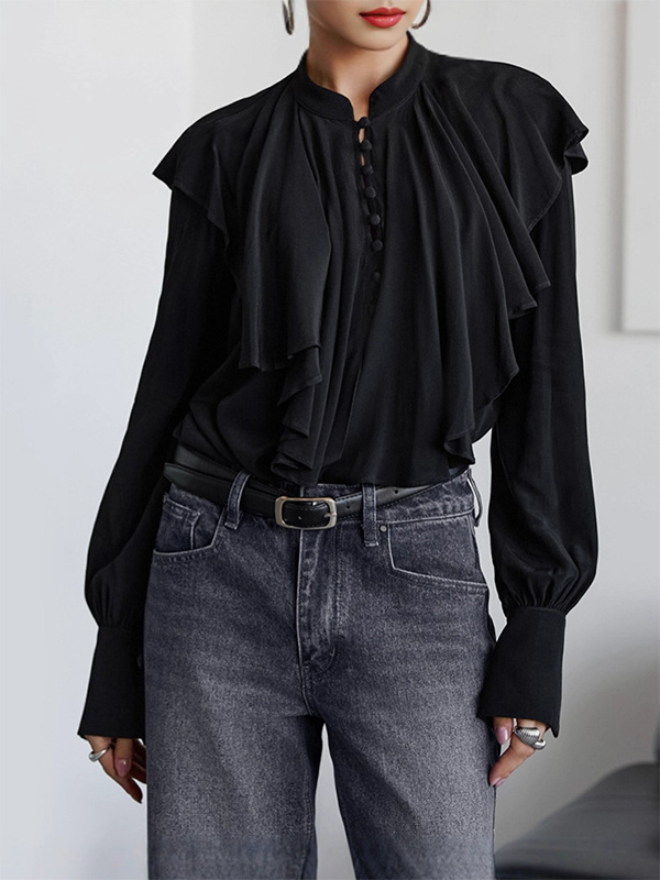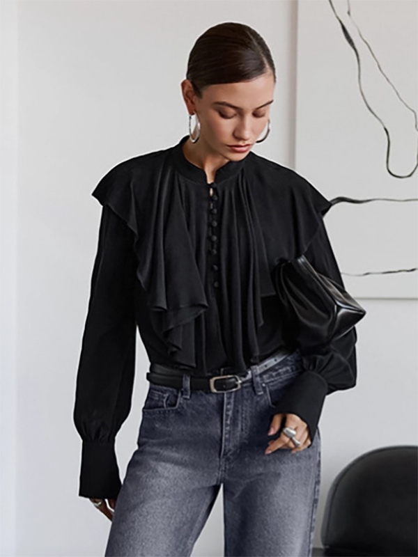 ヴィンテージ風フリルブラウス(レディース) - ブラック、エレガントなボタンアップ、ビクトリア調長袖トップス - 春のオフィスからディナーまで対応 2026