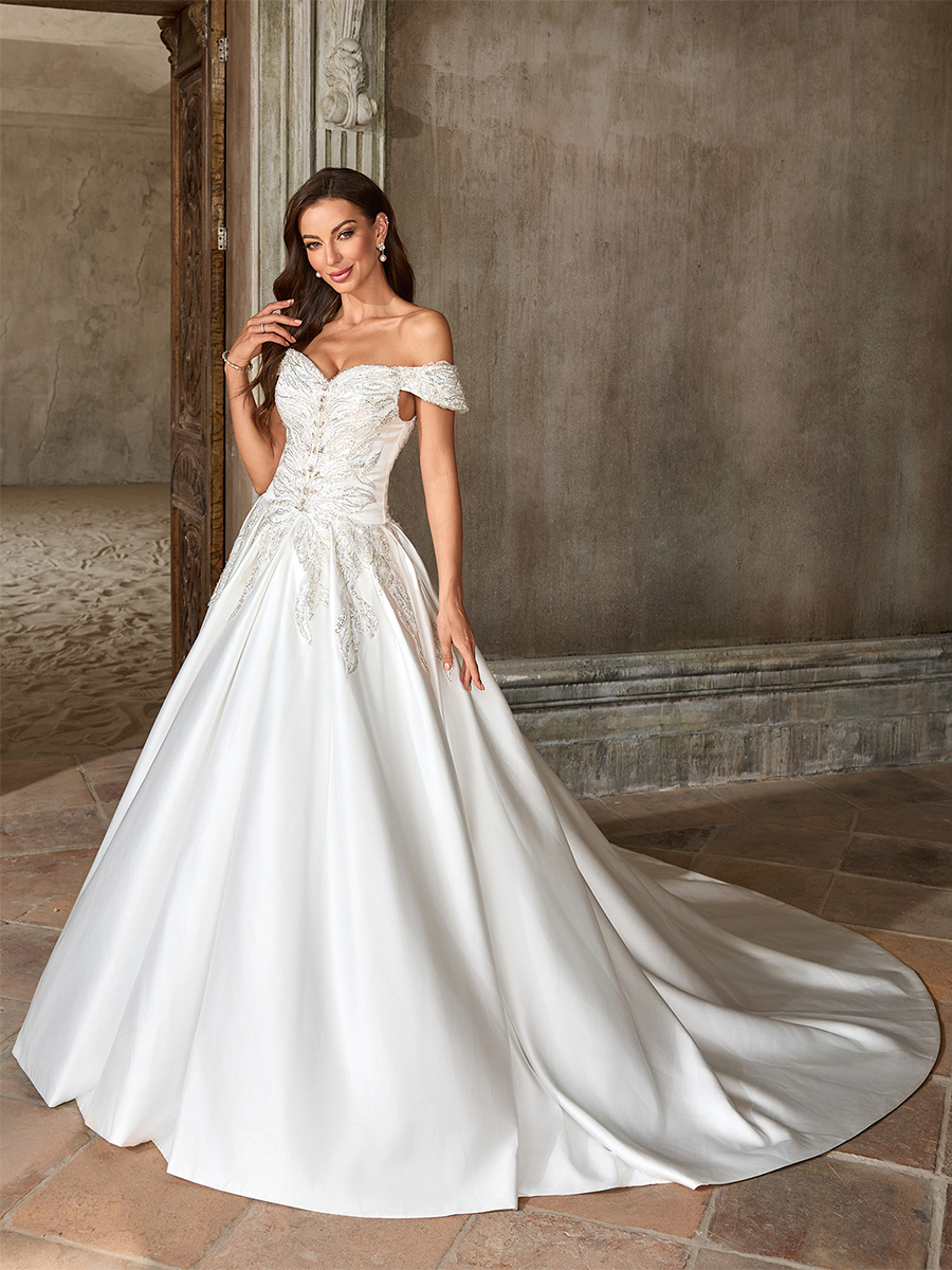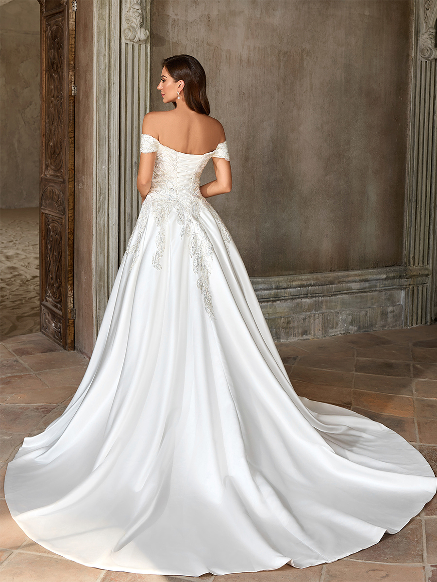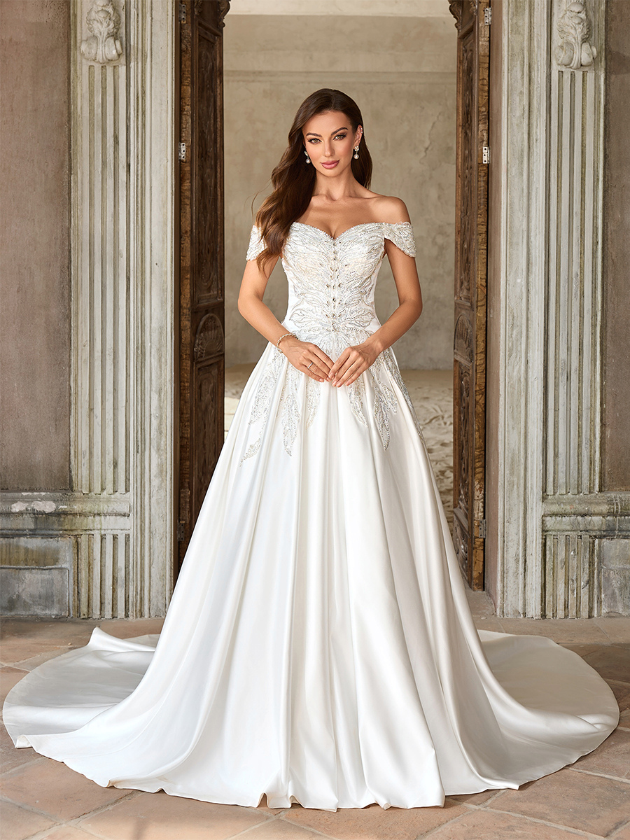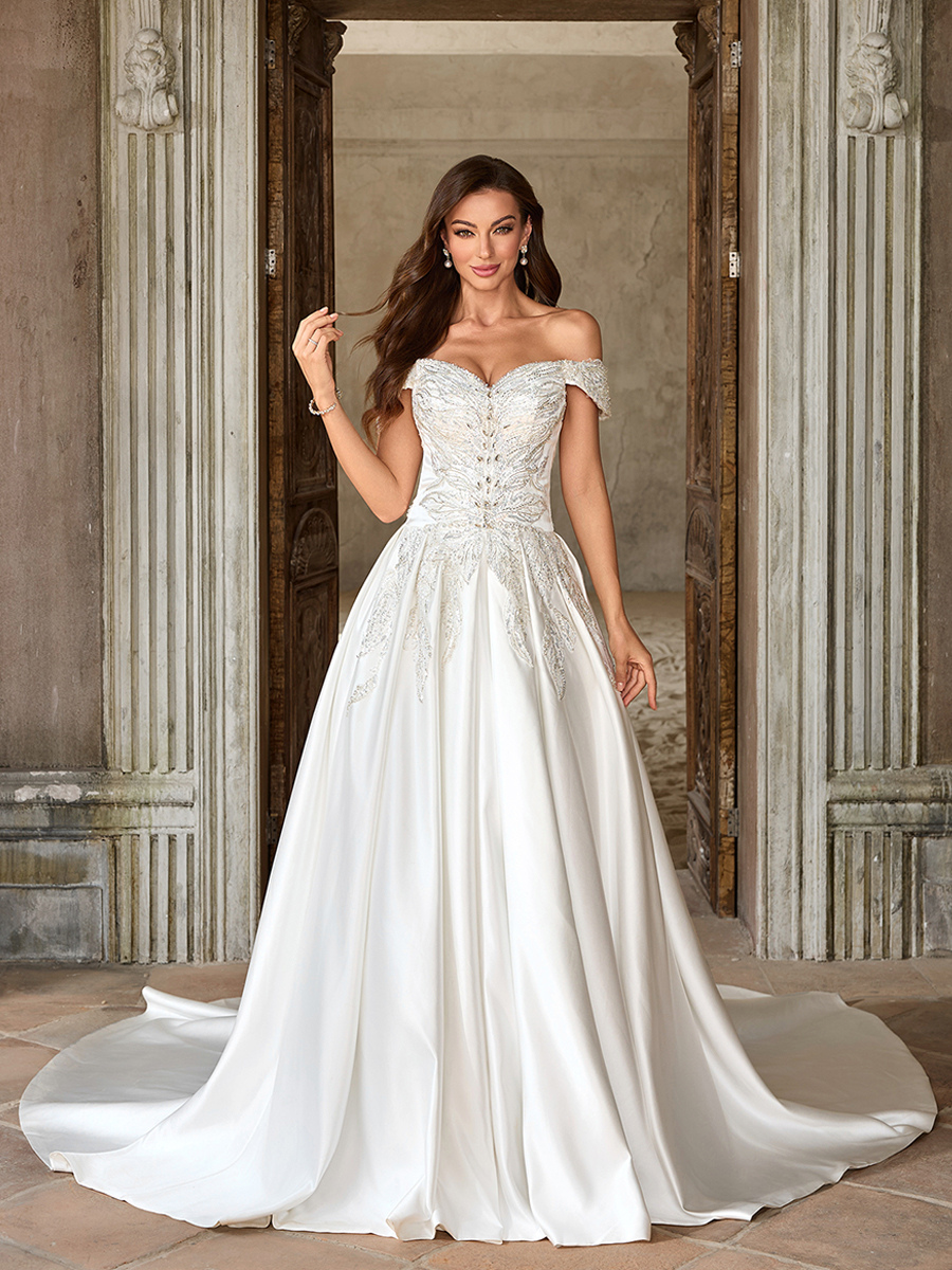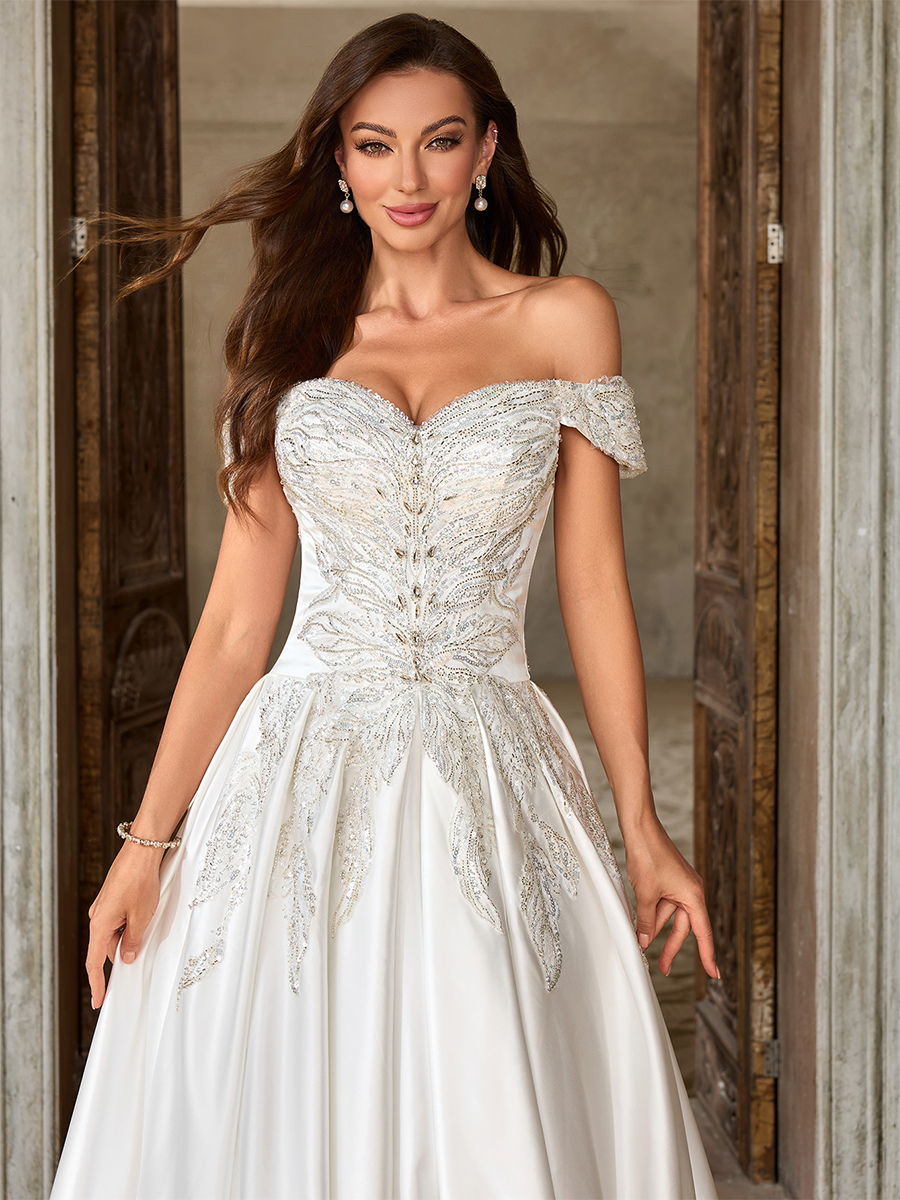ヴィンテージウェディングドレス ラグジュアリーウェディングドレス ホワイト 大人のウェディング Aライン トレーン付き ストラップレス ビーズ 半袖 ユーロスタイル オープンショルダー