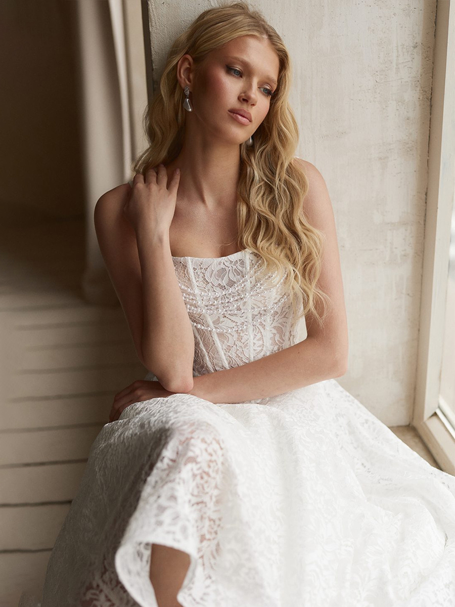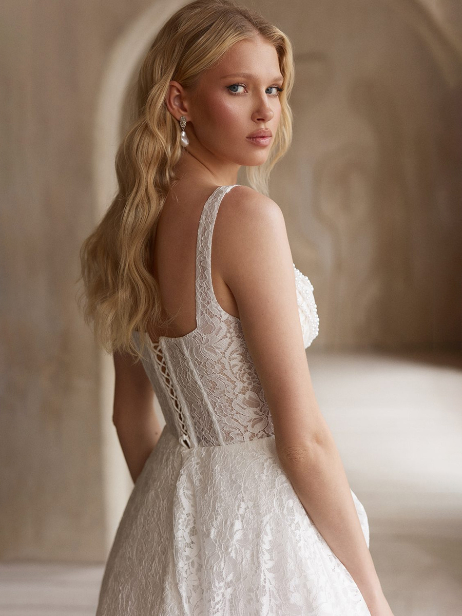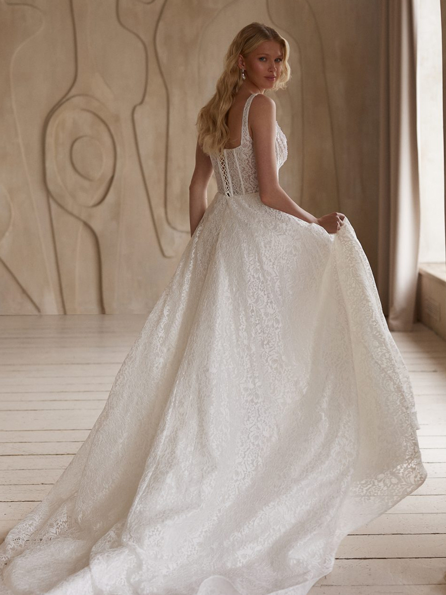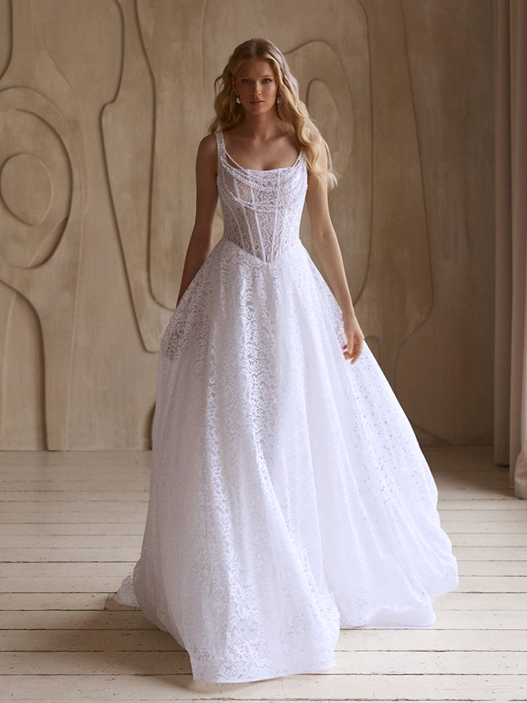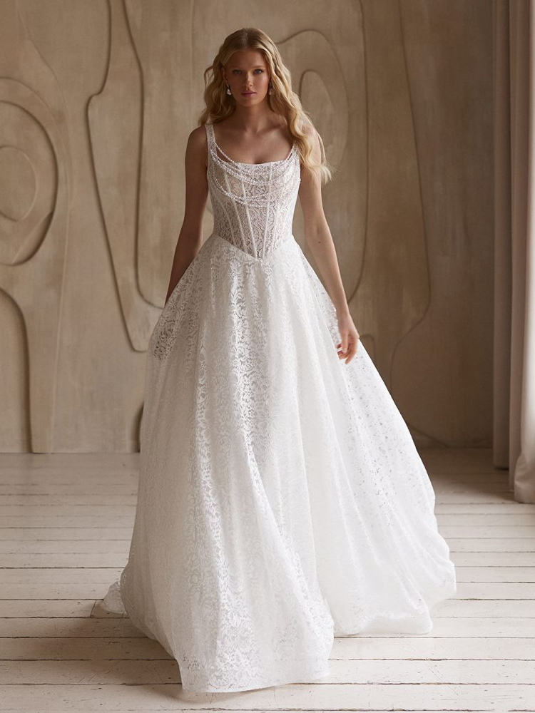 ヴィンテージウェディングドレス、Aライン、ノースリーブ、レースデザイン、ネックライン、ブライダルガウン