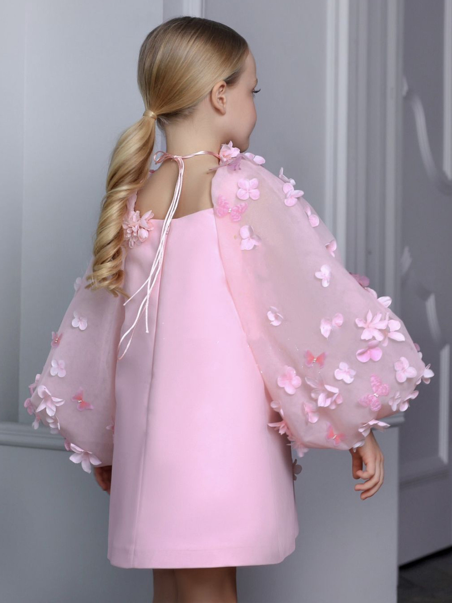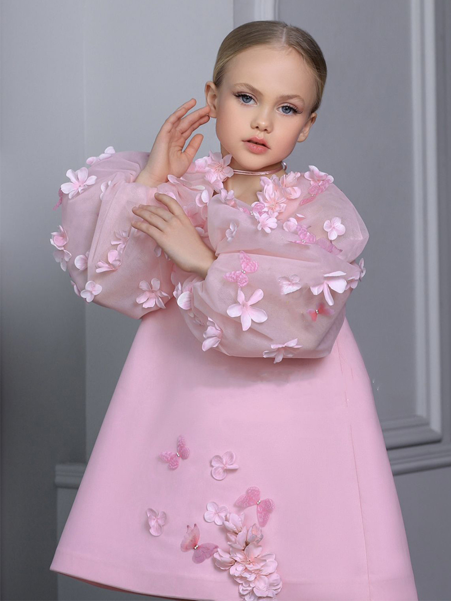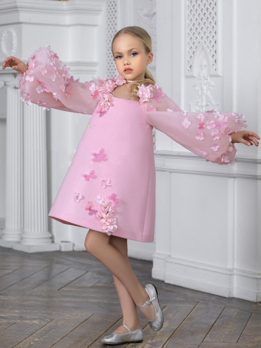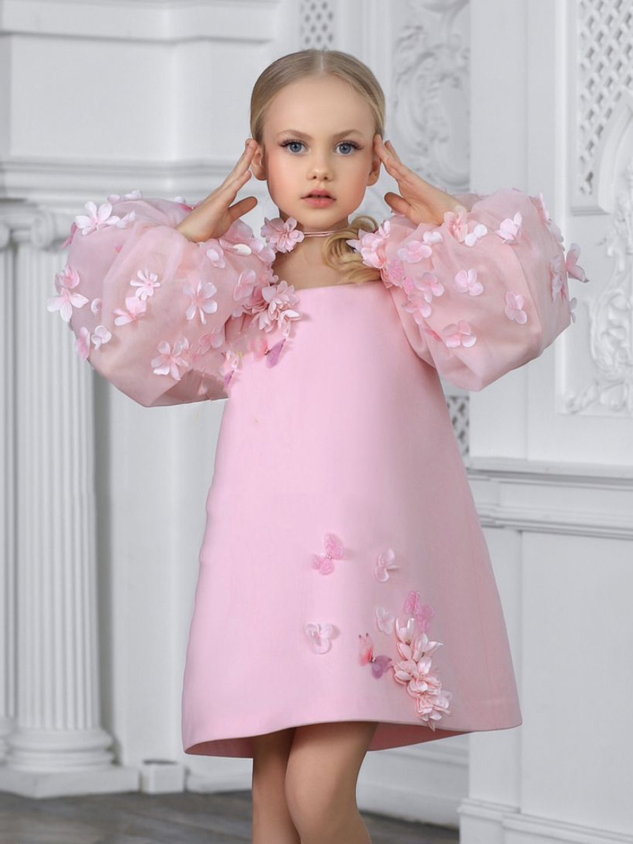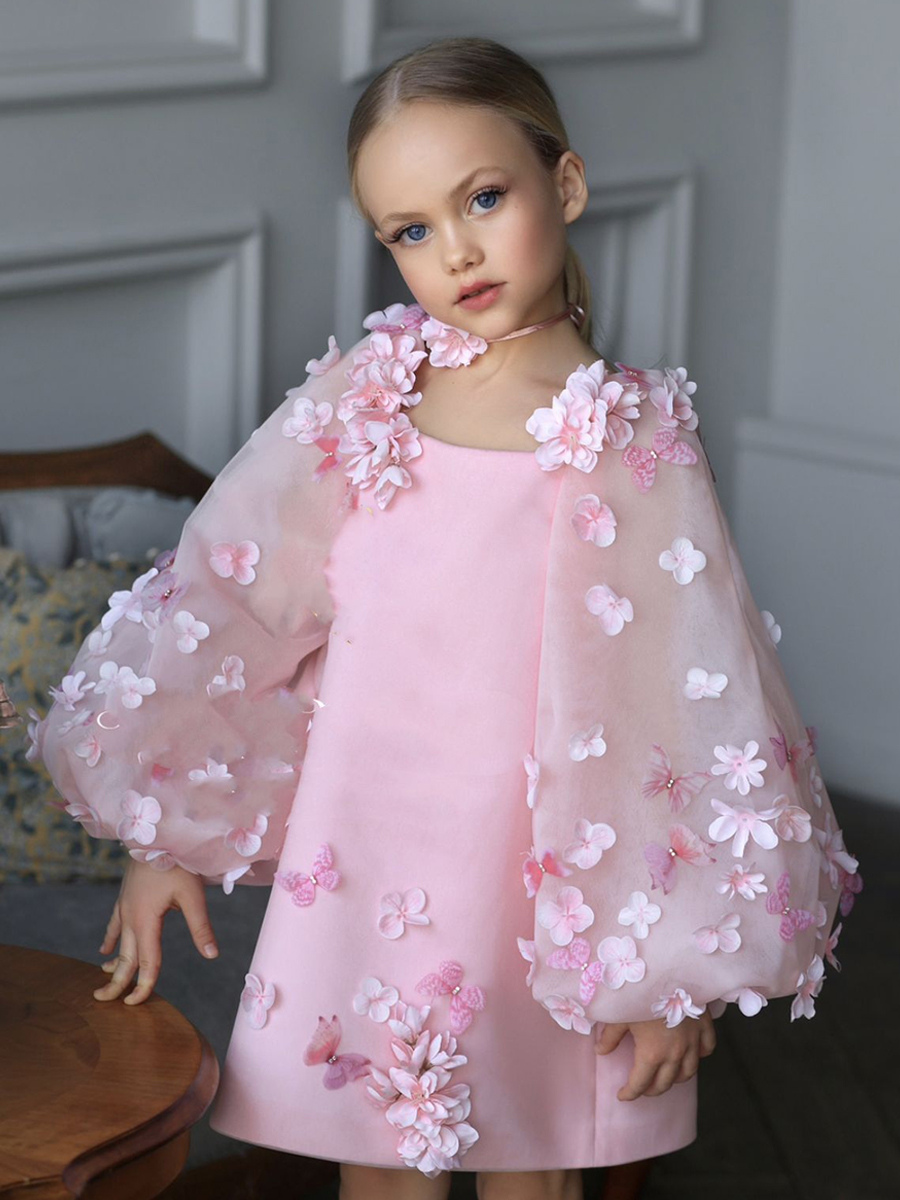 ウェディングフラワーガールドレス 特別な日のドレス ピンク 長袖 アップリケ