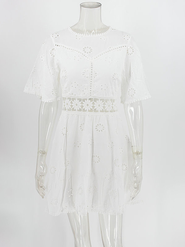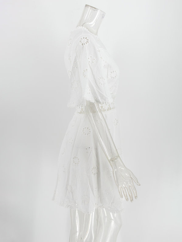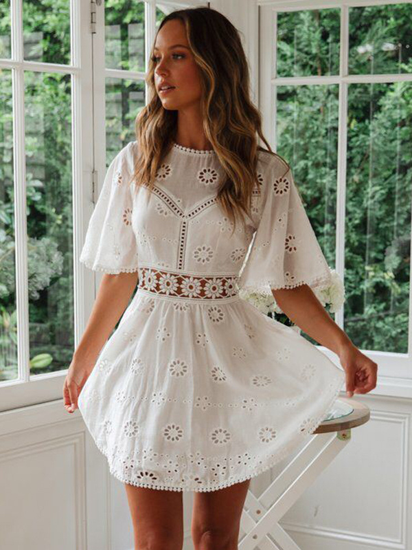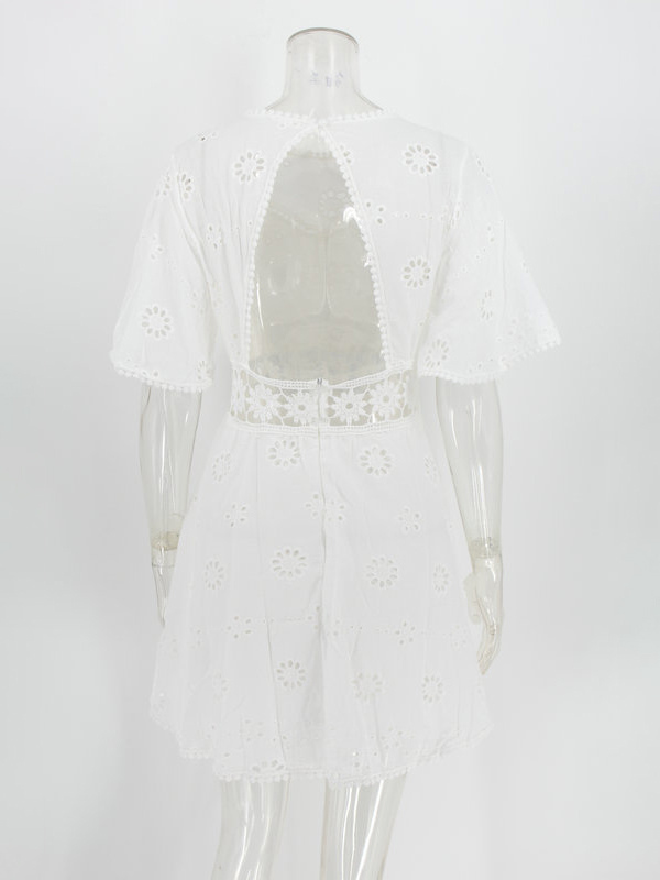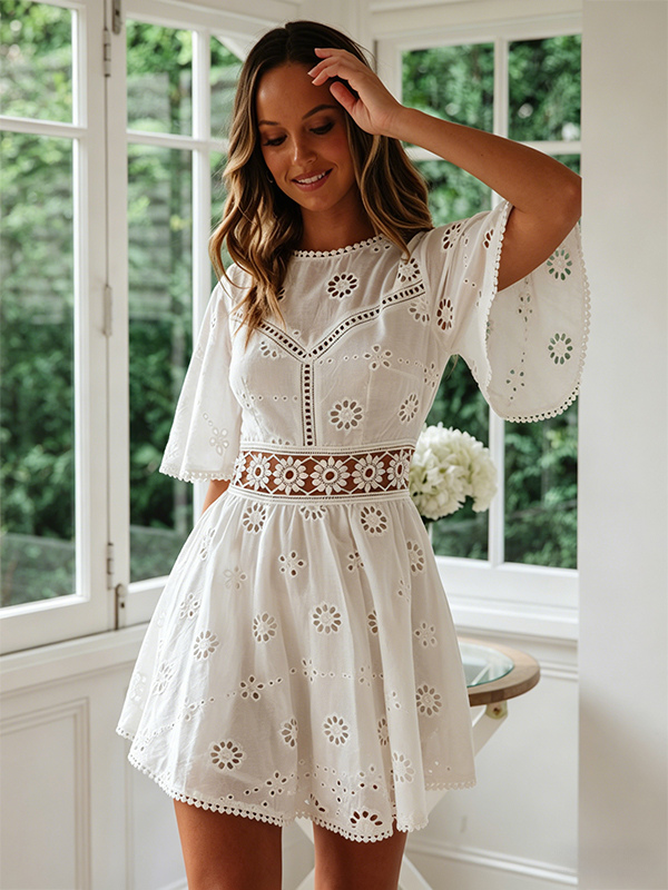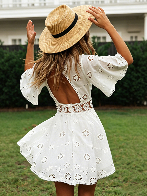 ホワイトアイレットバックレスミニドレス(女性用) - ボヘミアンフレアスリーブフィット&フレアコットンサマードレス - 2026年夏のビーチバケーション