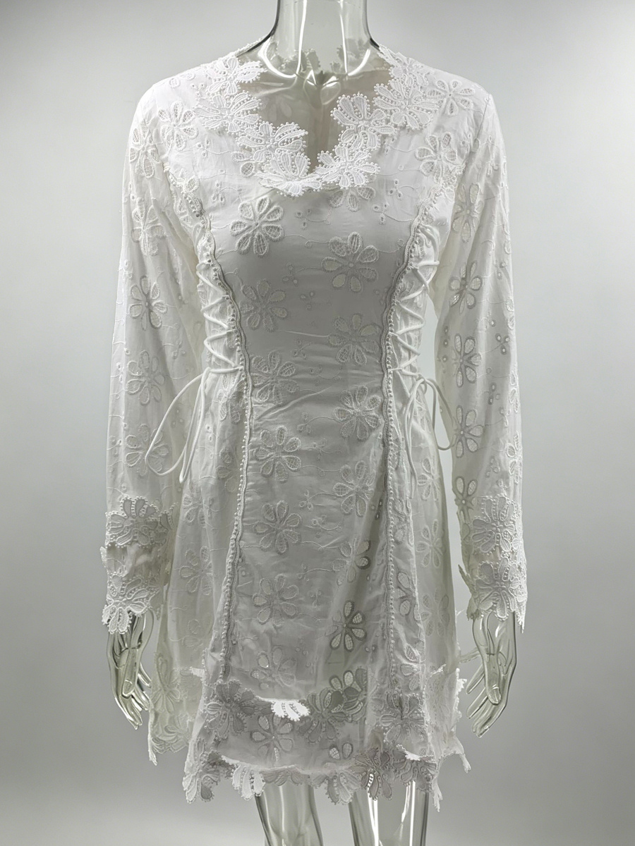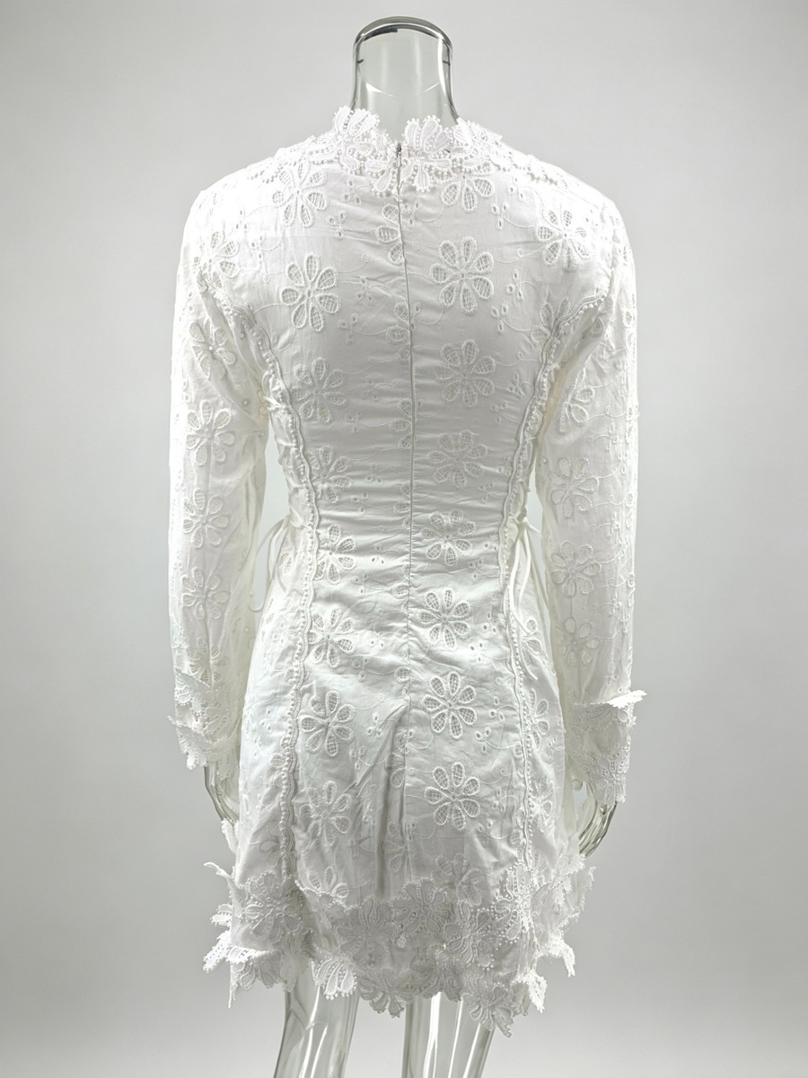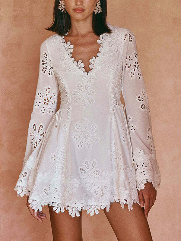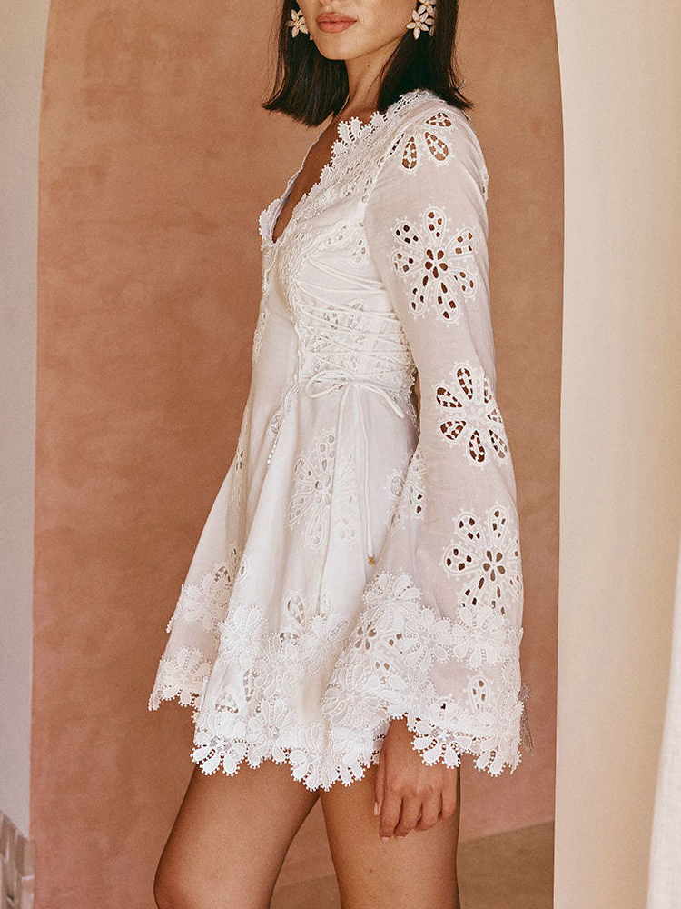 ホワイトアイレットレースミニドレス(レディース) - ボヘミアン風Vネック長袖サイドレースアップフィット&フレアドレス - 2026年春リゾートコレクション