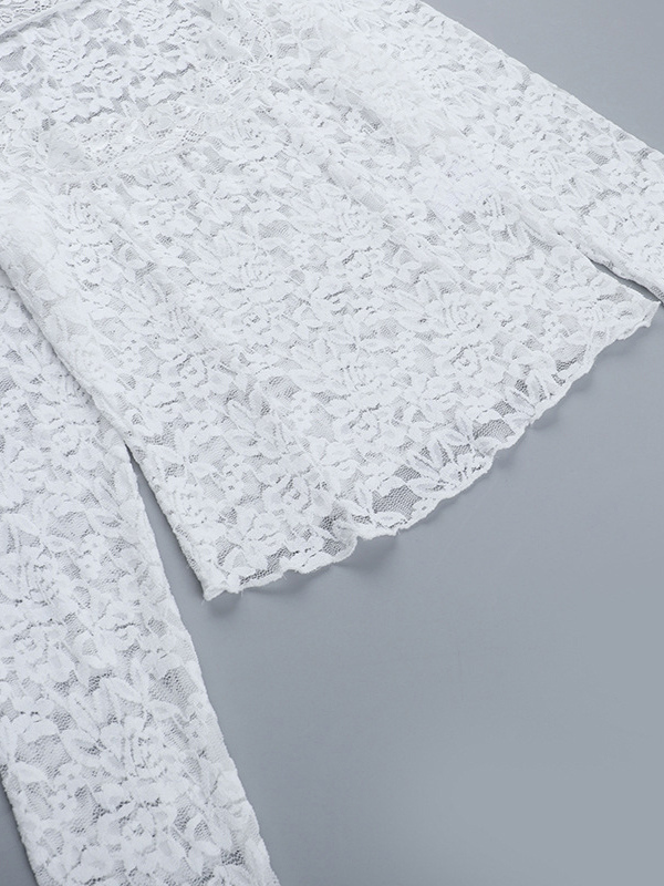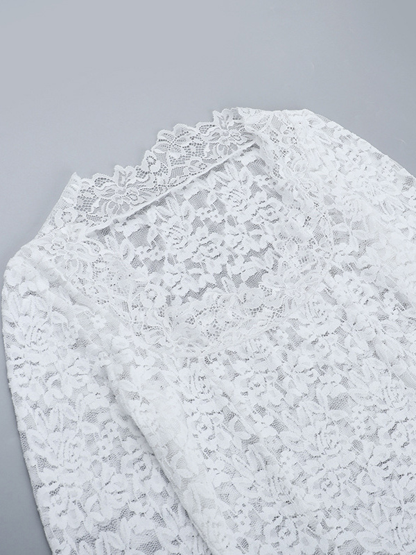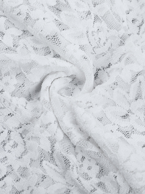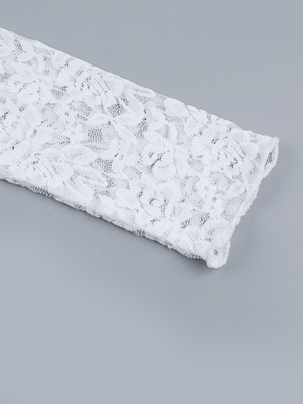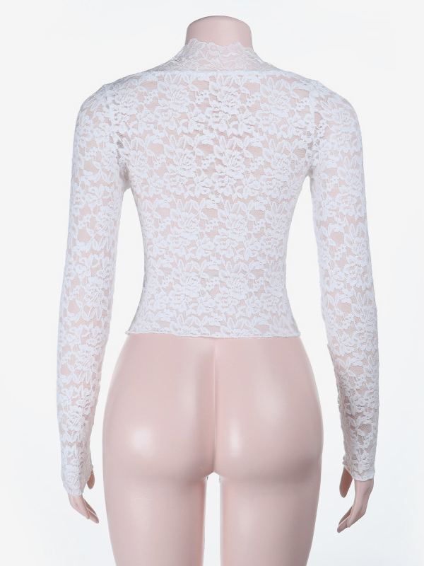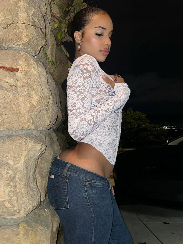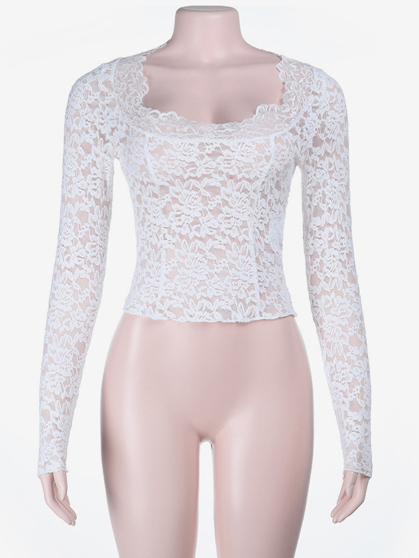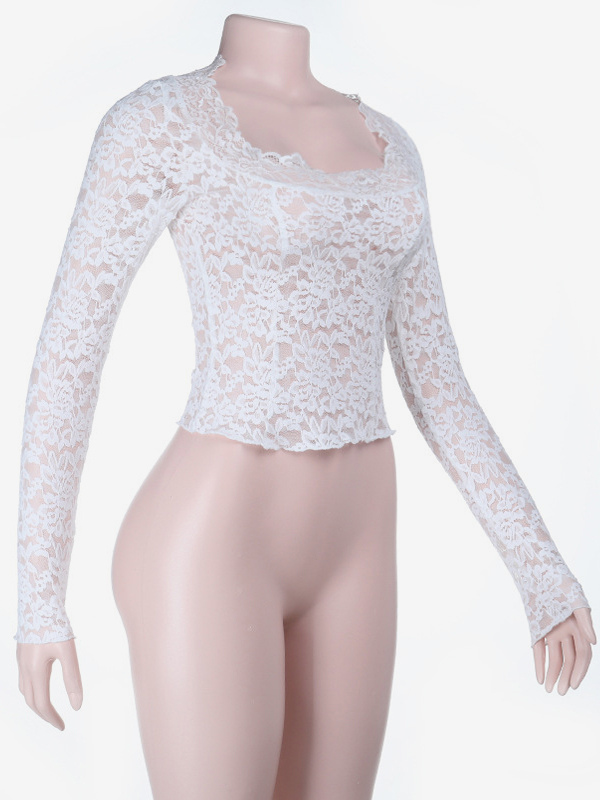 ホワイトフローラルレースシアーレディースクロップトップ - スカラップスクエアネック長袖ブラウス - コケットな雰囲気のフレンチロマンティックな外出用トップス 2026