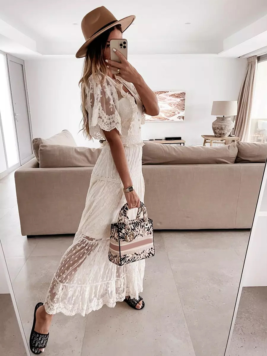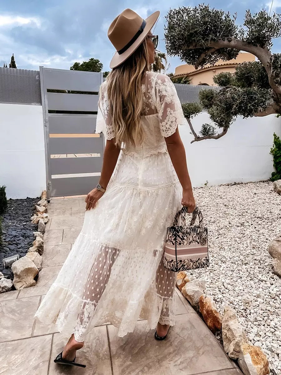 Vネックと半袖のホワイトレースボヘミアンマキシドレス 2026