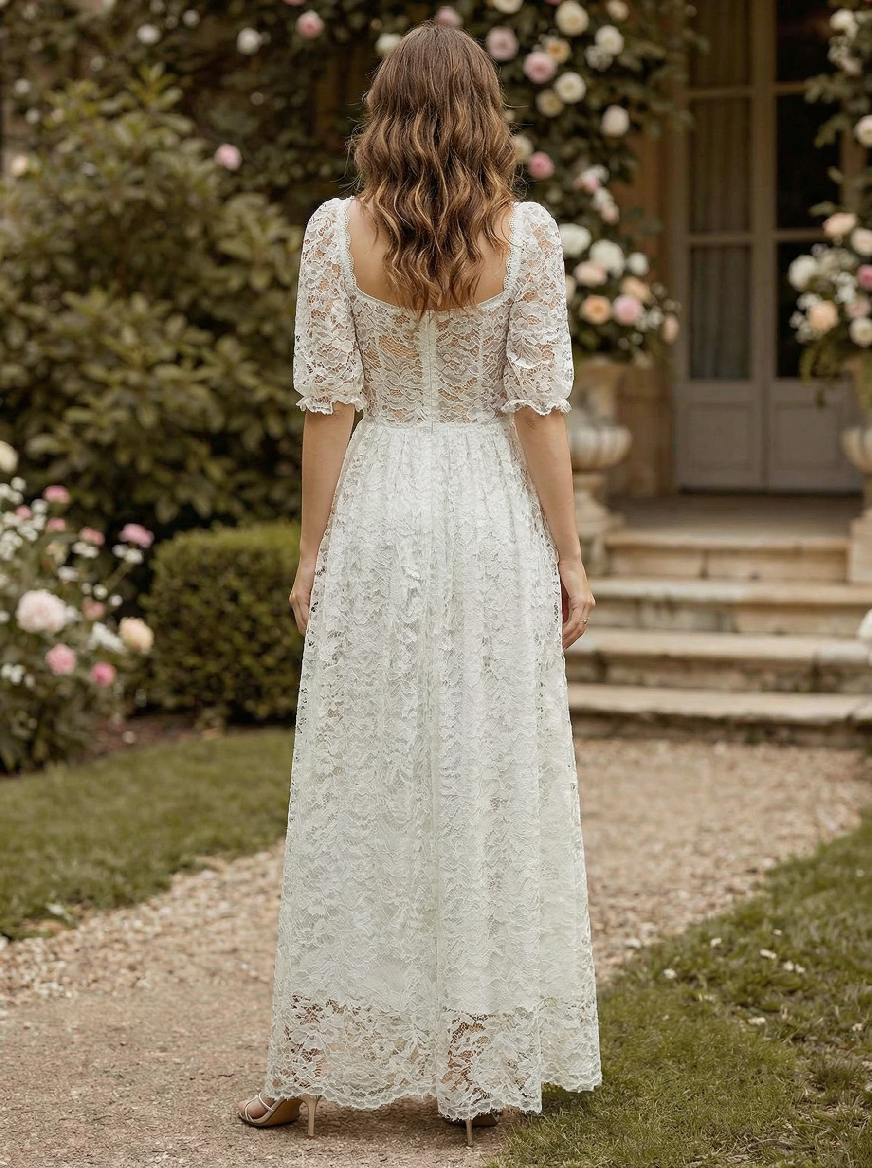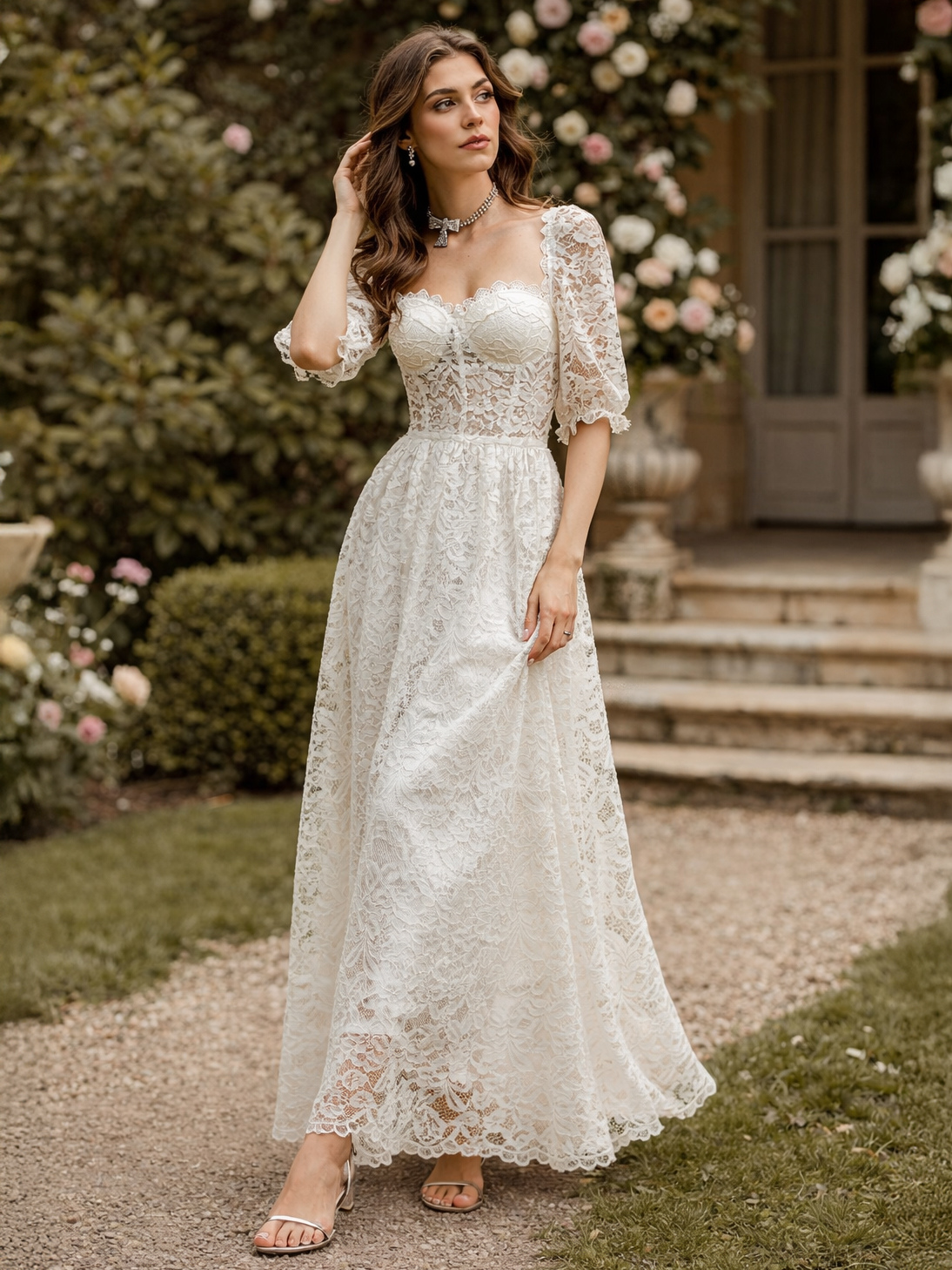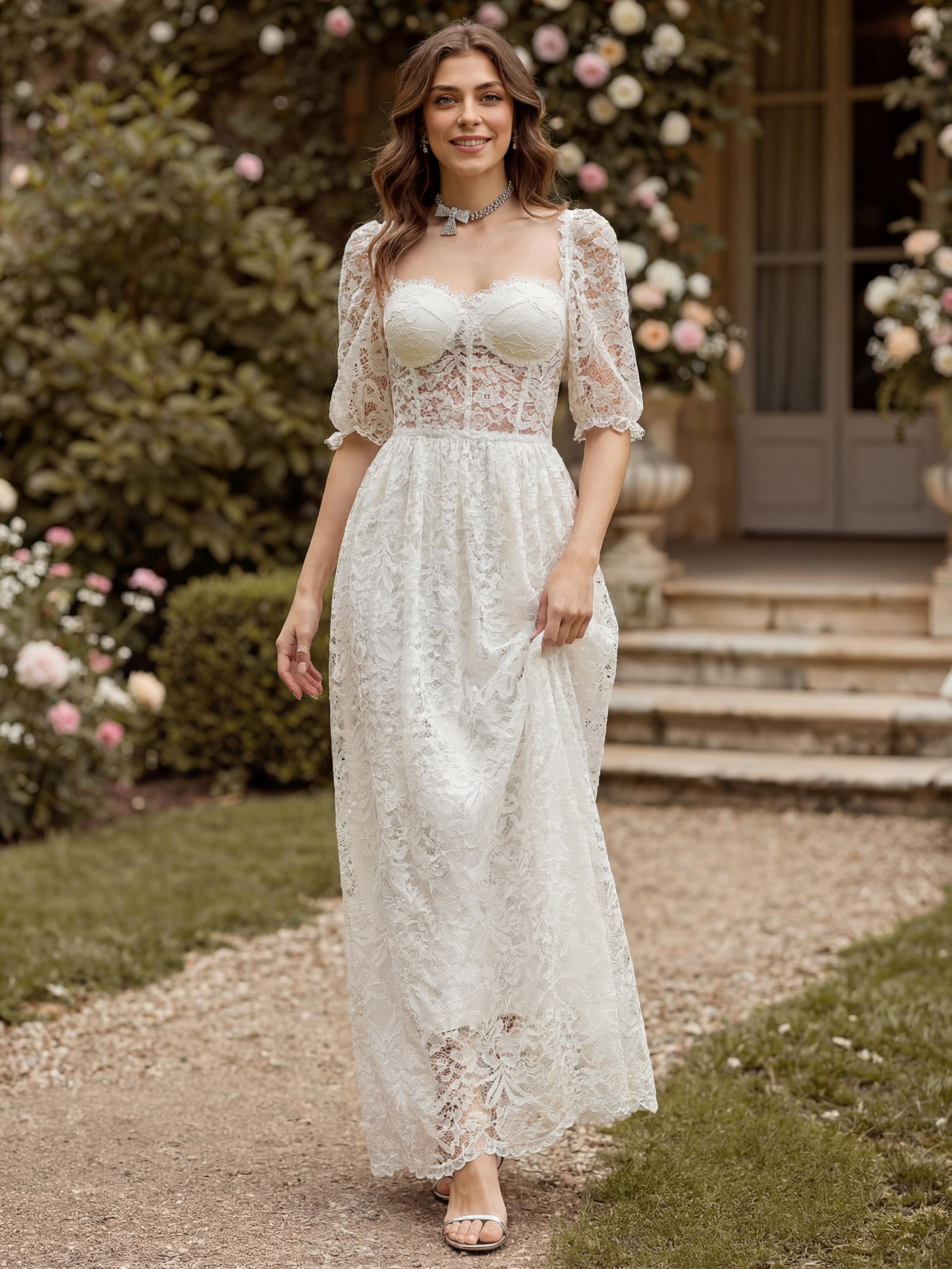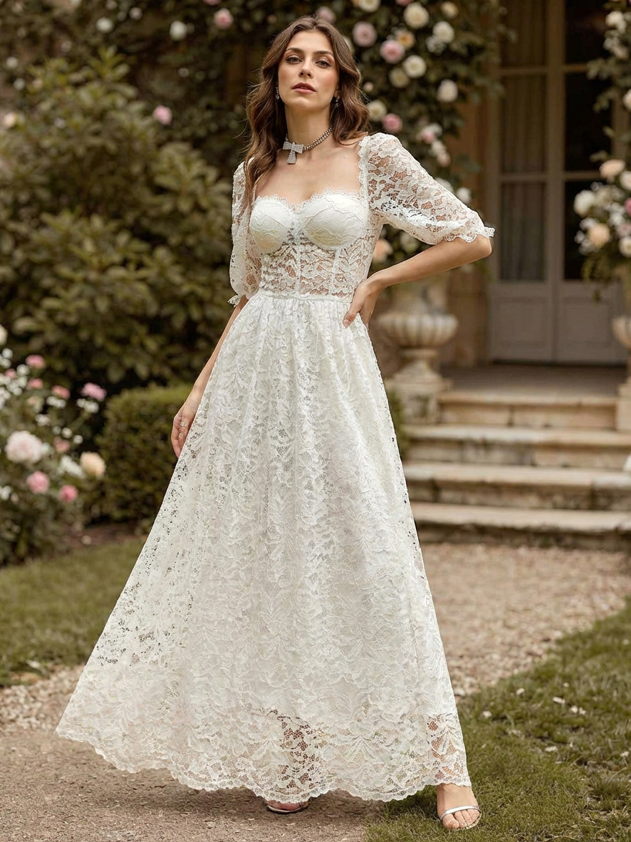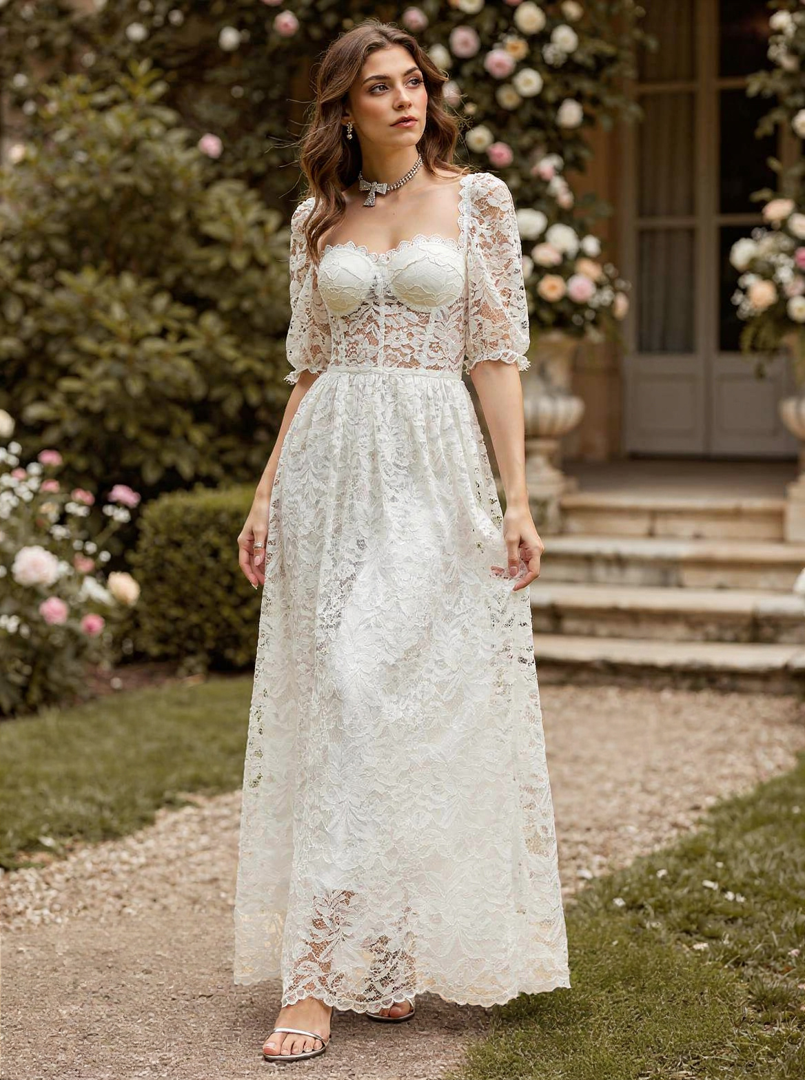 パフスリーブとシースルーウエストのホワイトレースマキシコルセットドレス 2026