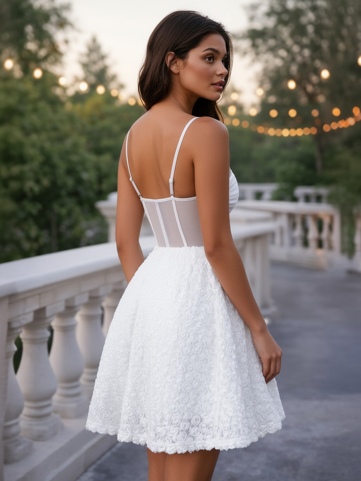 花飾りとシースルーウエストが特徴のホワイトミニスリップドレス 2026