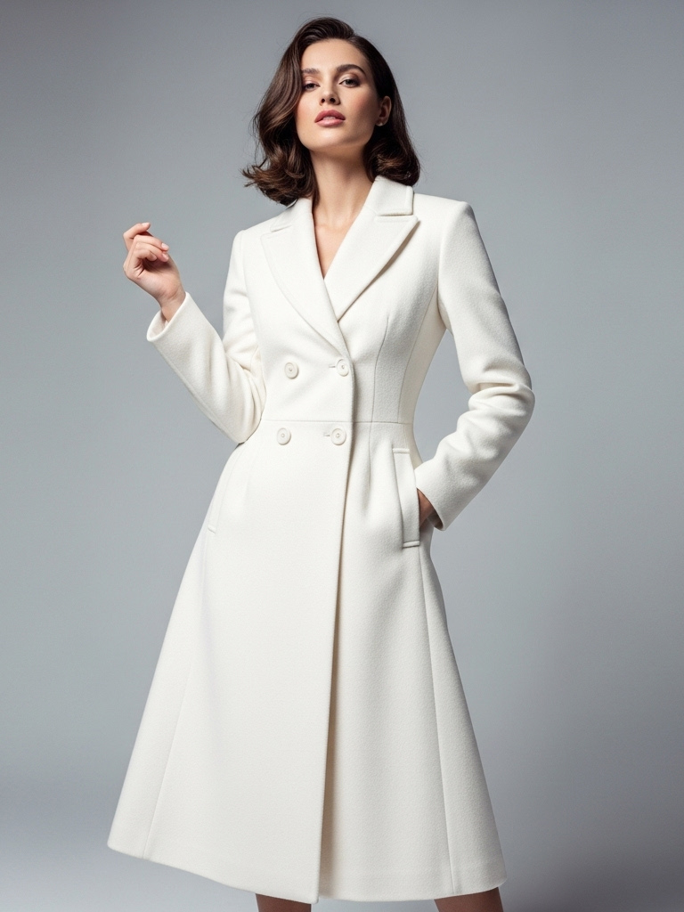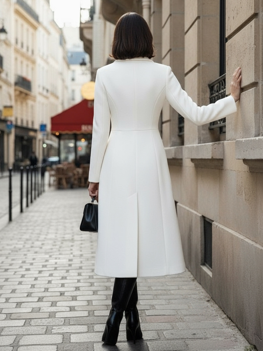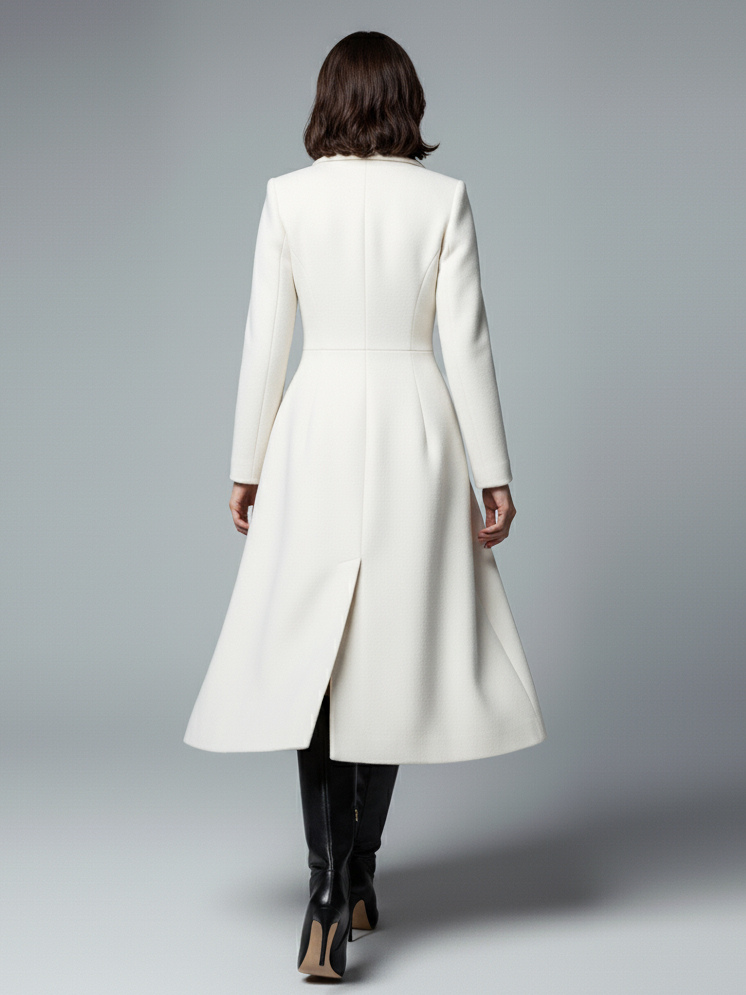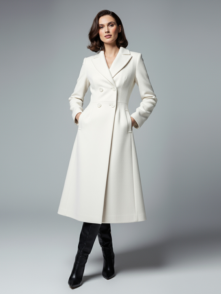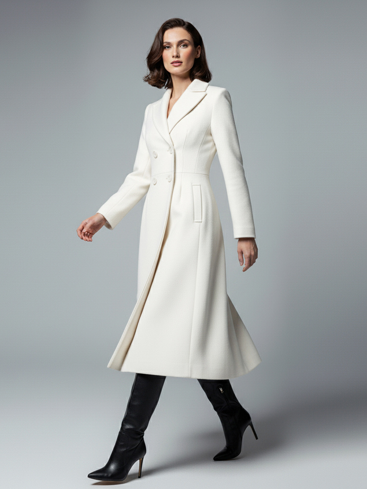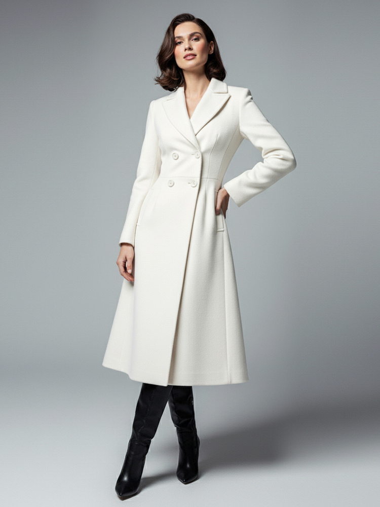 シャープなラペルとXラインが特徴のホワイトウールのダブルブレストミディコート(レディース 2025年モデル)