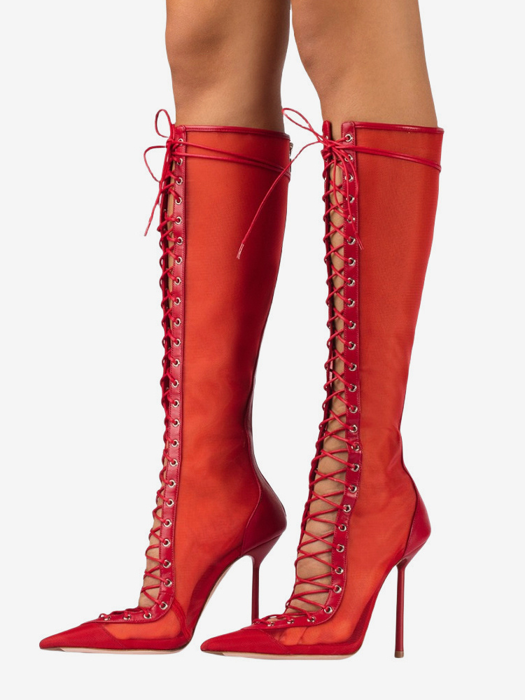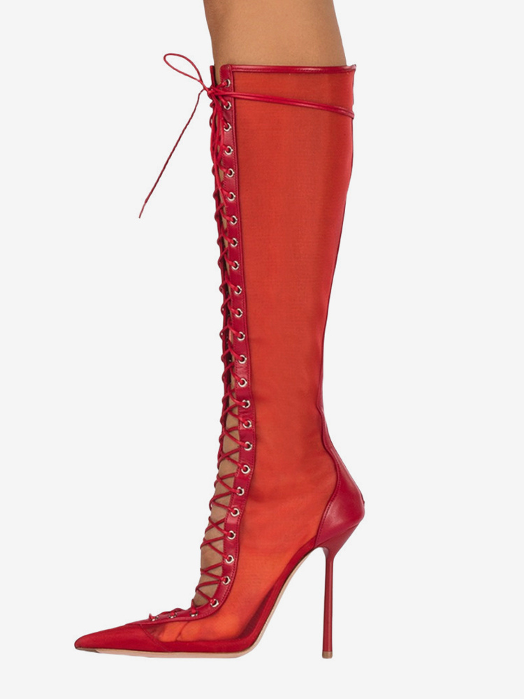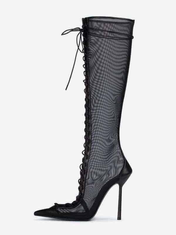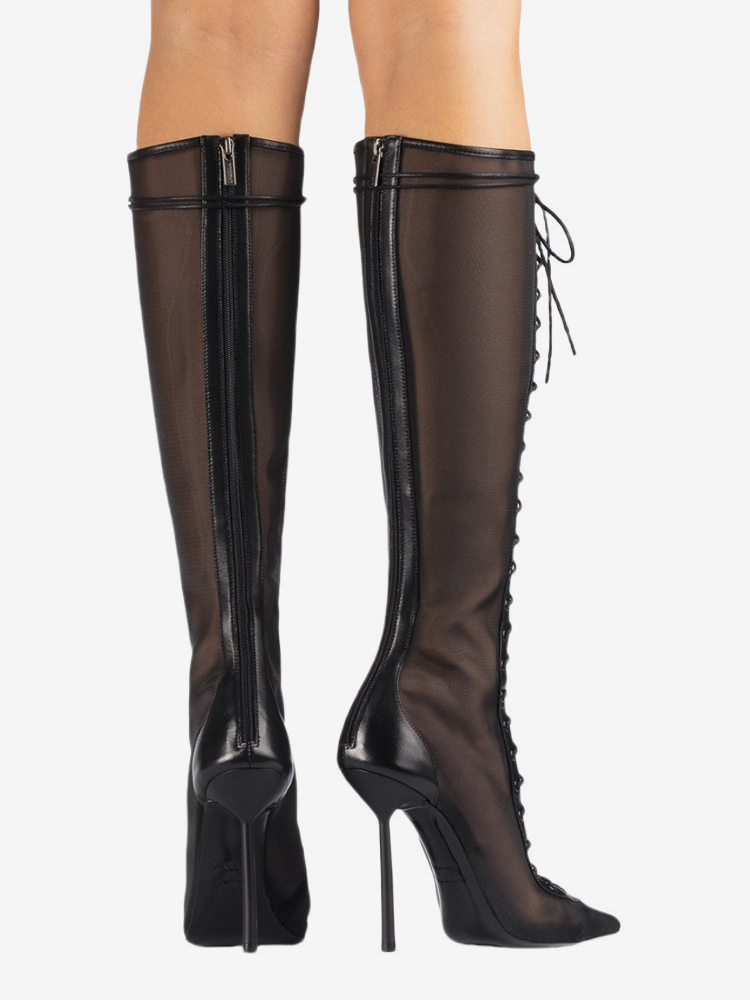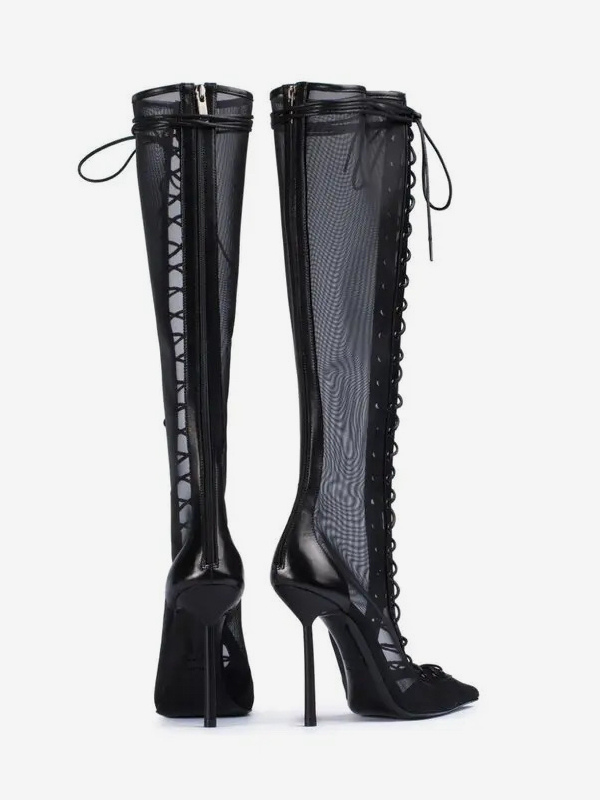 レディースニーハイブーツ メッシュ ポインテッドトゥ レースアップ ハイヒール サンダルブーツ