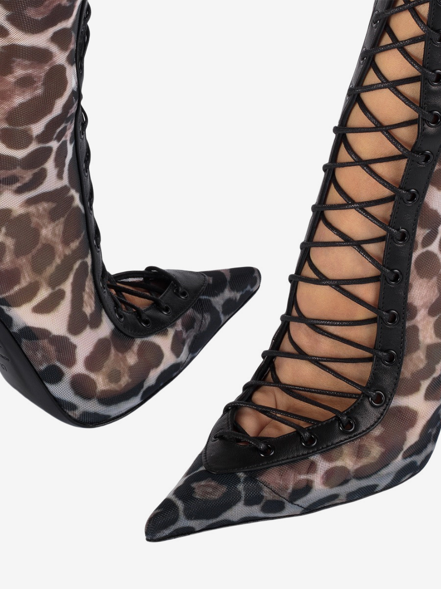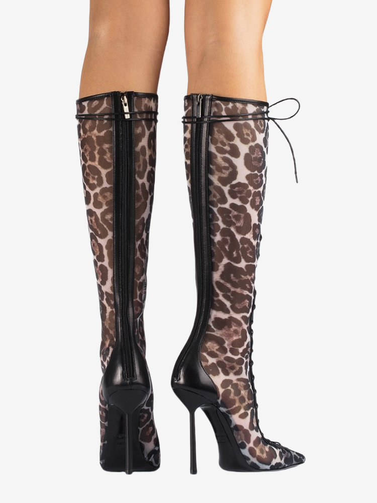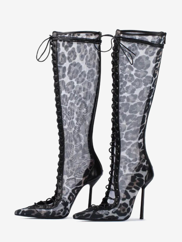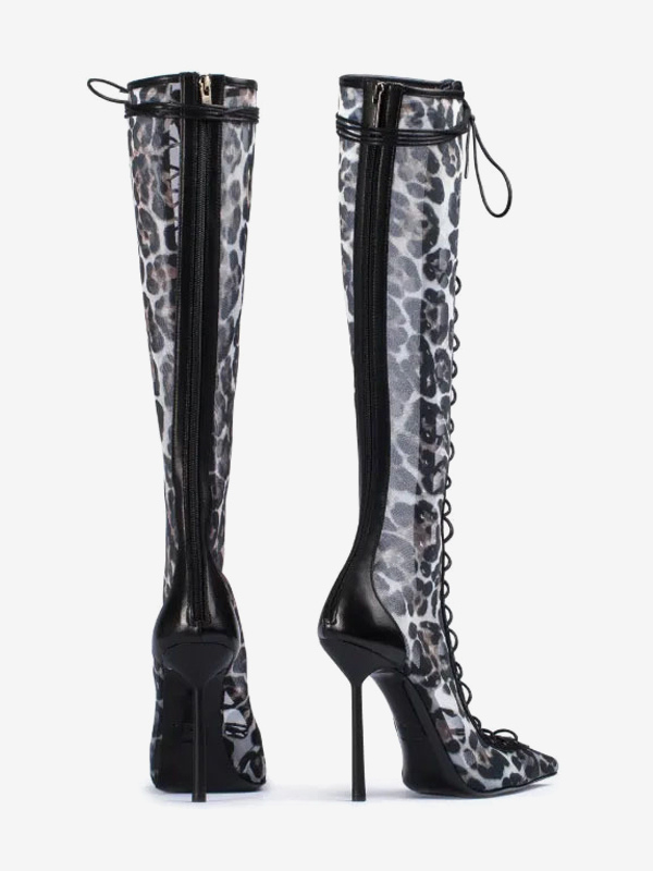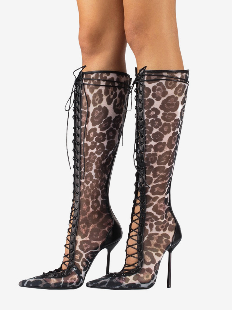 レディースニーハイブーツ メッシュ ポインテッドトゥ レースアップ ハイヒール サンダルブーツ