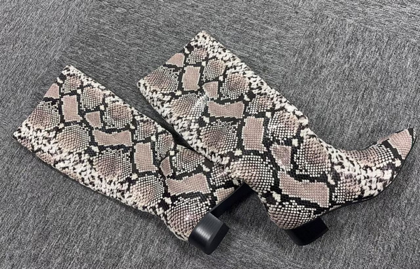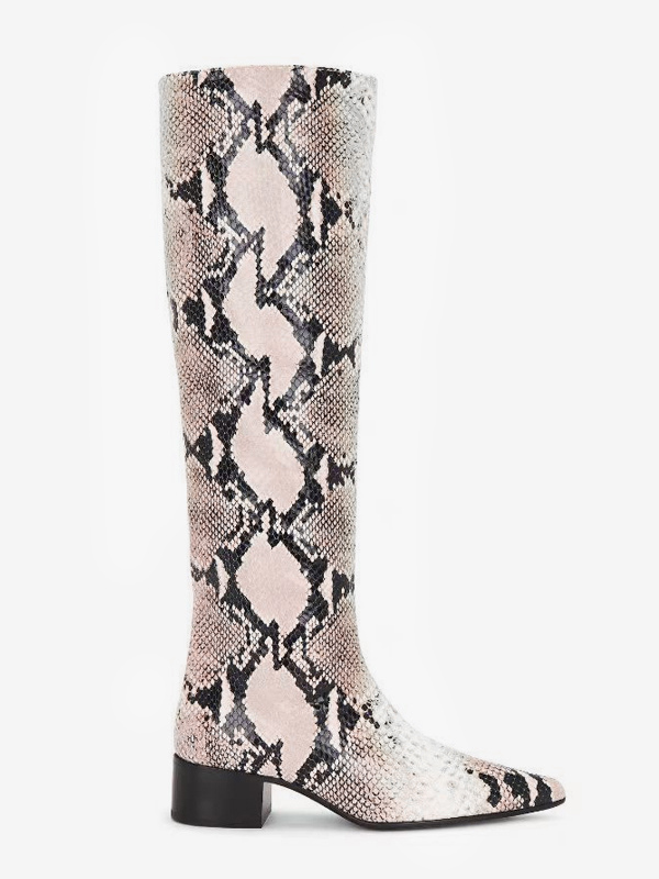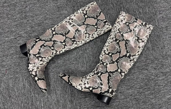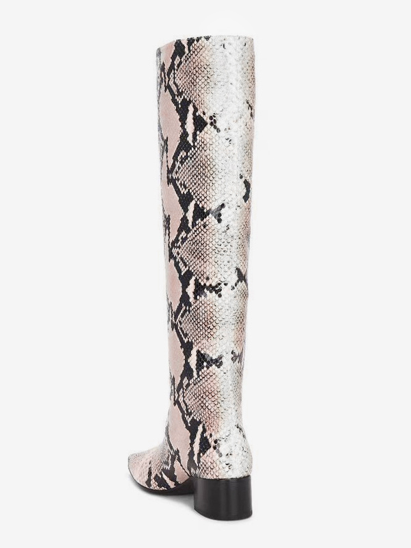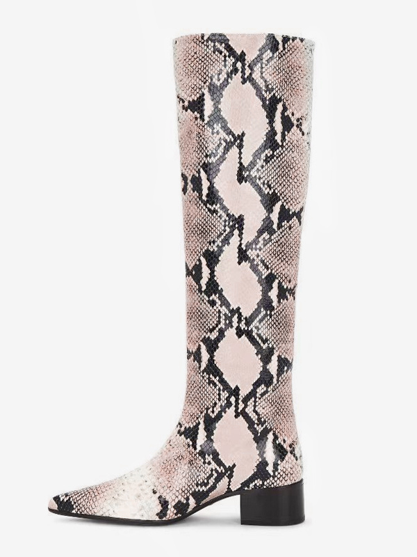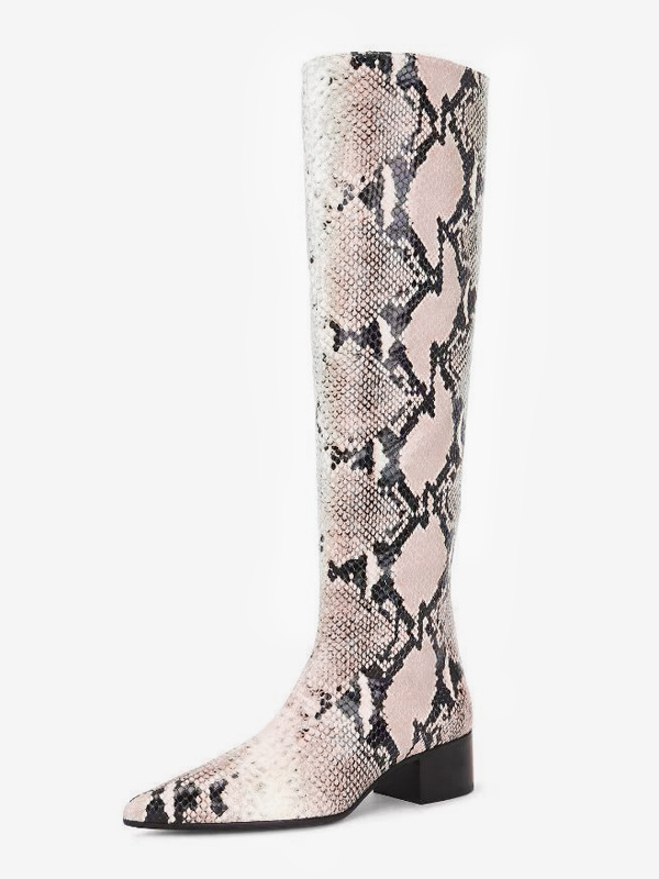 レディースニーハイブーツ ポインテッドトゥ スネーク柄 チャンキーヒールブーツ