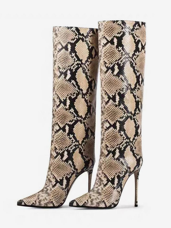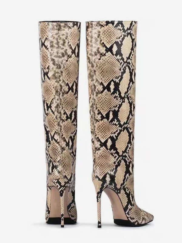 レディースニーハイブーツ スネーク柄 ポインテッドトゥ ハイヒールブーツ