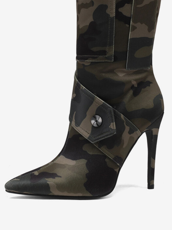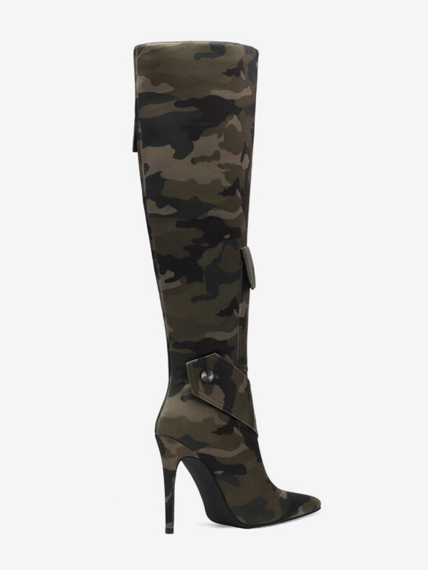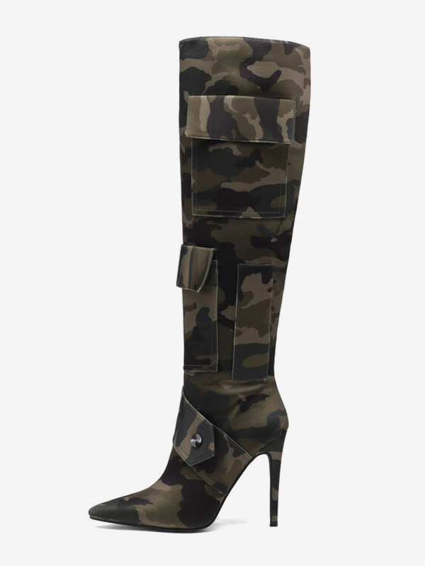レディースニーハイブーツ カモ柄プリントポケットリベットディテール ハイヒールブーツ