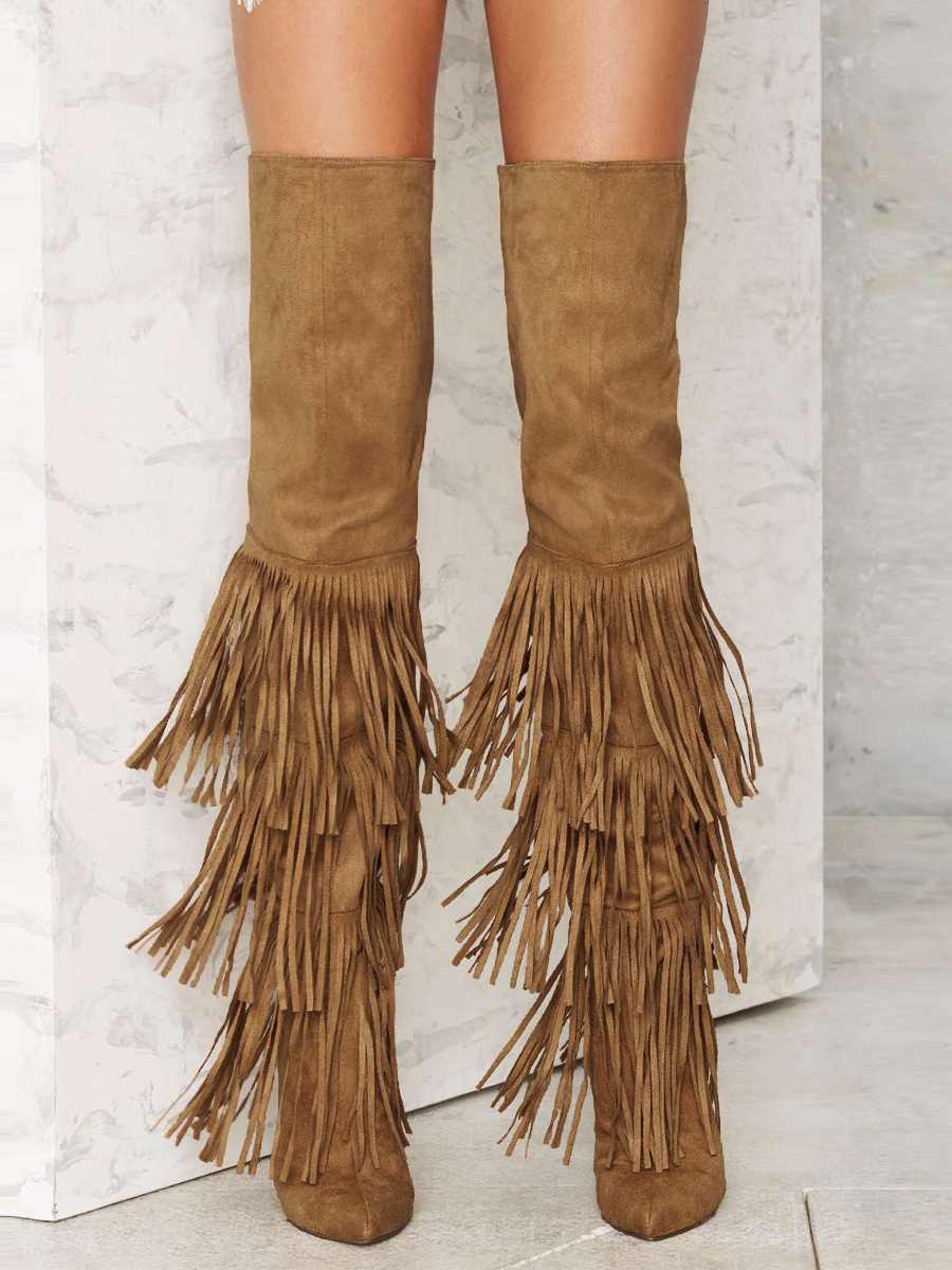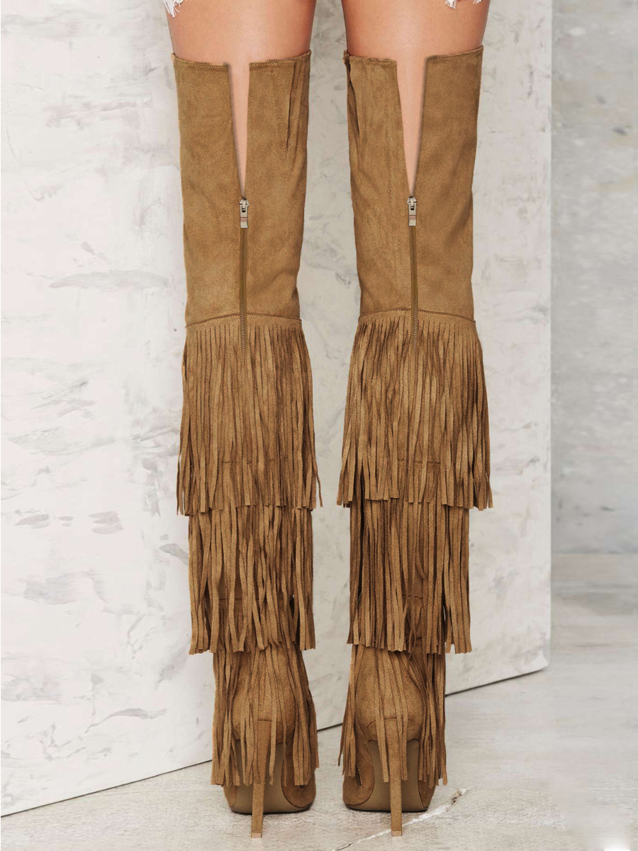 レディース スエード オーバーニーブーツ ポインテッドトゥ ハイヒール サイハイブーツ タッセル付き