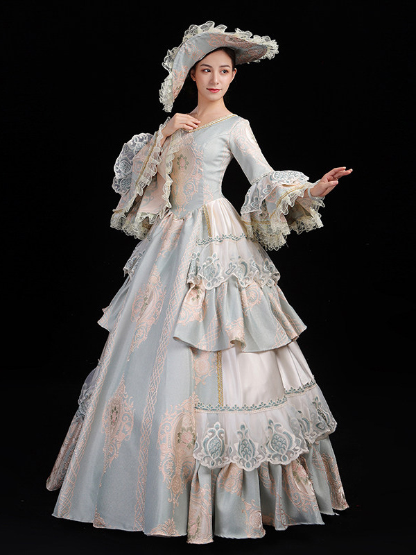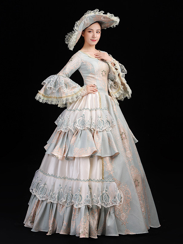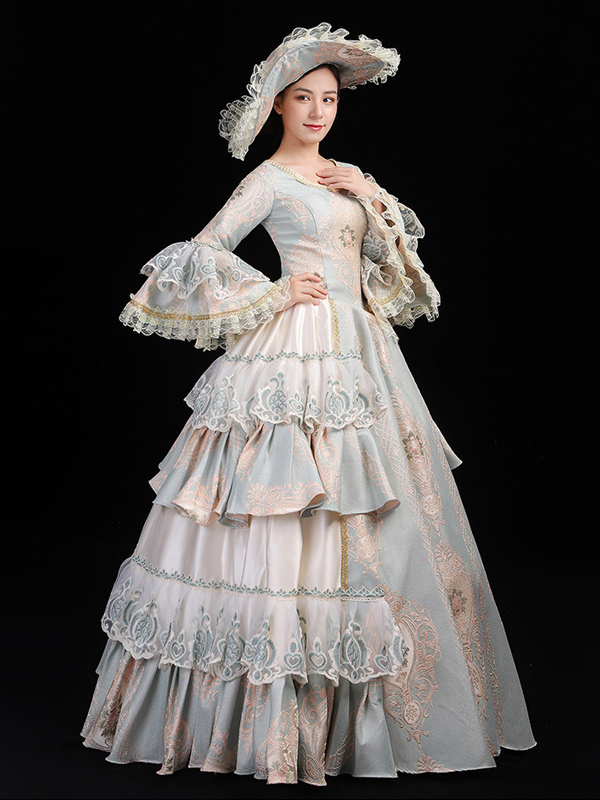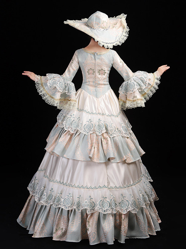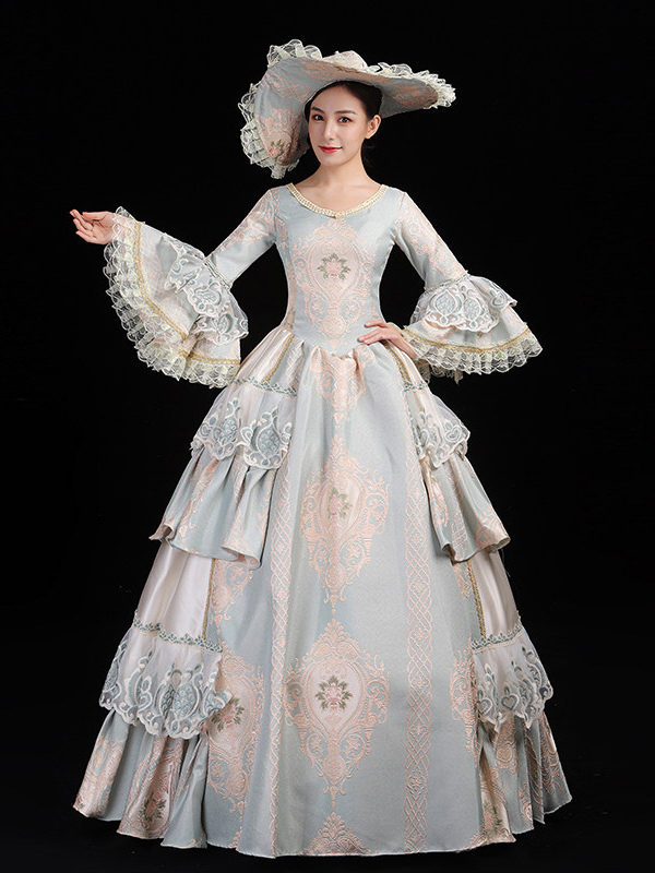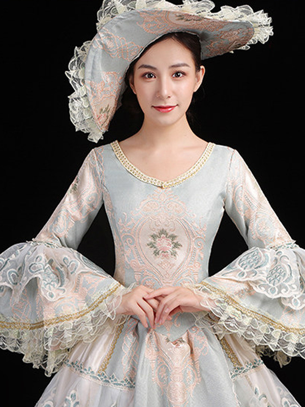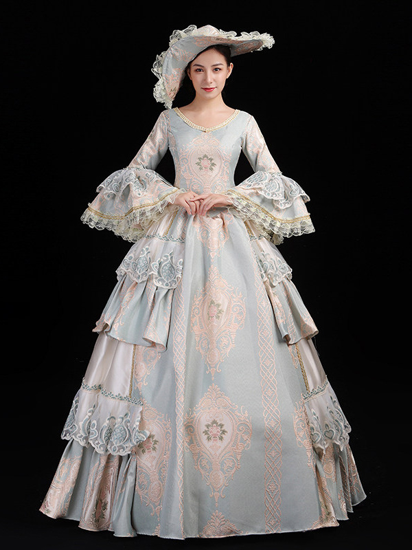 レディース ヴィンテージ ロココ ドレス レーストリム フレアスリーブ フリル ロング ボールガウン ドレス