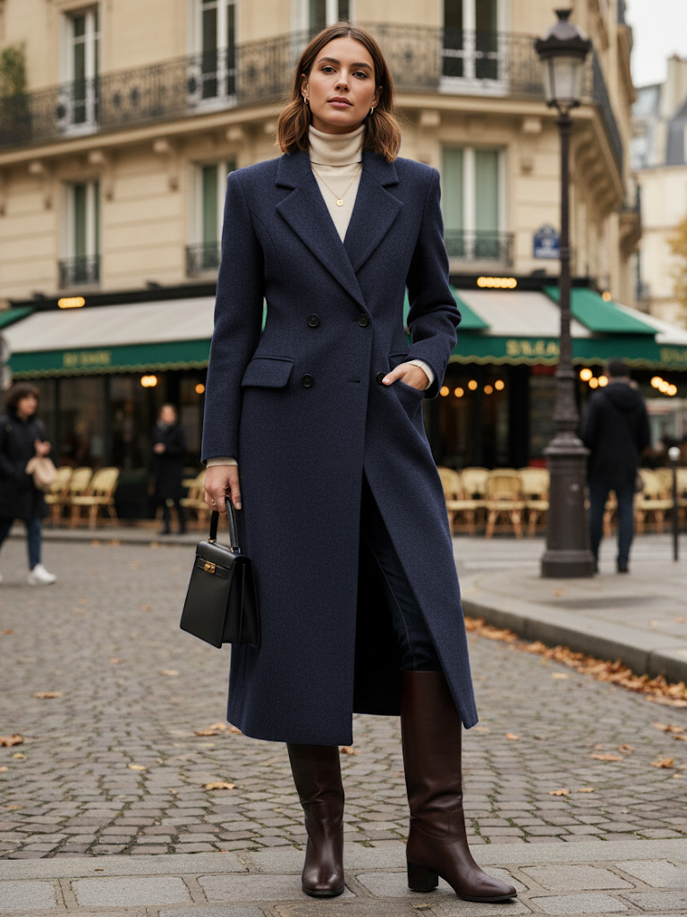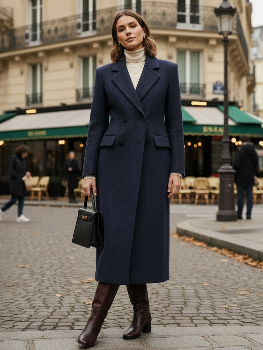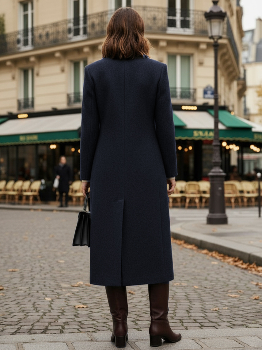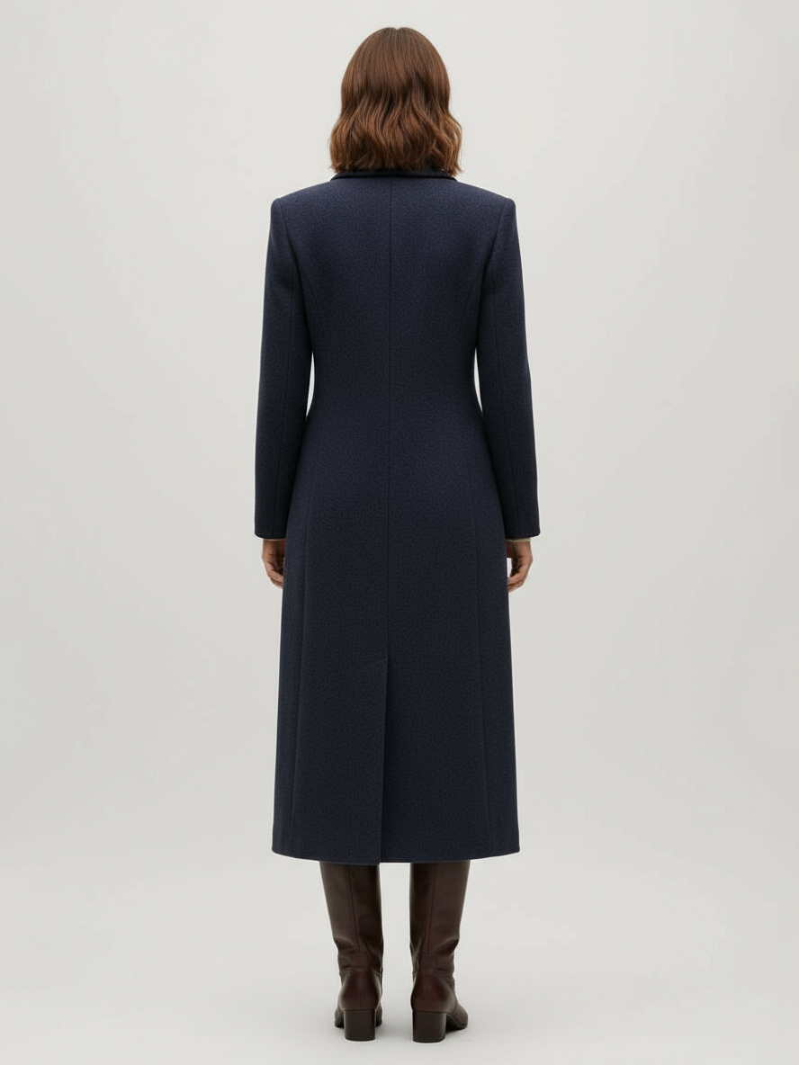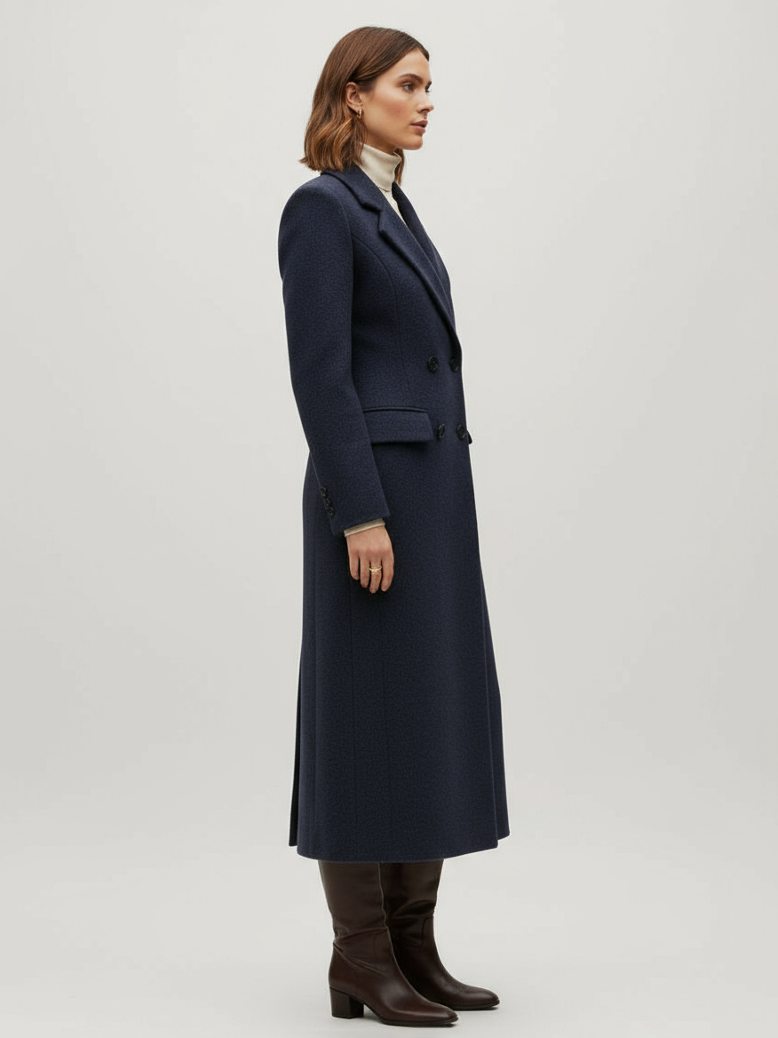 ノッチラペルとフラップポケット付きウールダブルブレストロングコート(レディース)2025