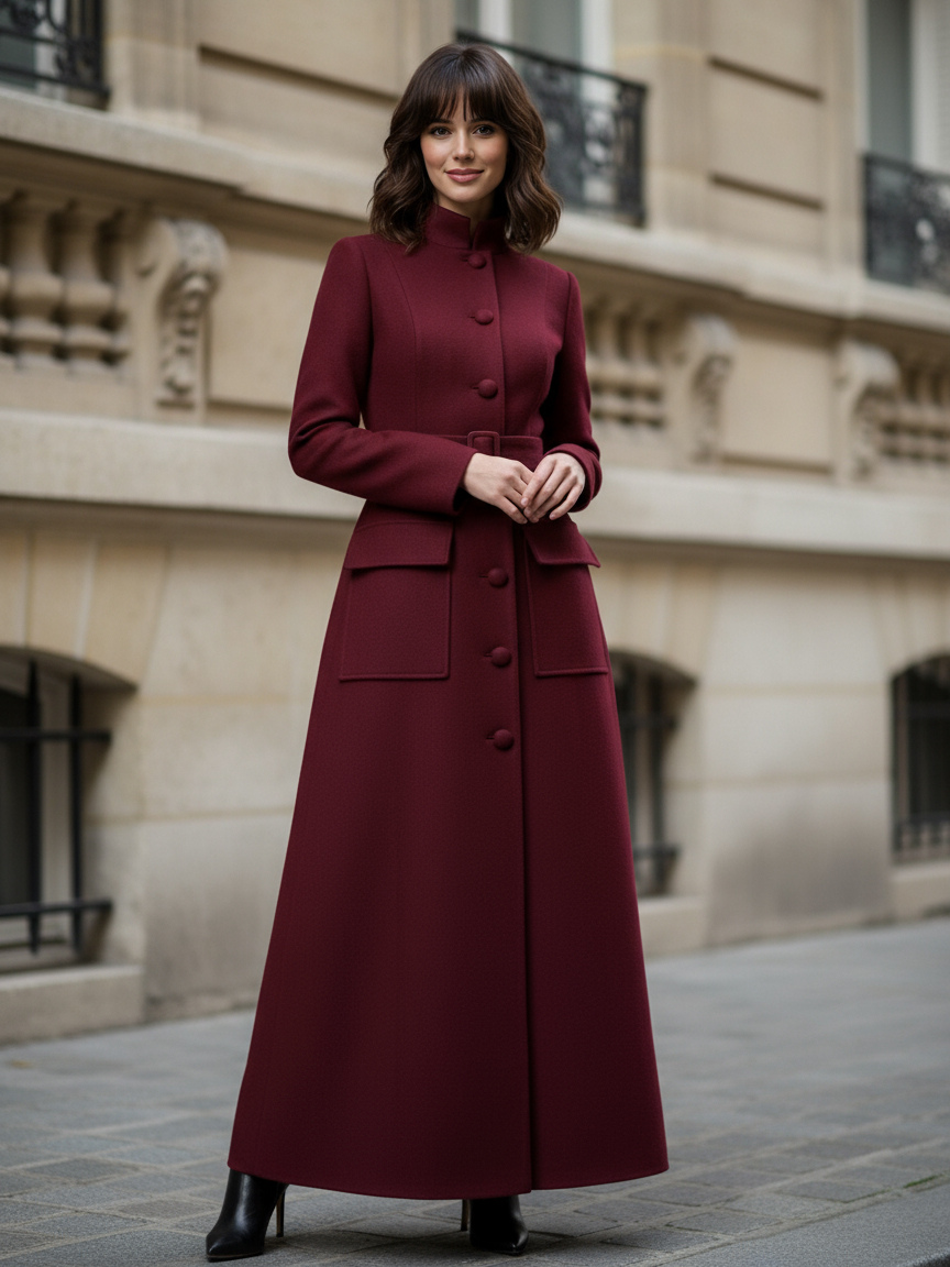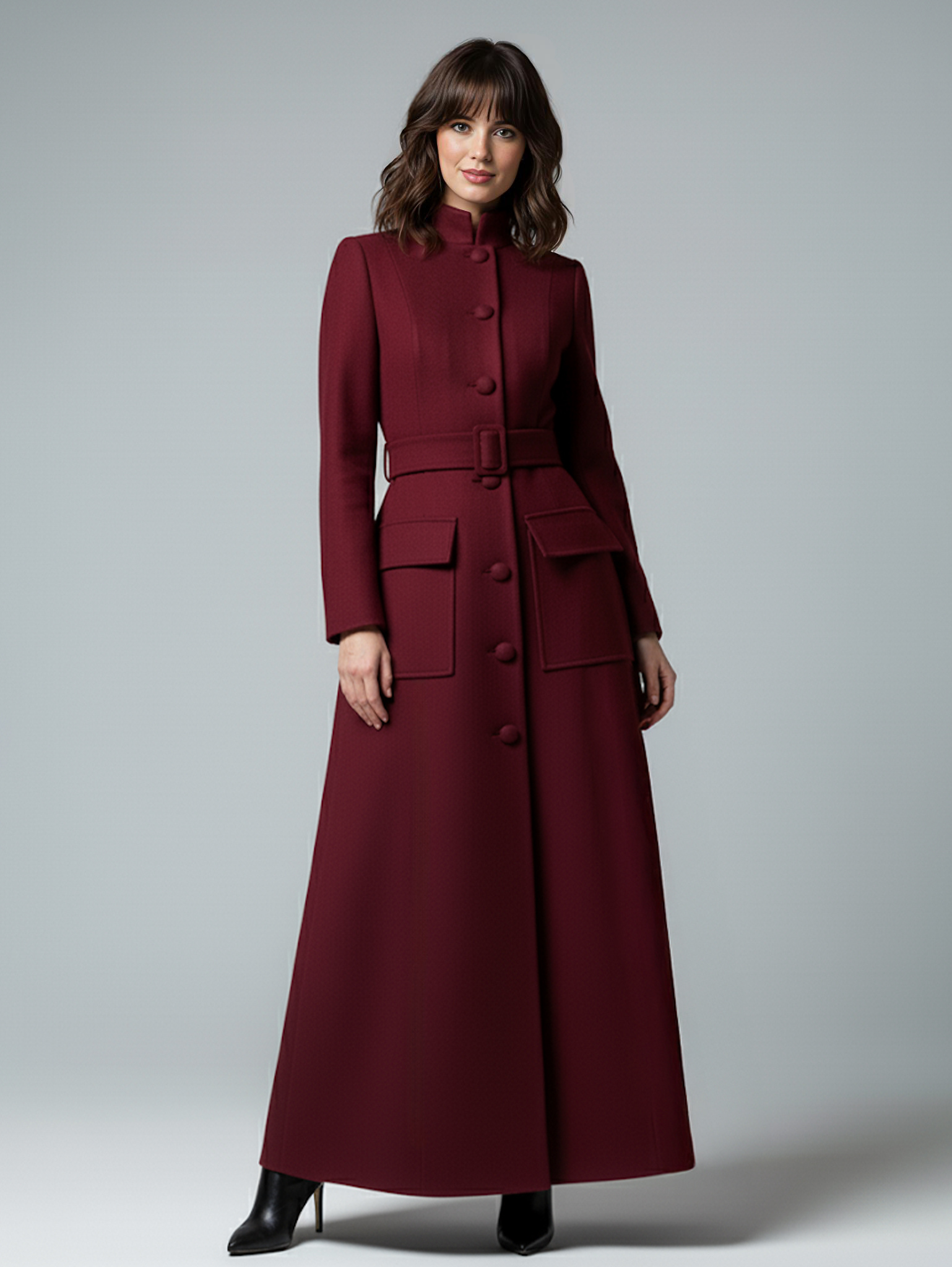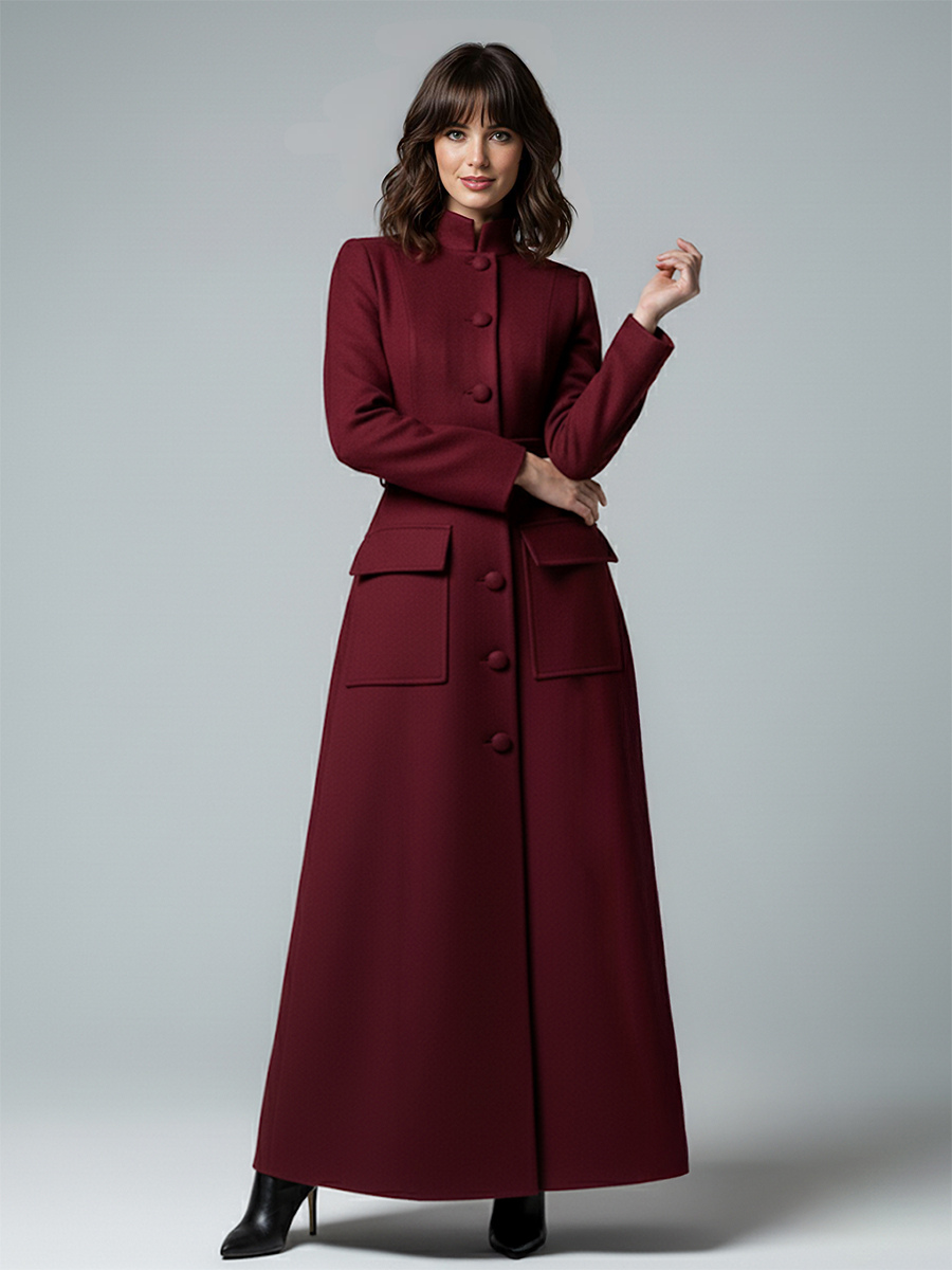スタンドカラーとフラップポケット付きウールのフルレングスマキシコート(レディース)2025